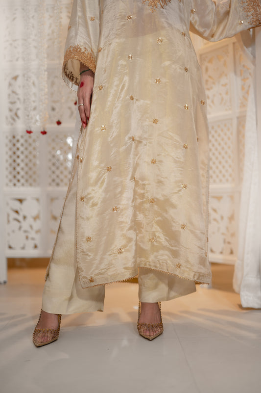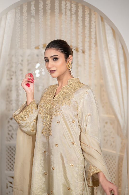 Navy Blue Satin phiran suit with tilla aari embroidery