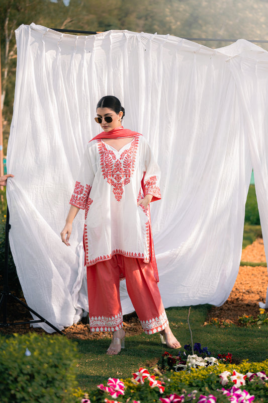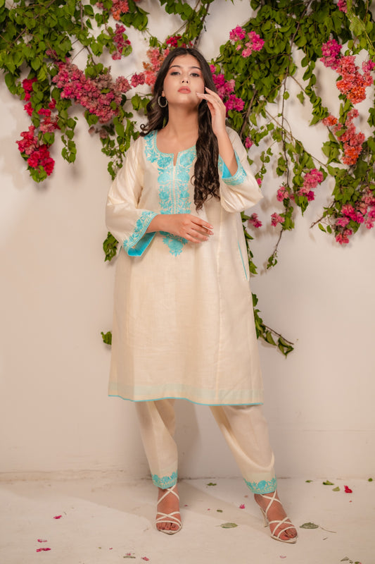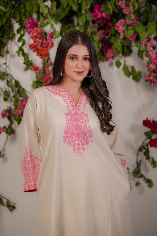 Off White Cotton Phiran Suit with Pink Aari Embroidery