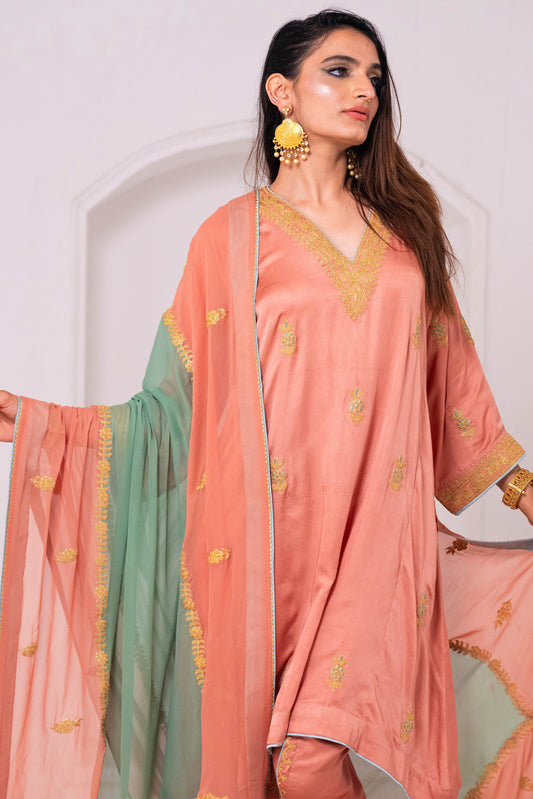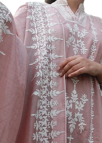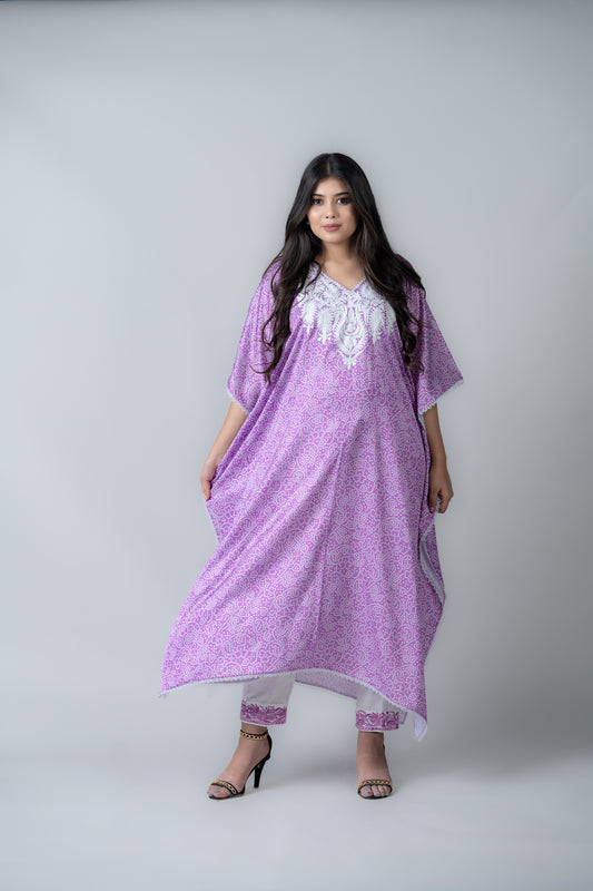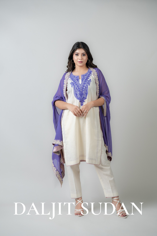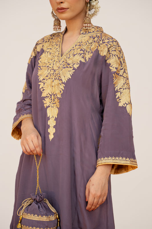 Powder Purple Crepe Aari Shoulder Set with Potli