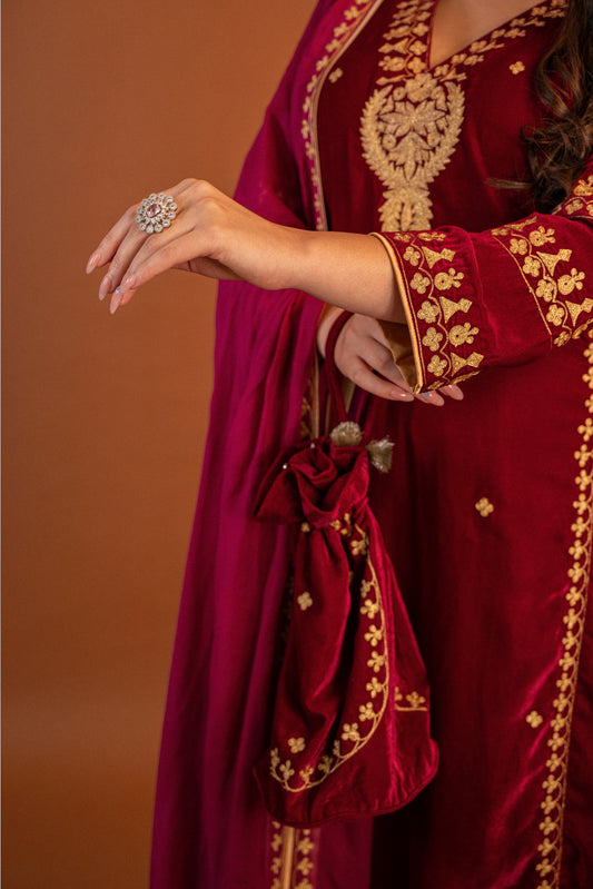 Reddish pink velvet aari tilla suit with potli