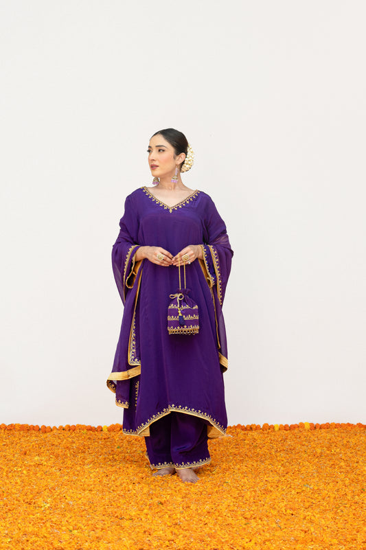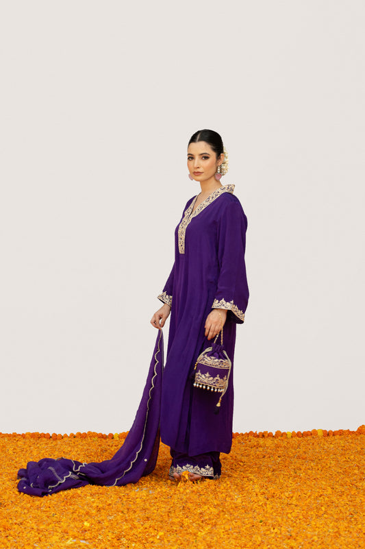 Dark Purple Crepe Tilla Minimal Suit with Potli