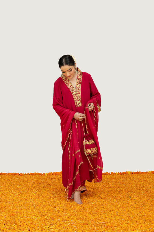 Cranberry Red Cotton Phiran Set With White Aari Embroidery