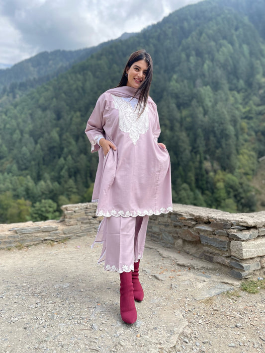 Lilac Cotton Phiran Suit with White Aari Embroidery