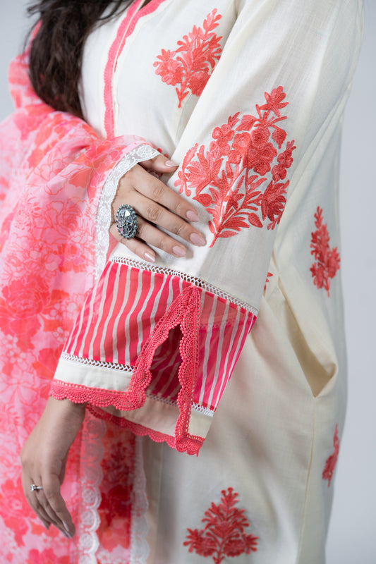 Aurora Pink Cotton Phiran Set With White Aari Embroidery
