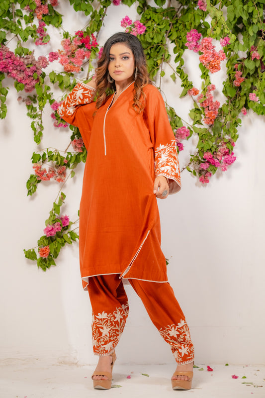 Rust Cotton Phiran and Salwar With White Aari Embroidery