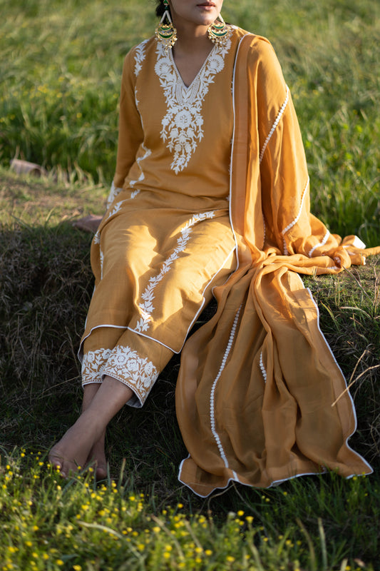 Mustard Yellow Cotton Suit with White Aari Embroidery