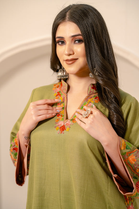 Olive Green Cotton Phiran Set With Multicolour Aari Embroidery