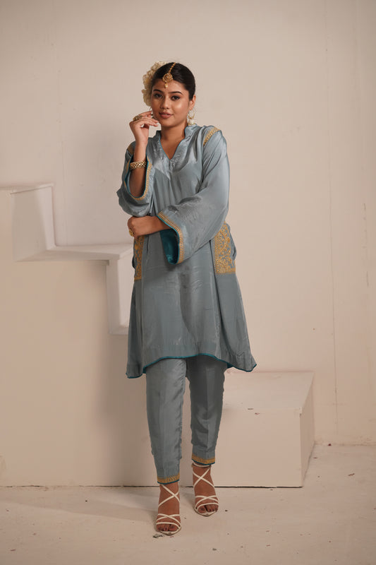 Grey Cotton Phiran Set With Grey Aari Embroidery