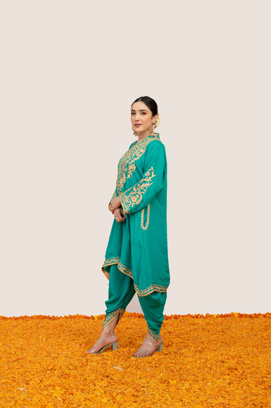 Teal Blue Crepe Aari Tilla Suit With Round Sleeves