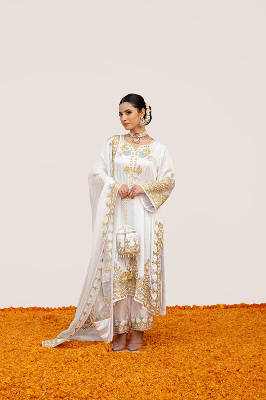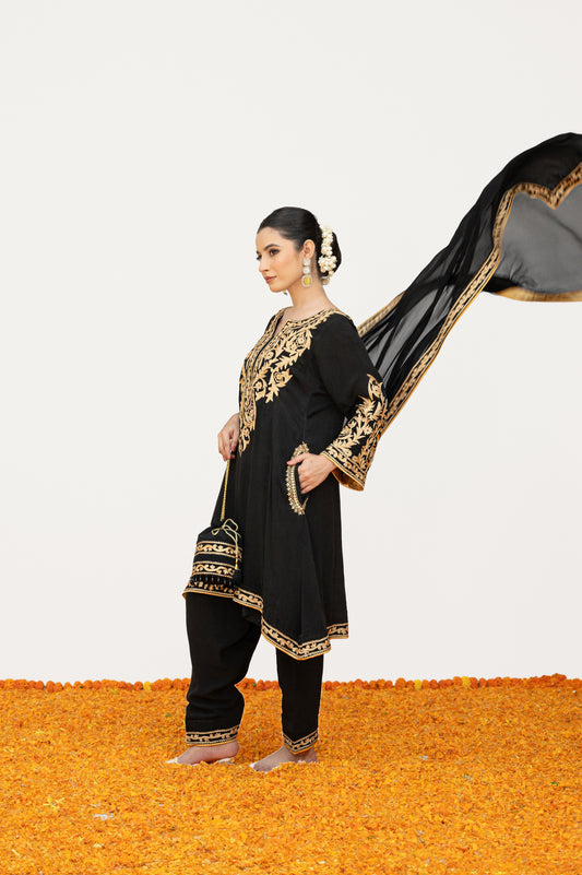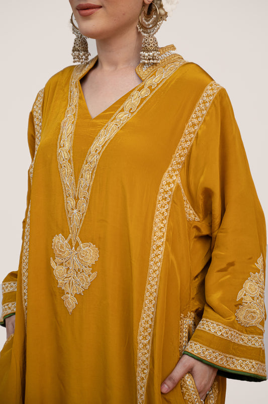 Mustard Olive Green Crepe Tilla Suit with Potli