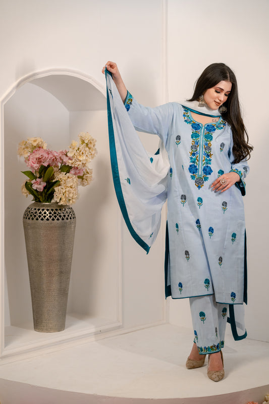 Light Blue Cotton Suit with Multicolour Aari Embroidery
