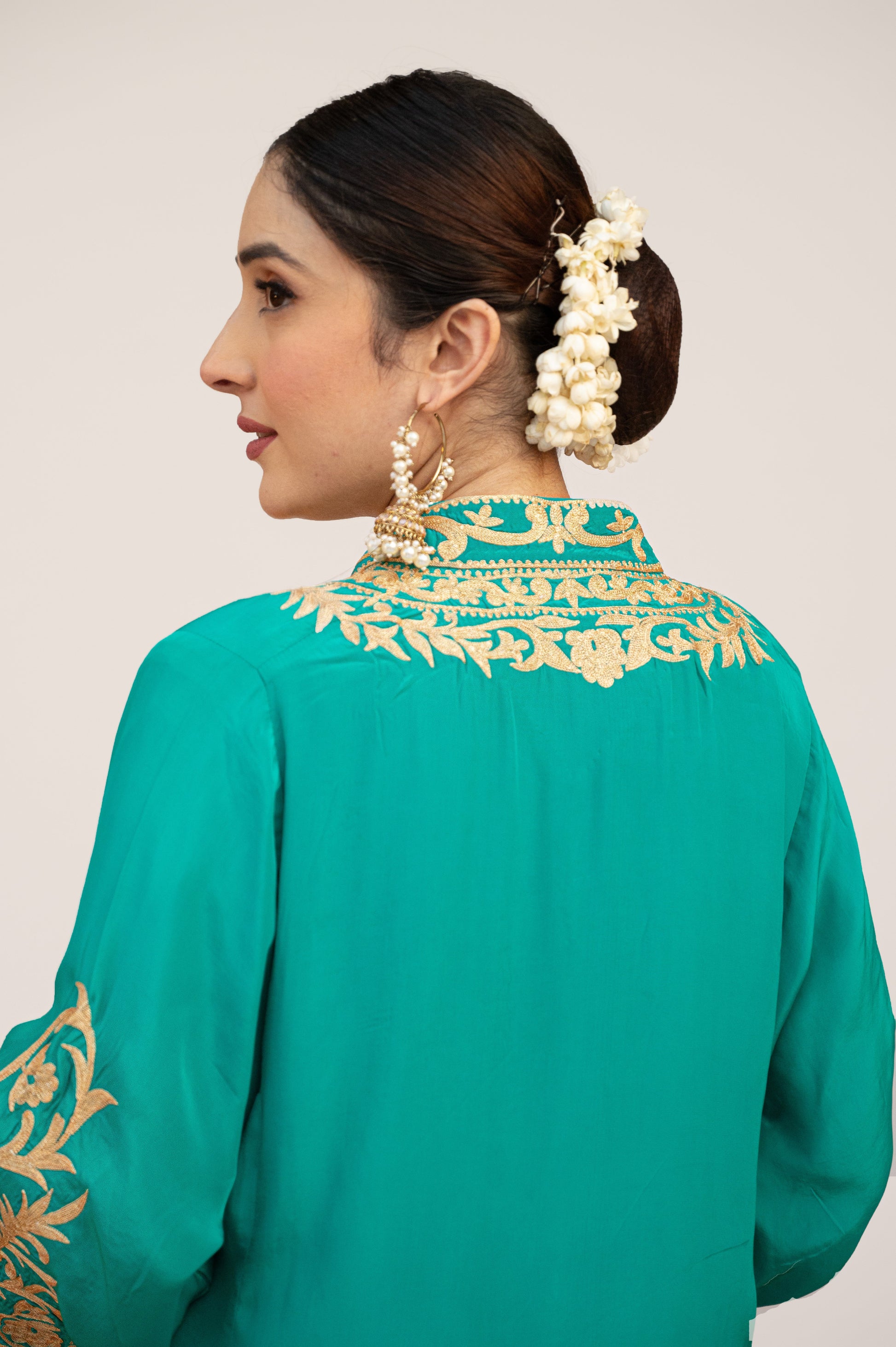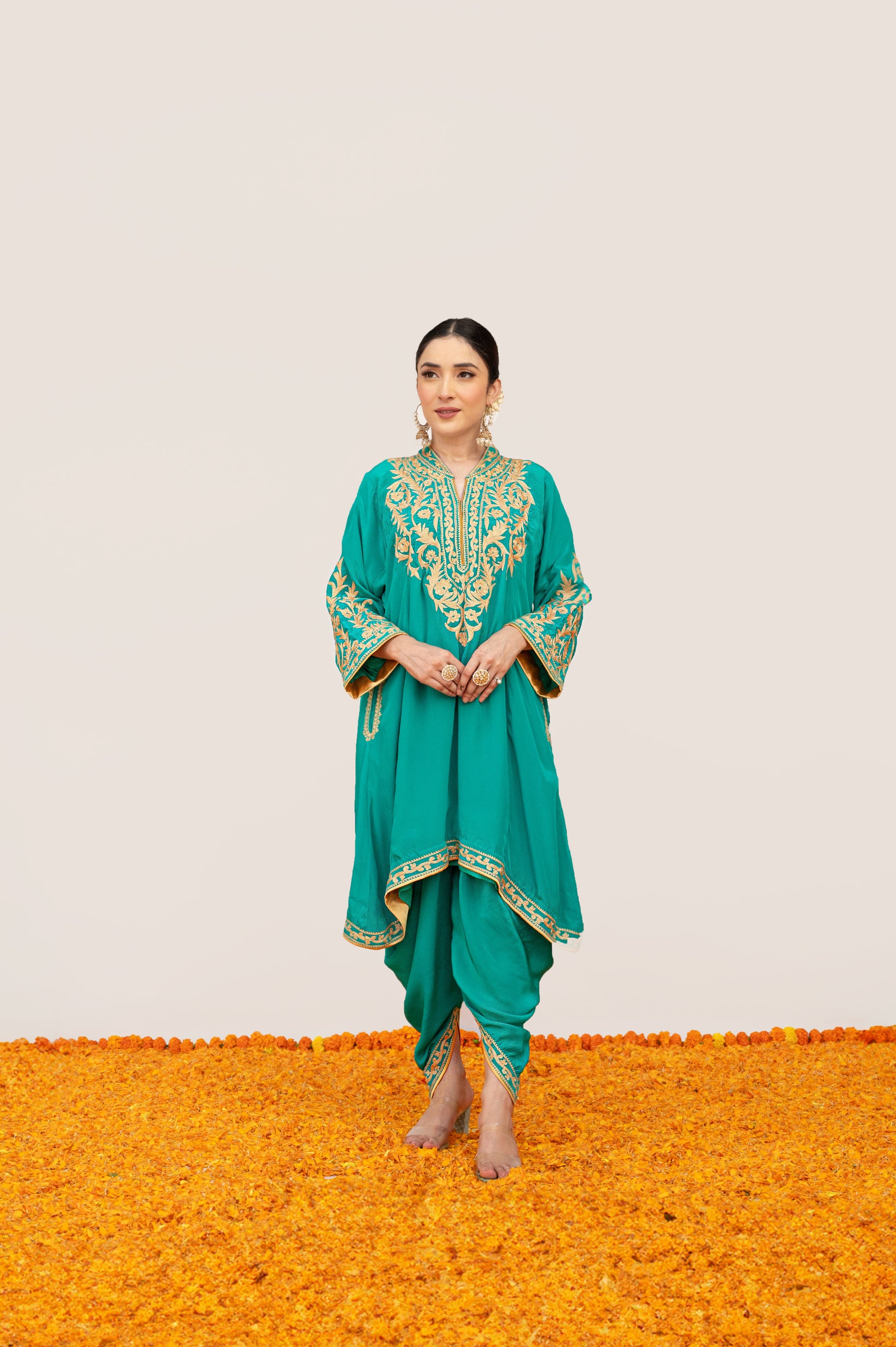 Elevate your wardrobe with our stunning Teal Blue set, crafted in premium crepe fabric and adorned with intricate Aari Tilla embroidery. Paired with an embellished Potli, this ensemble exudes elegance and luxury, making it a perfect choice for special occasions.