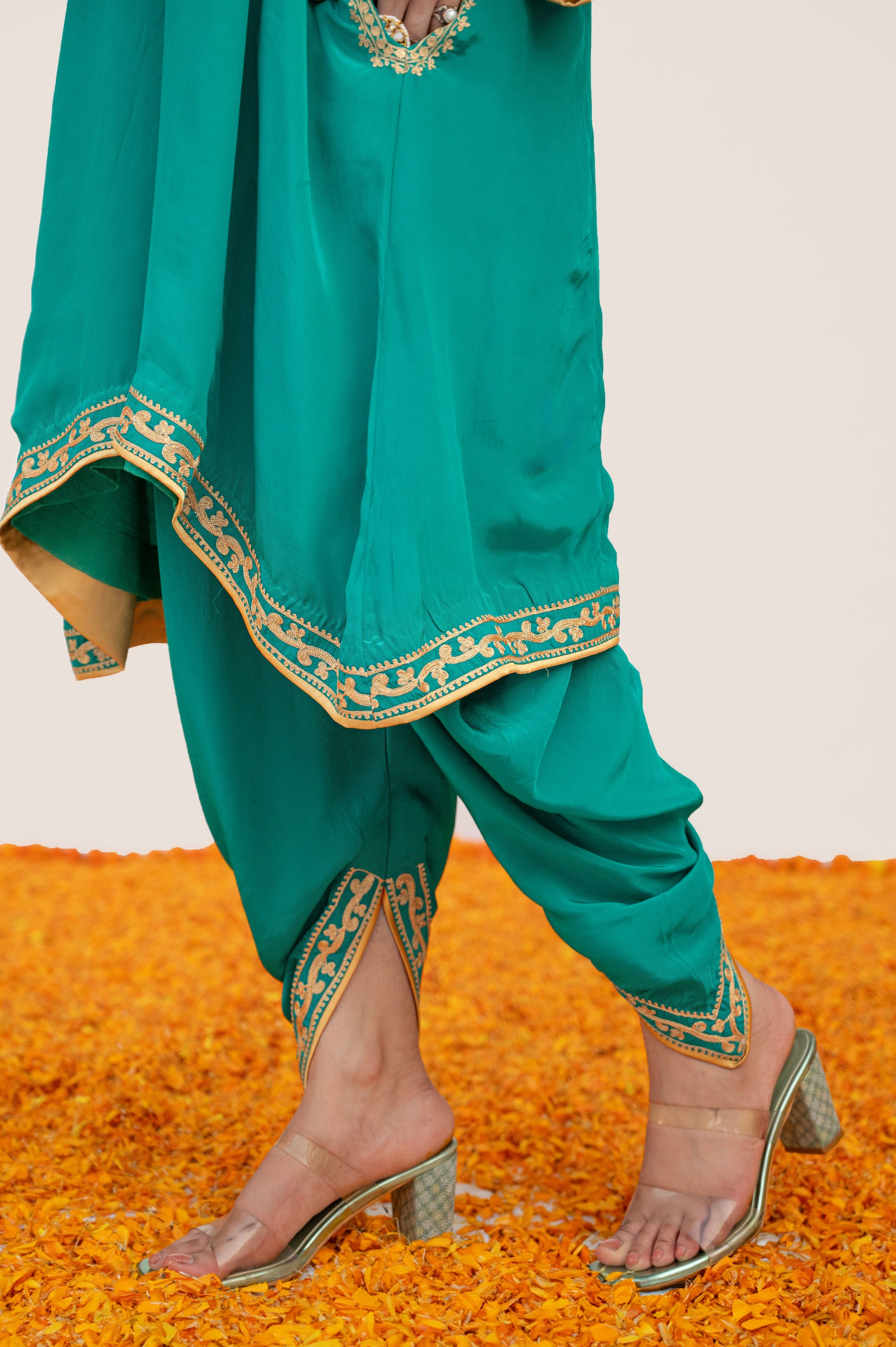 Elevate your wardrobe with our stunning Teal Blue set, crafted in premium crepe fabric and adorned with intricate Aari Tilla embroidery. Paired with an embellished Potli, this ensemble exudes elegance and luxury, making it a perfect choice for special occasions.