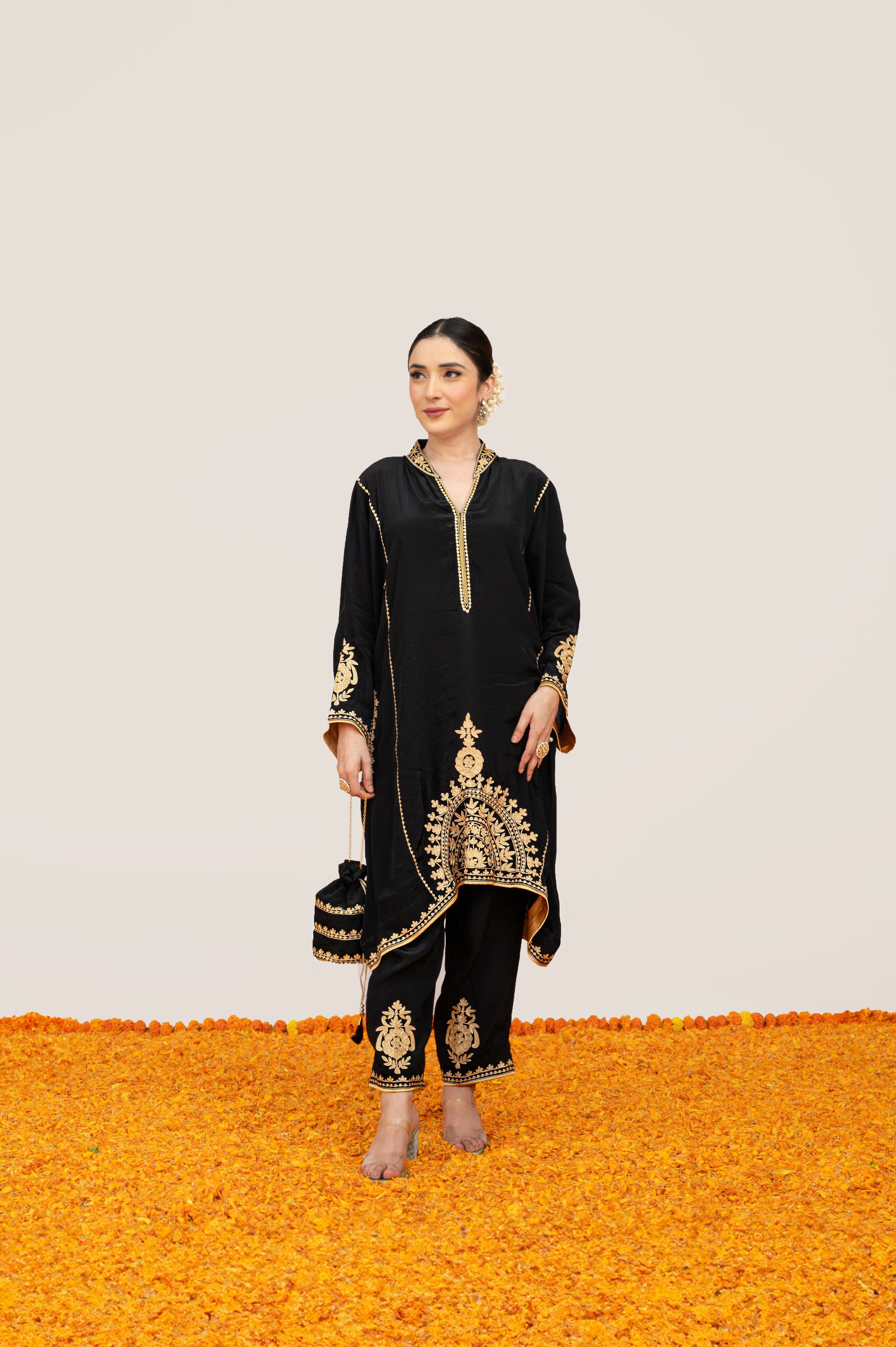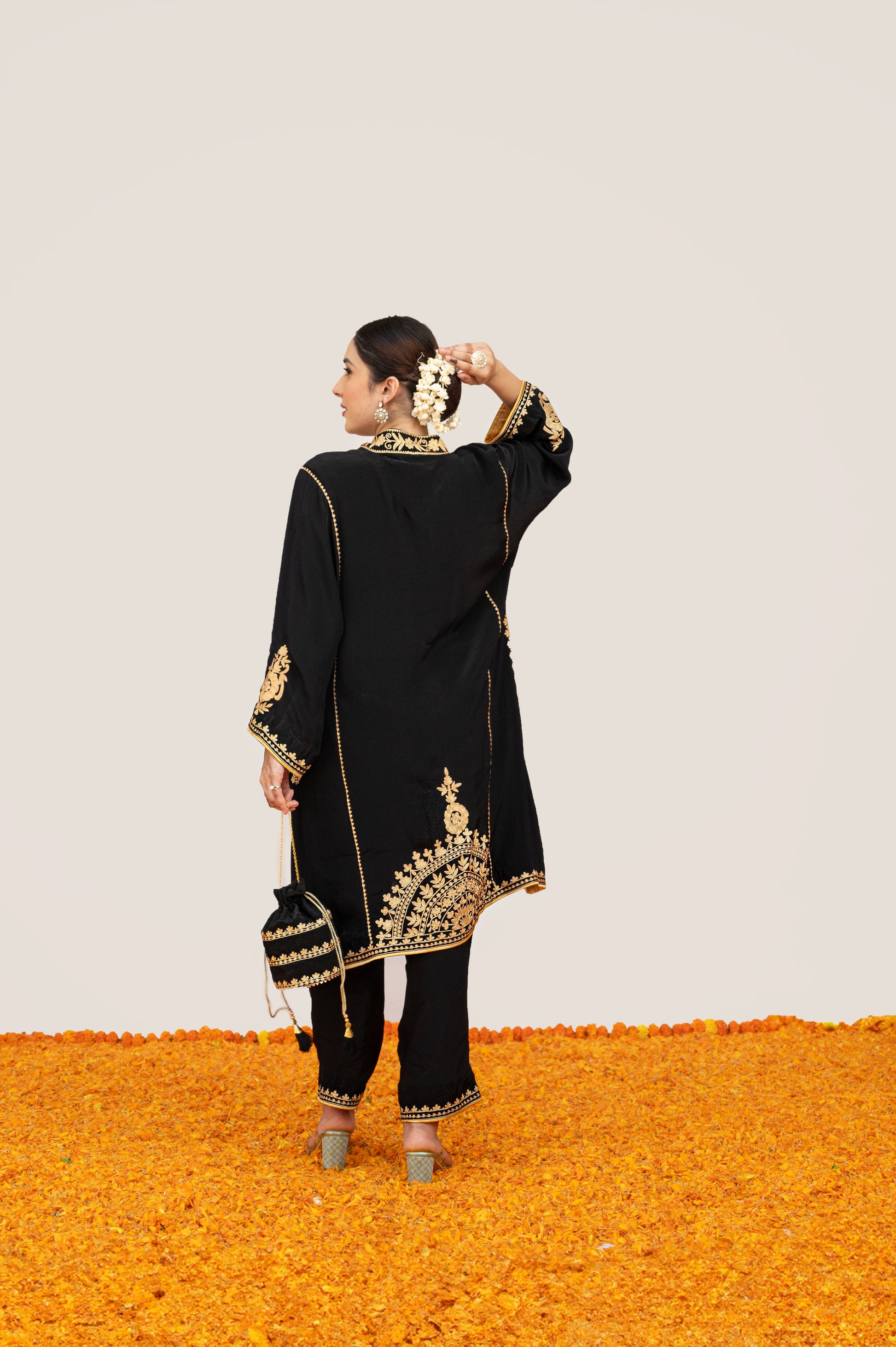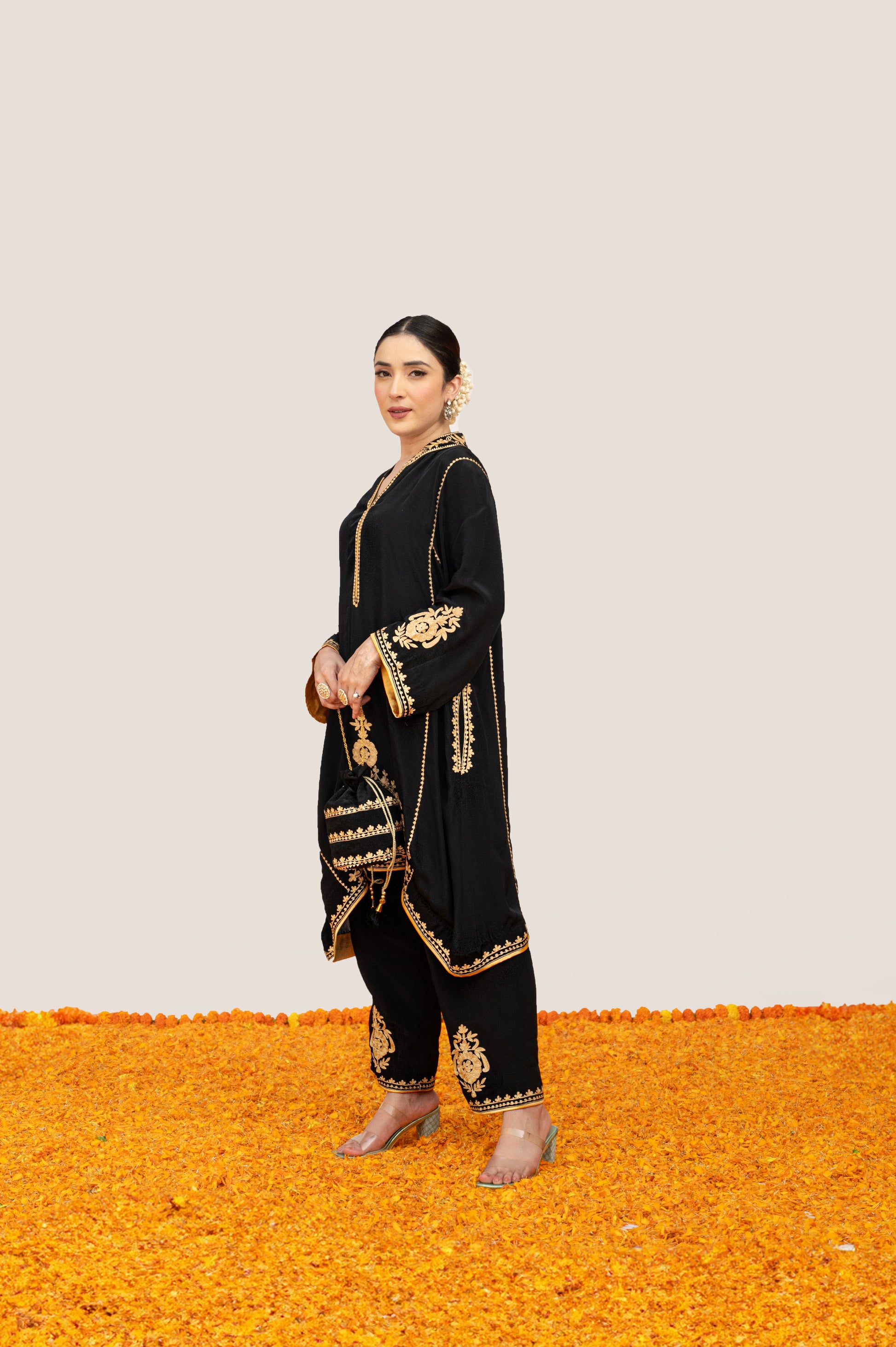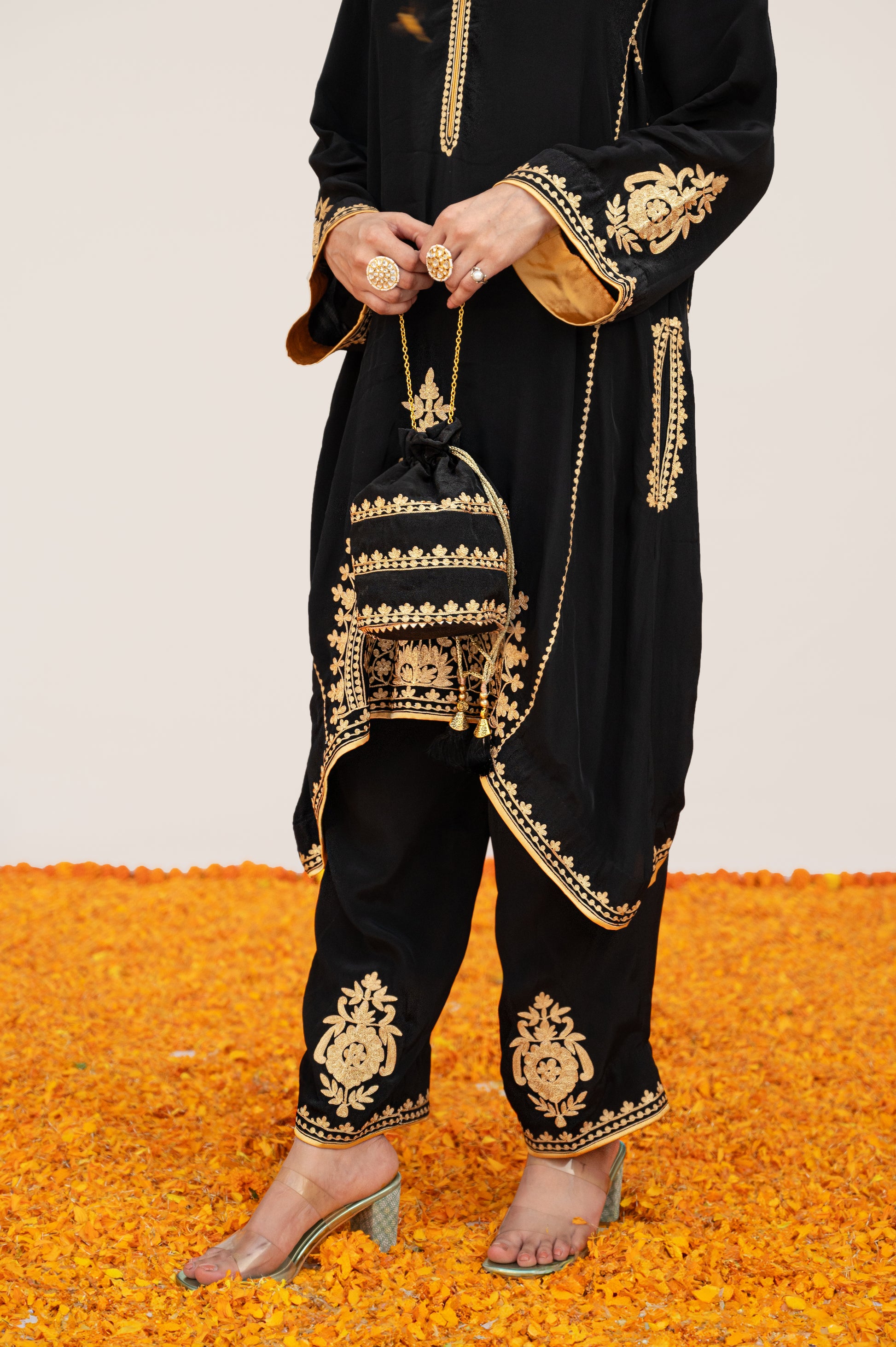 Elevate your wardrobe with our stunning Black set, crafted in premium crepe fabric and adorned with intricate Aari Tilla embroidery. Paired with an embellished Potli, this ensemble exudes elegance and luxury, making it the perfect choice for special occasions.
