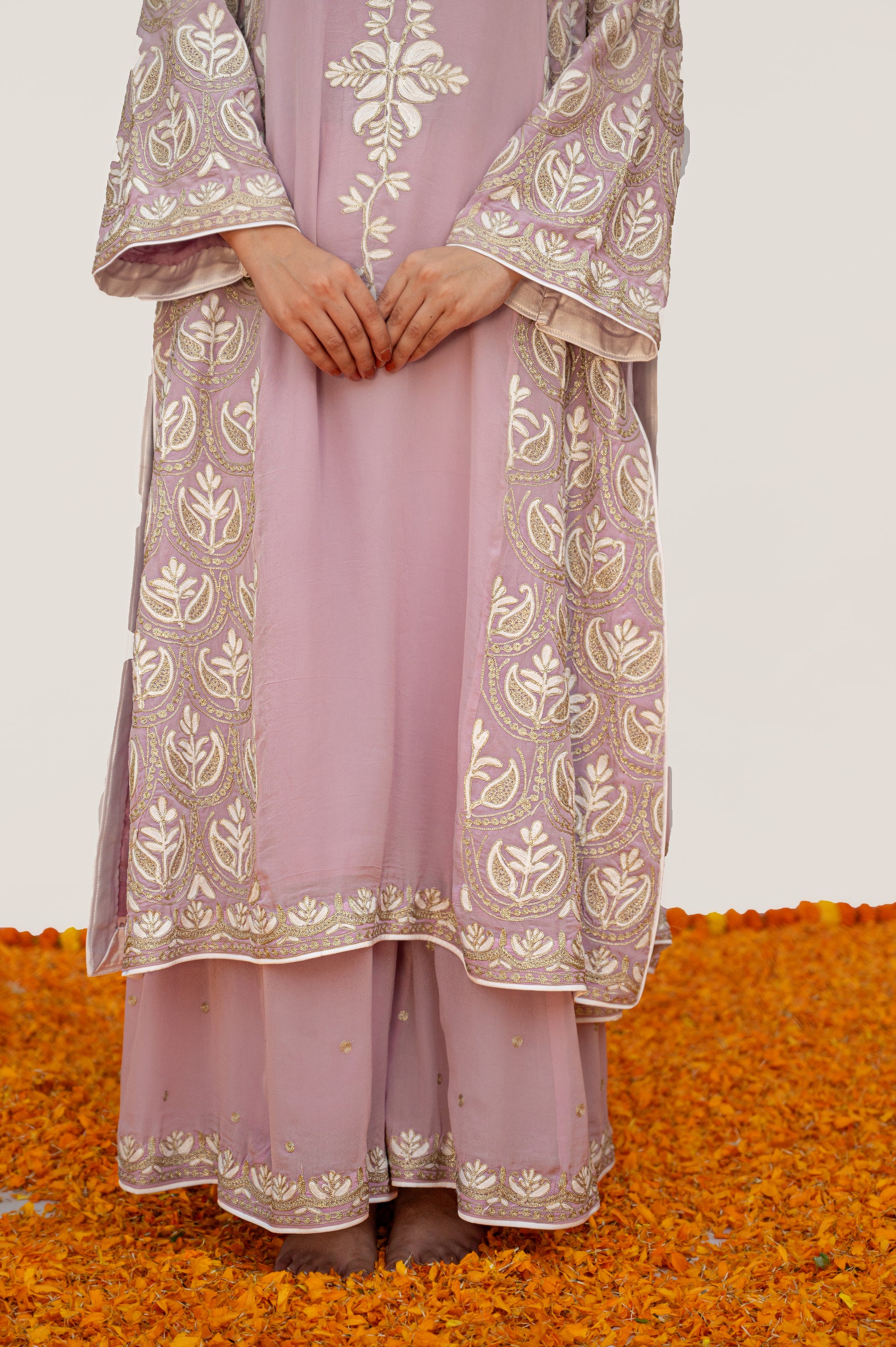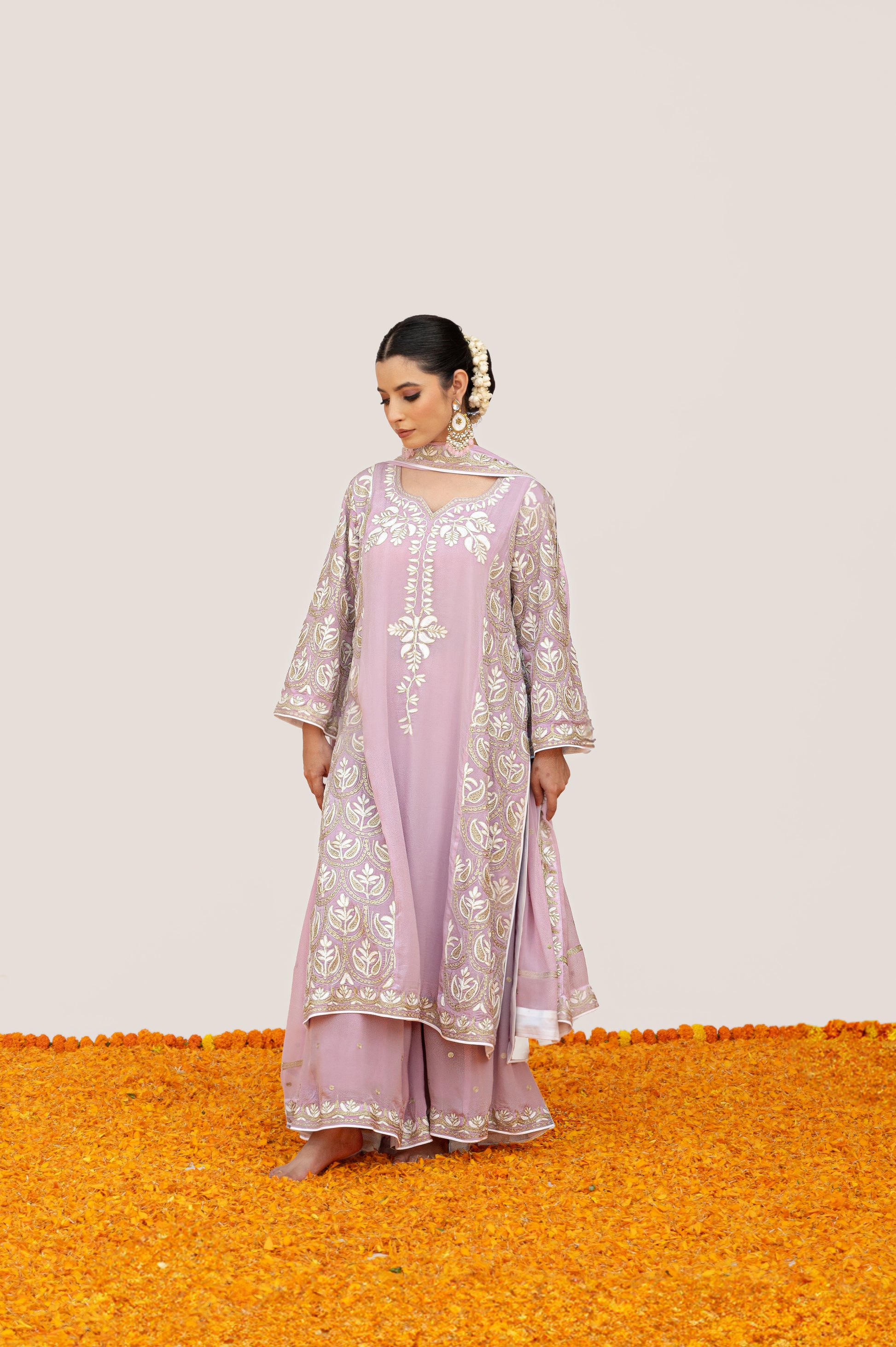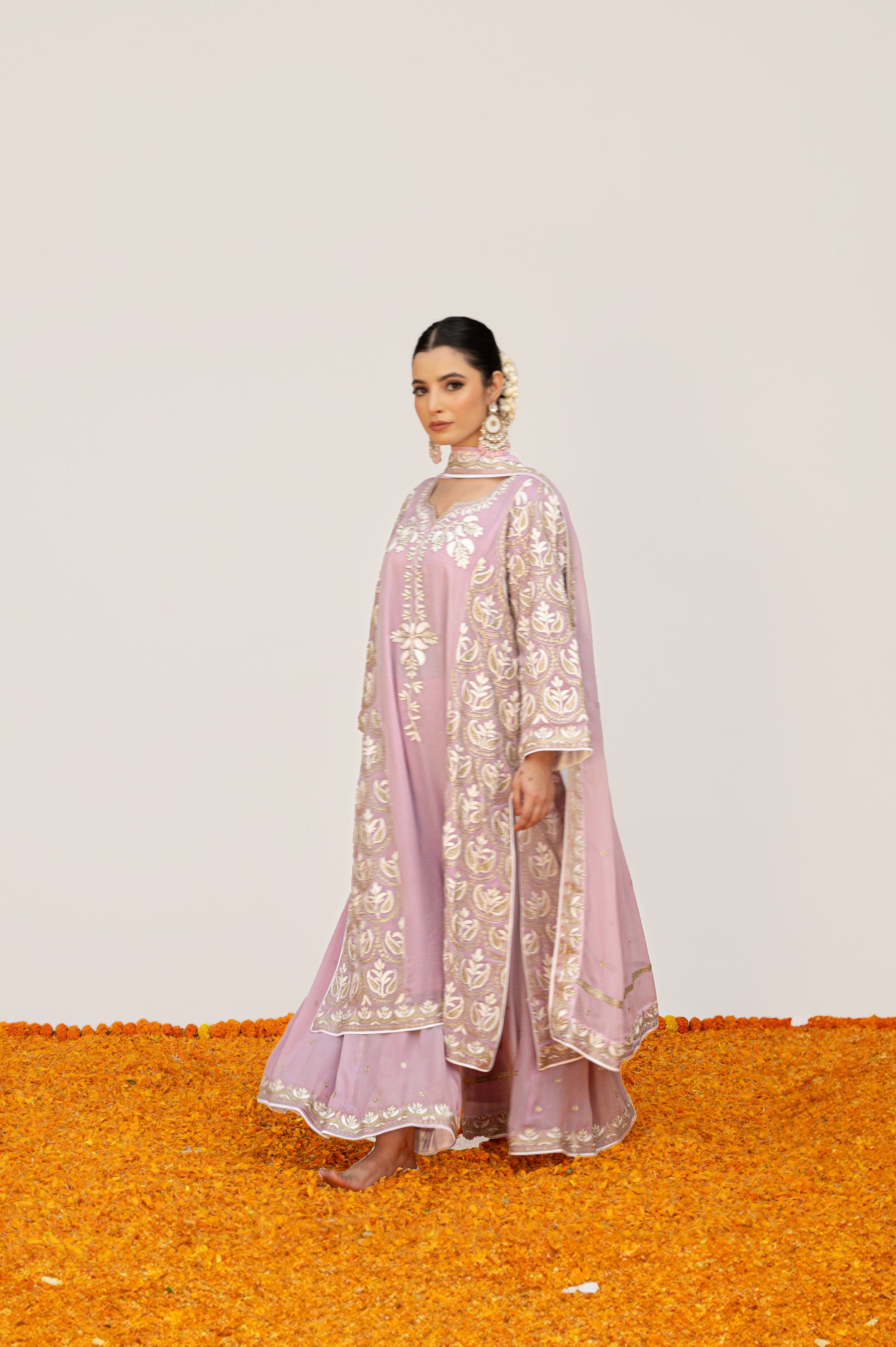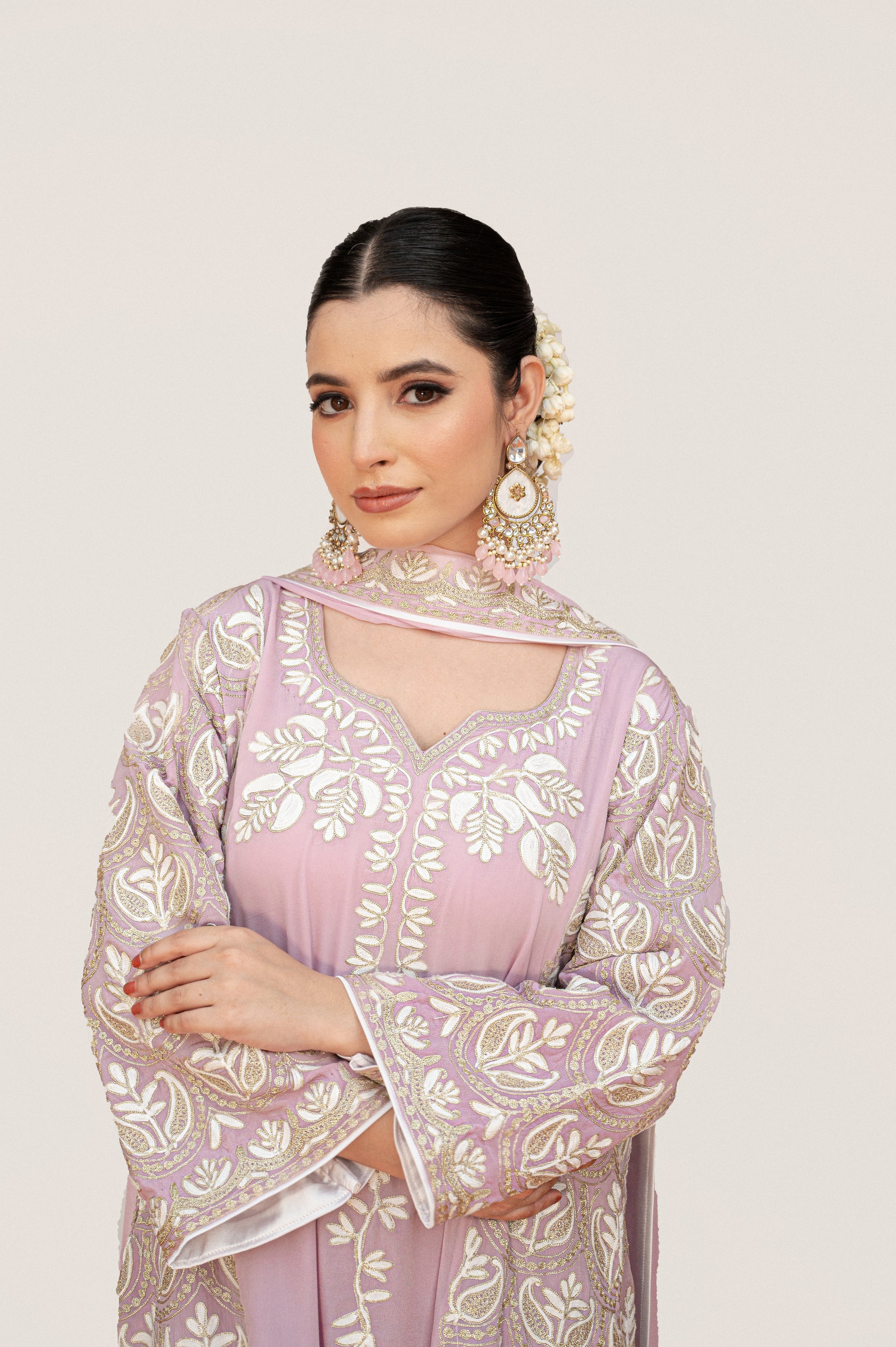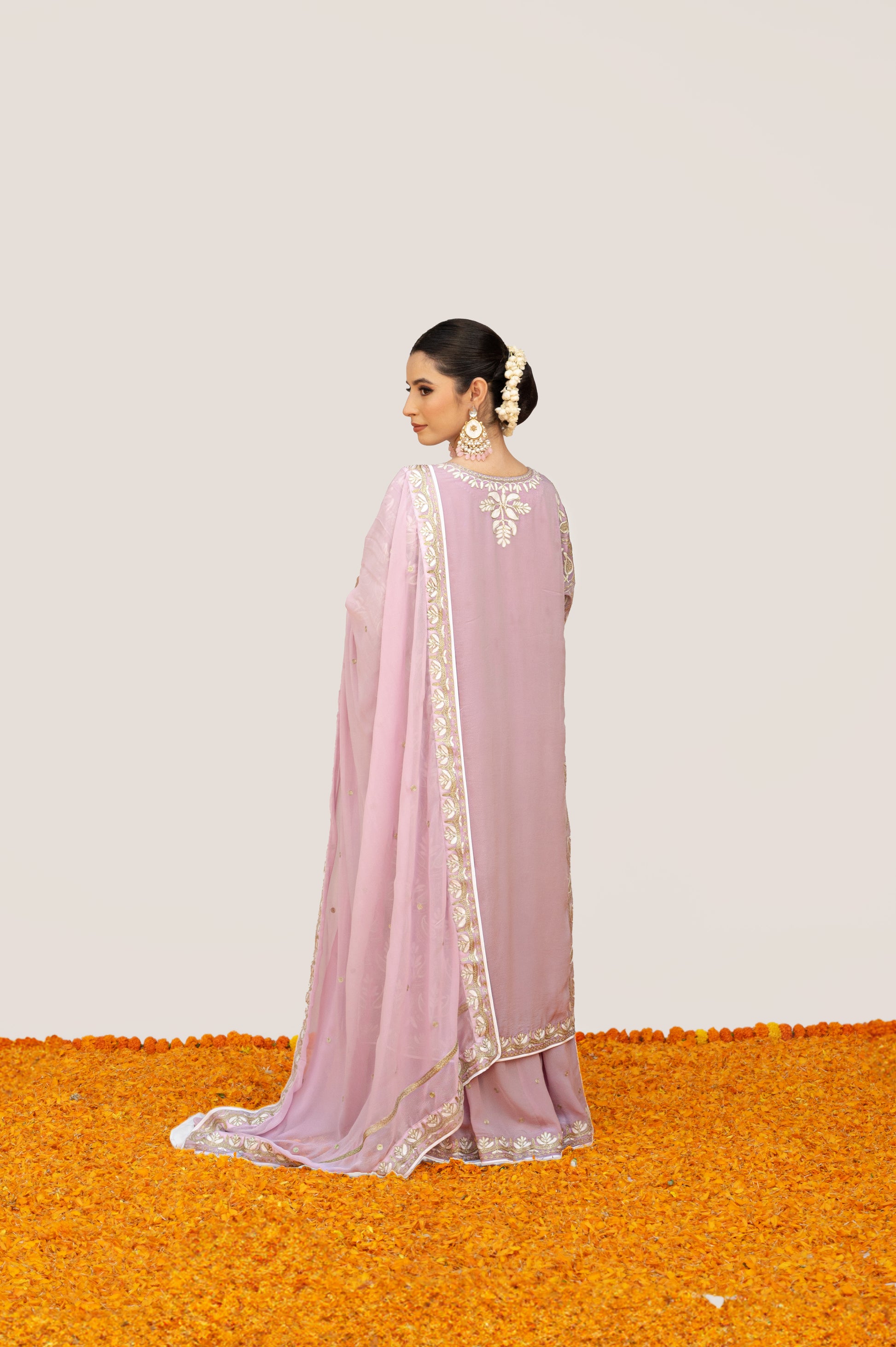Elevate your wardrobe with our stunning Light Pink suit, crafted in premium crepe fabric and adorned with intricate Aari Tilla embroidery. Paired with an embellished Potli, this ensemble exudes elegance and luxury, making it a perfect choice for special occasions.