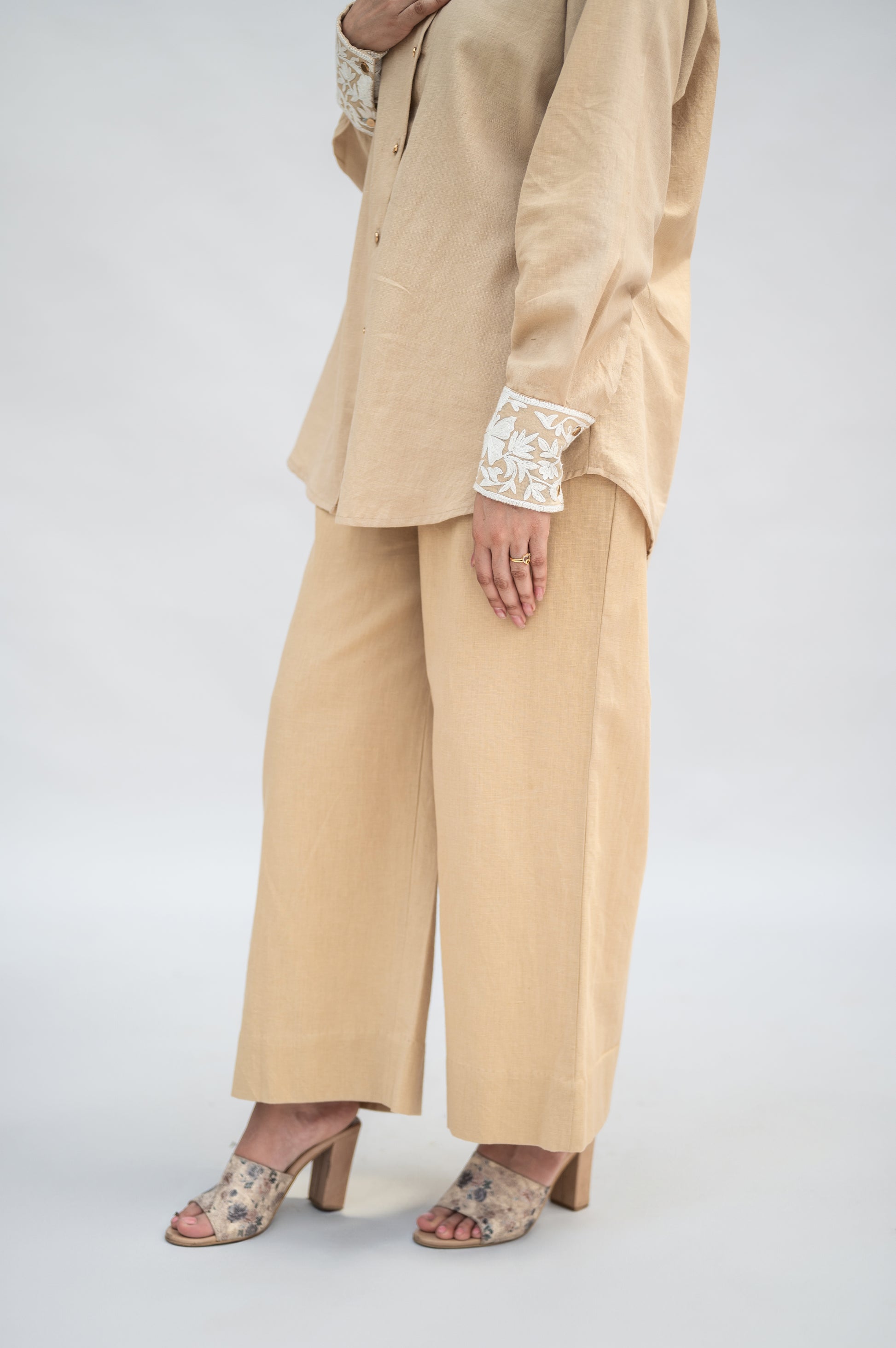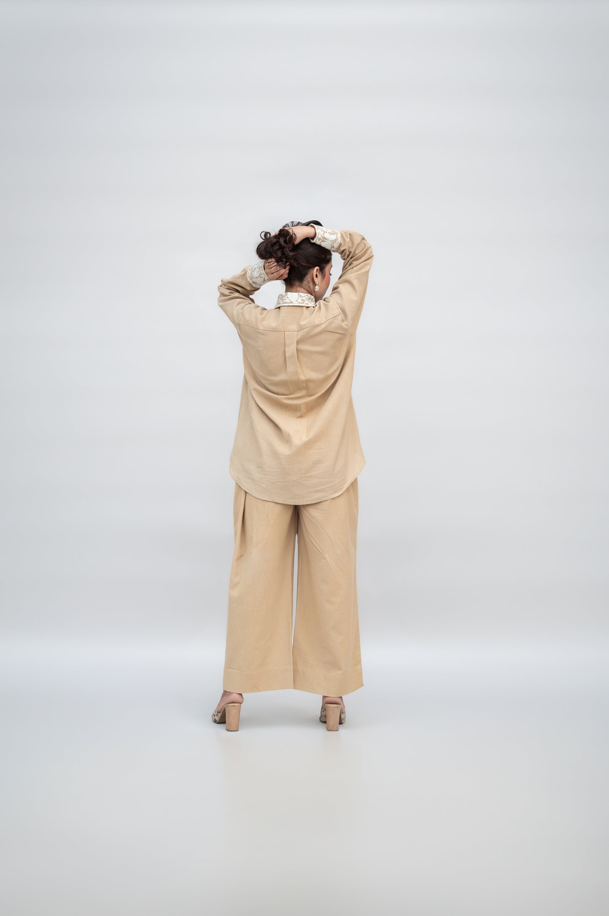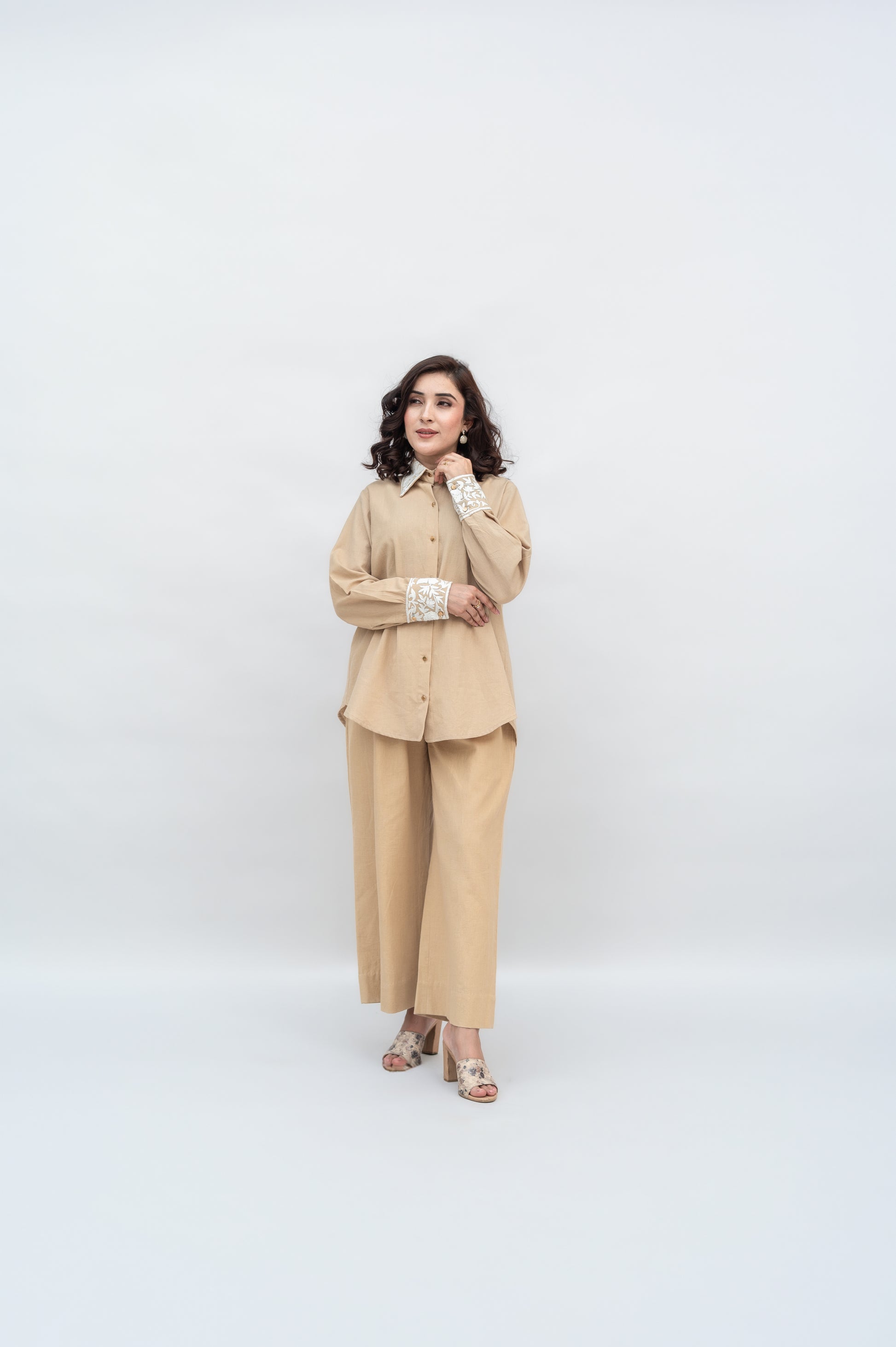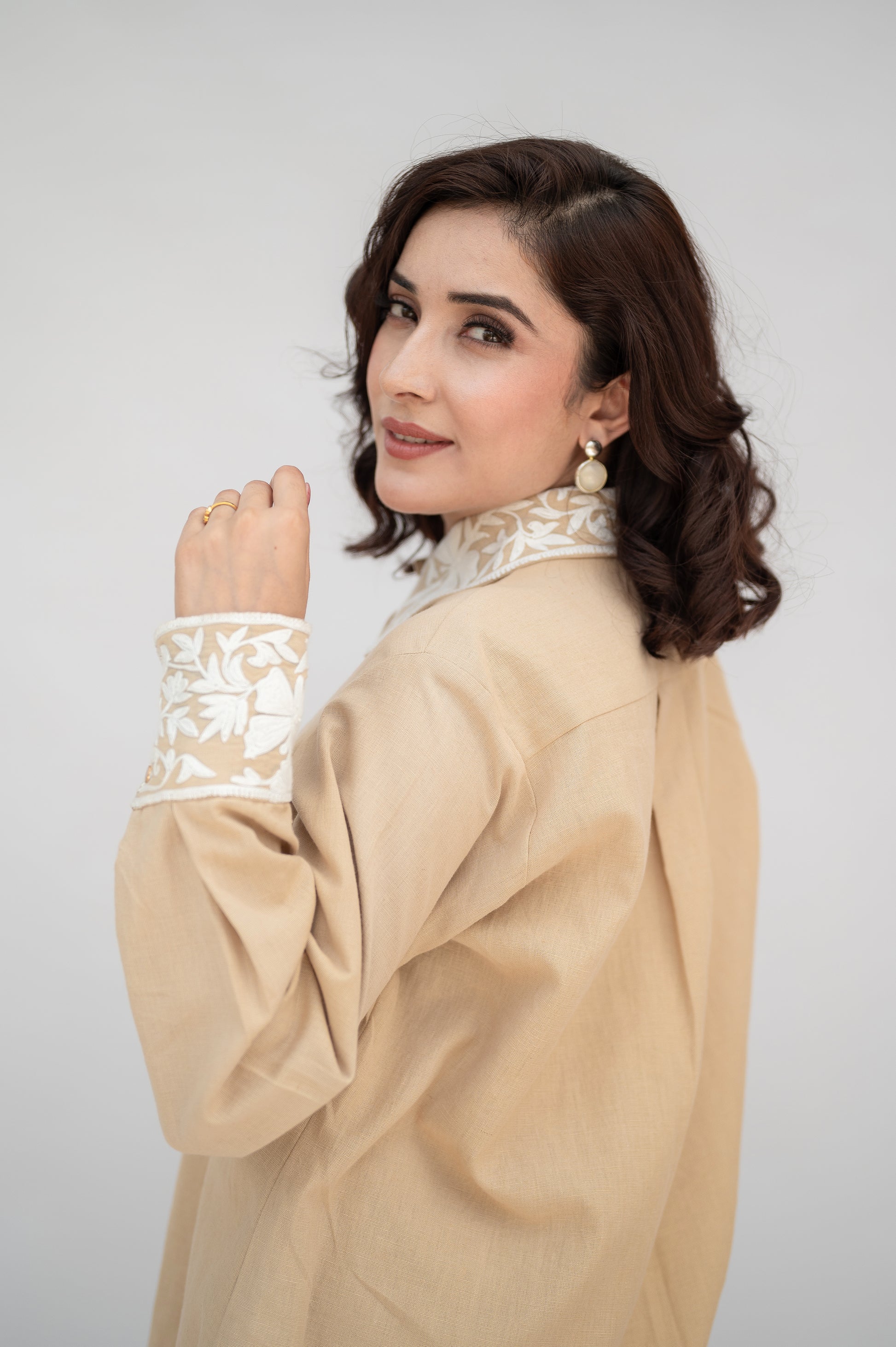 Beige Khadi Cotton Co-ord Set: a fusion of comfort and sophistication, crafted in premium Khadi Cotton and adorned with intricate Kashmiri Aari Embroidery.