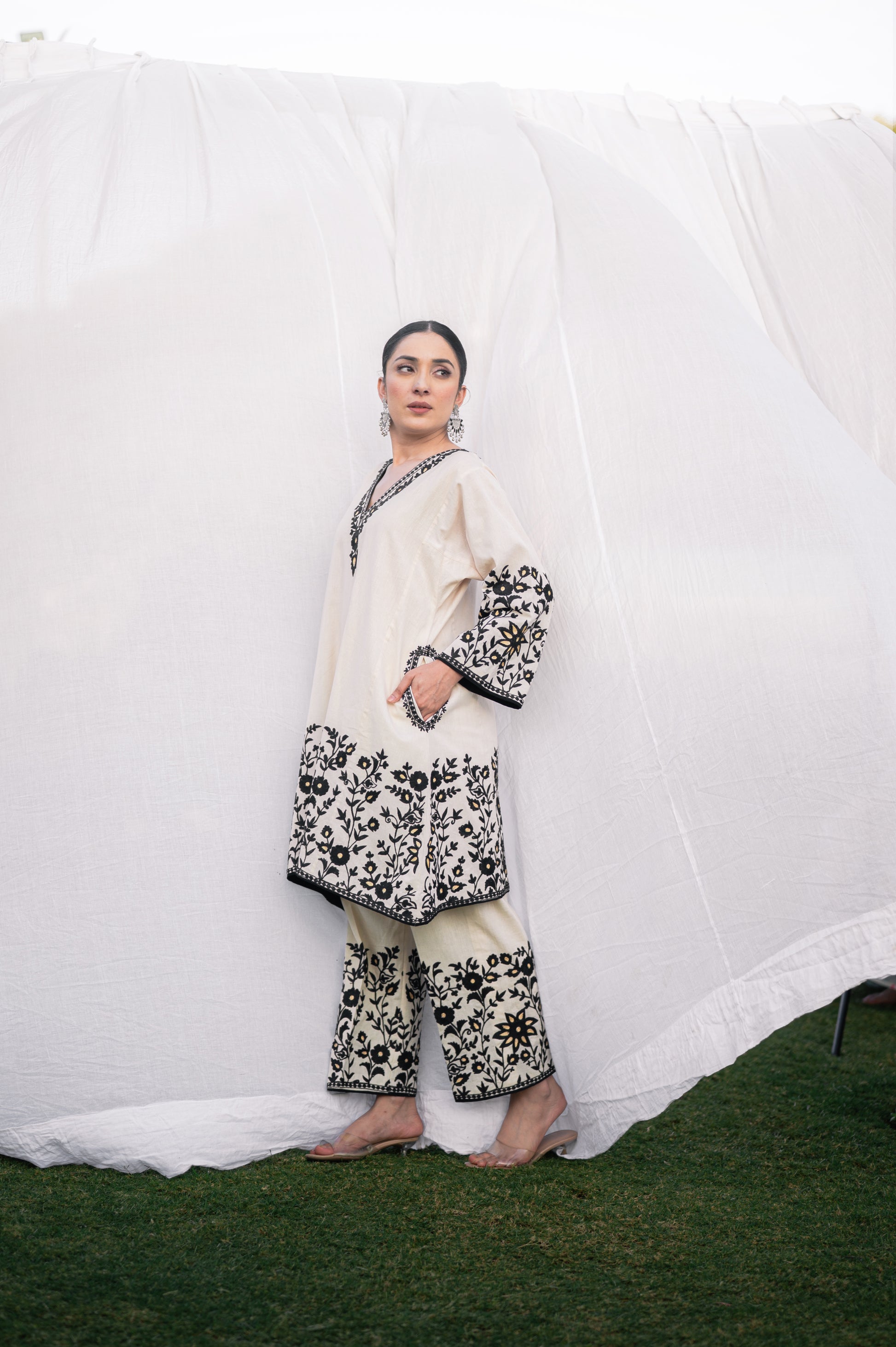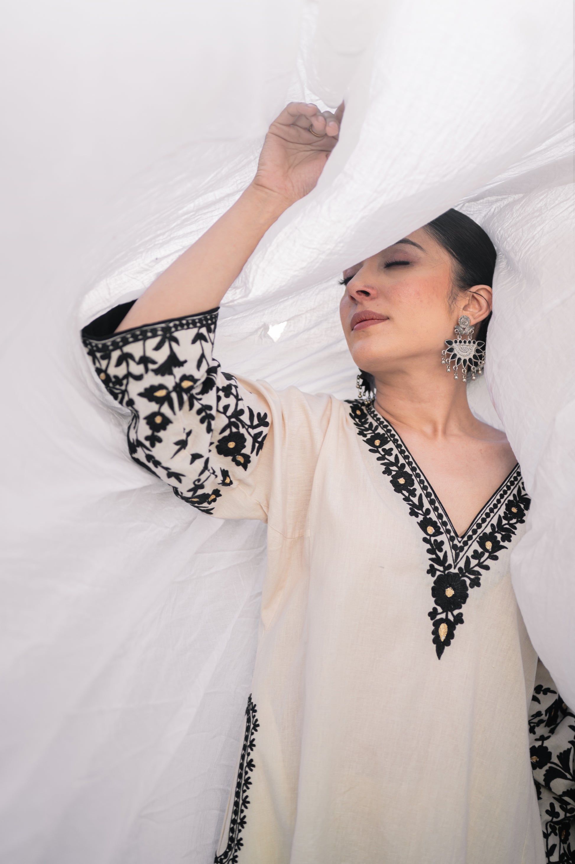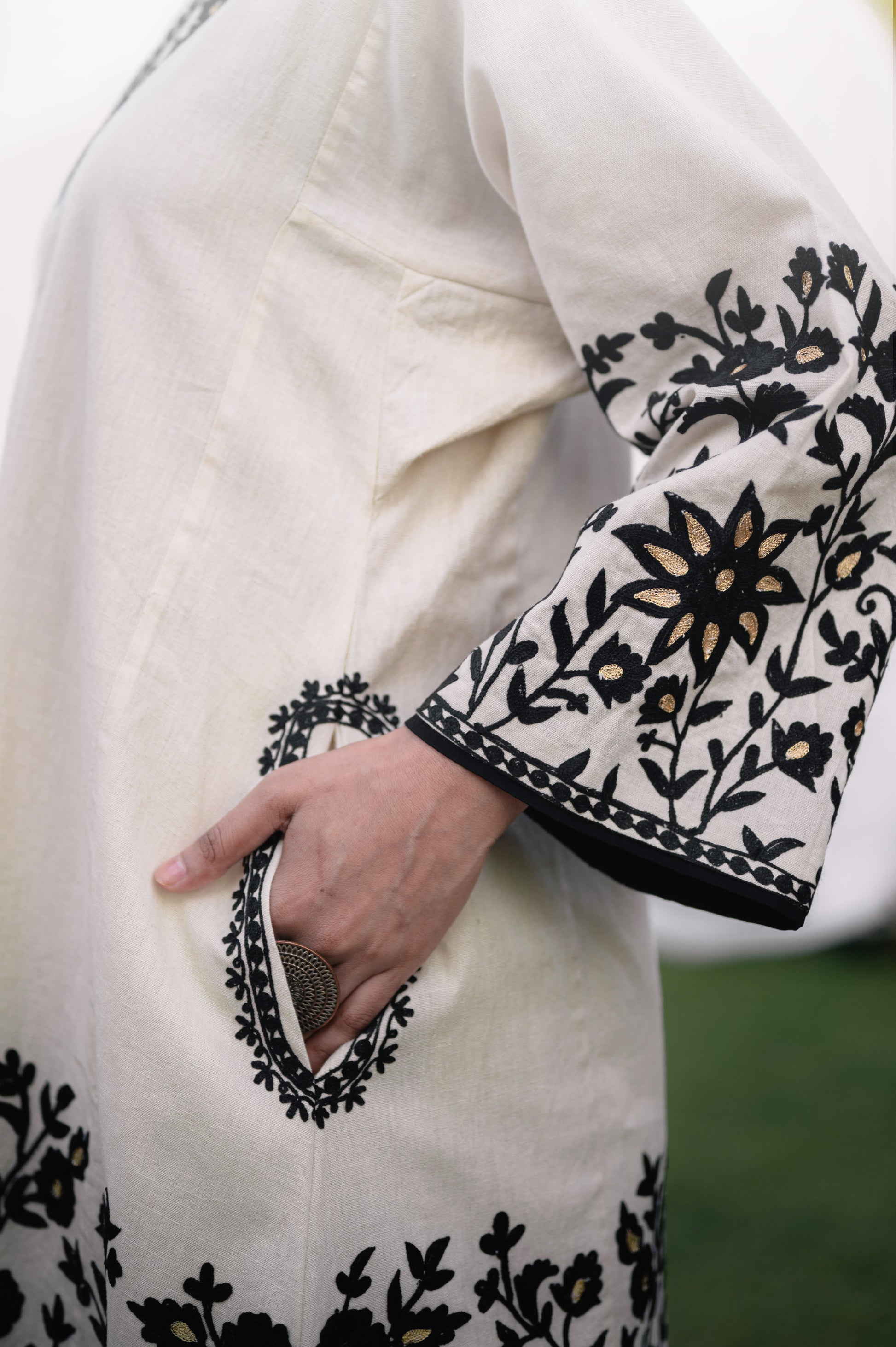 A timeless beige khadi cotton phiran, enriched with Aari and Tilla embroidery for a classic Kashmiri touch.