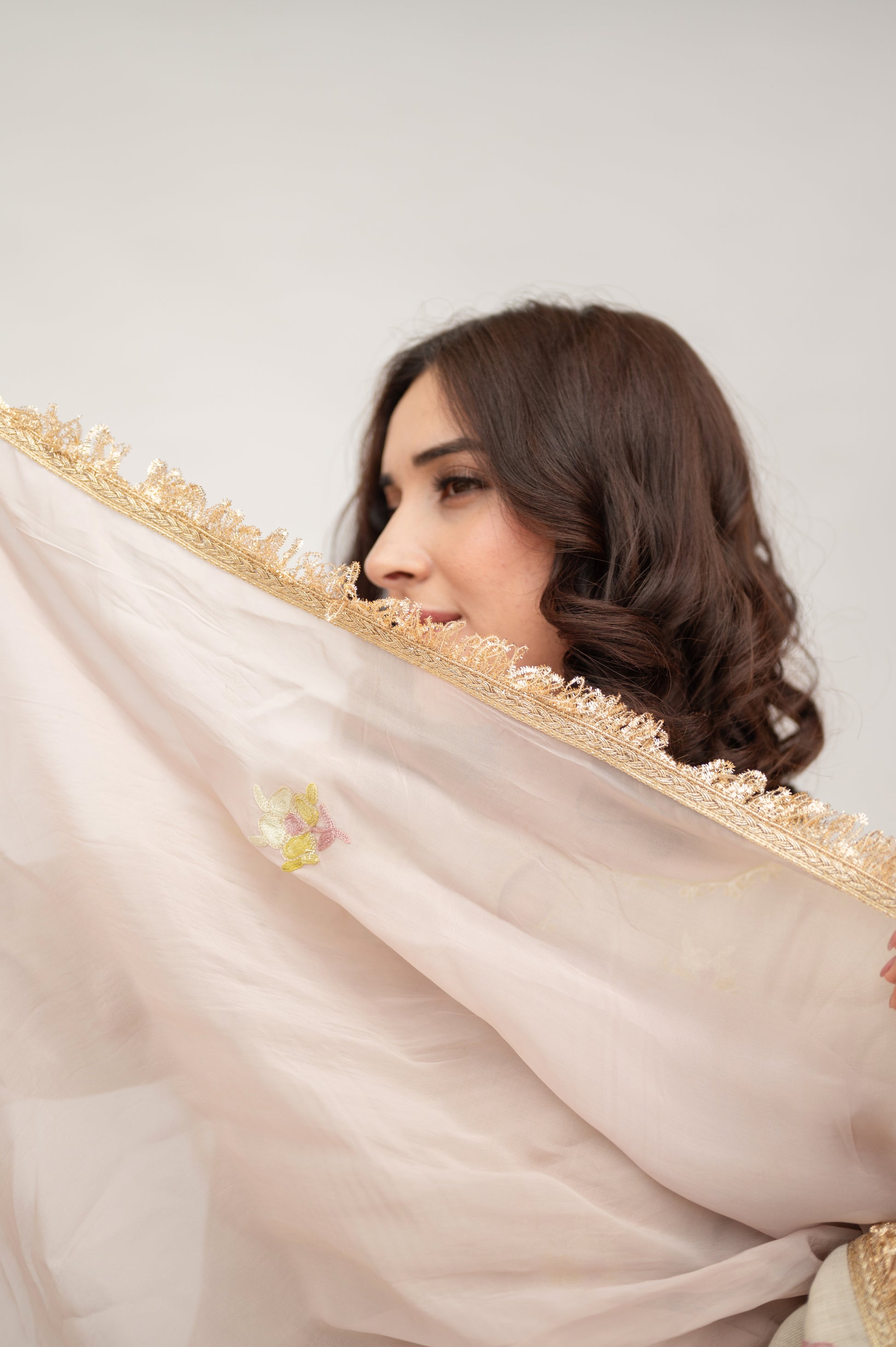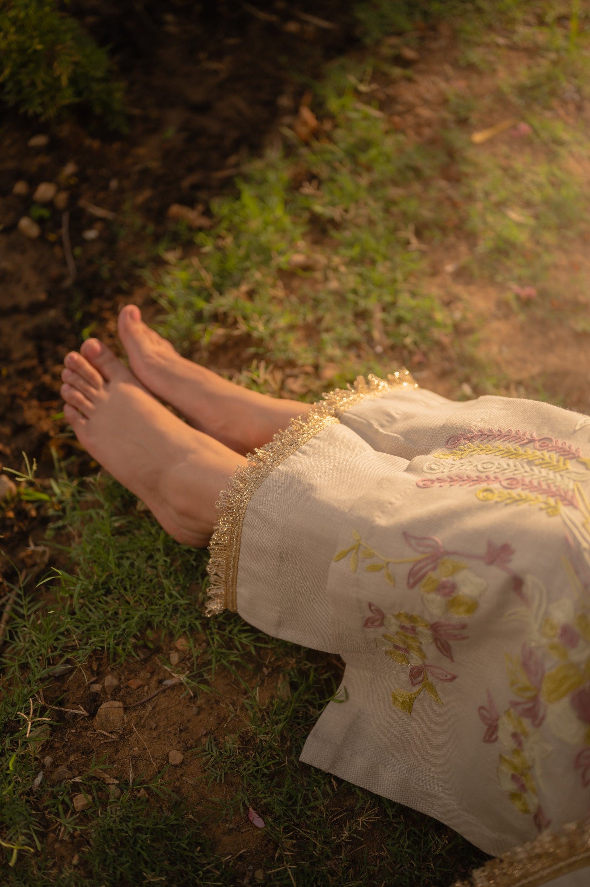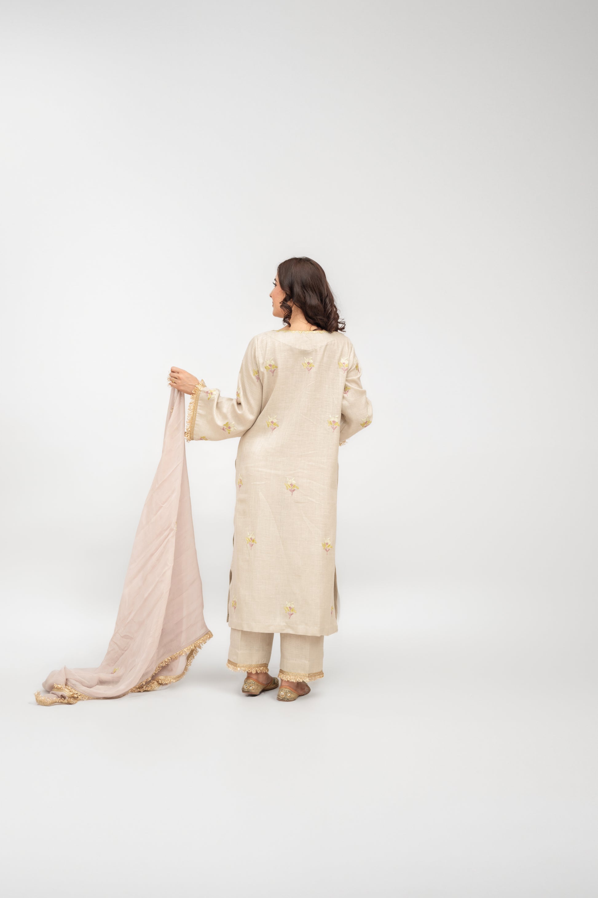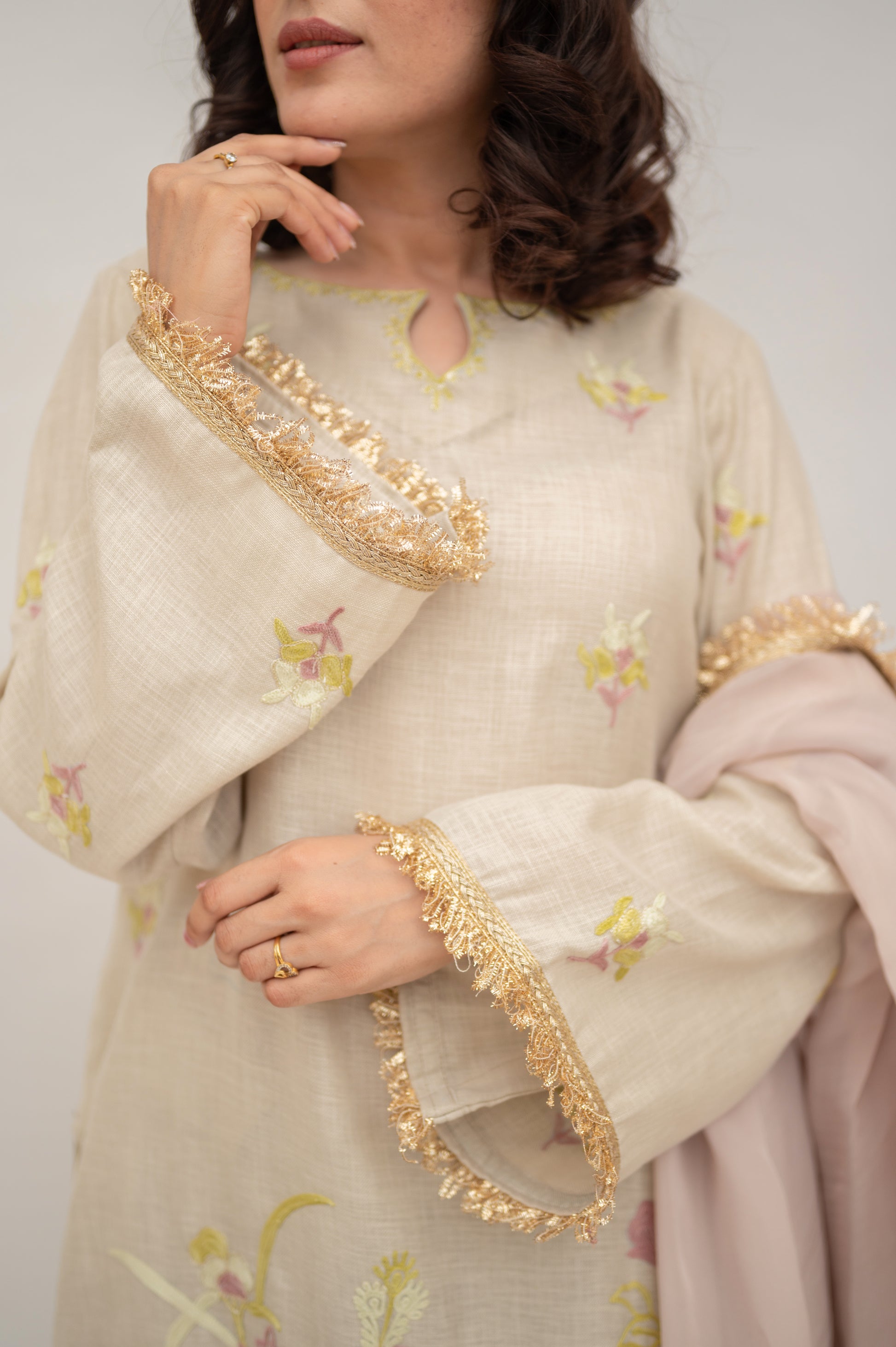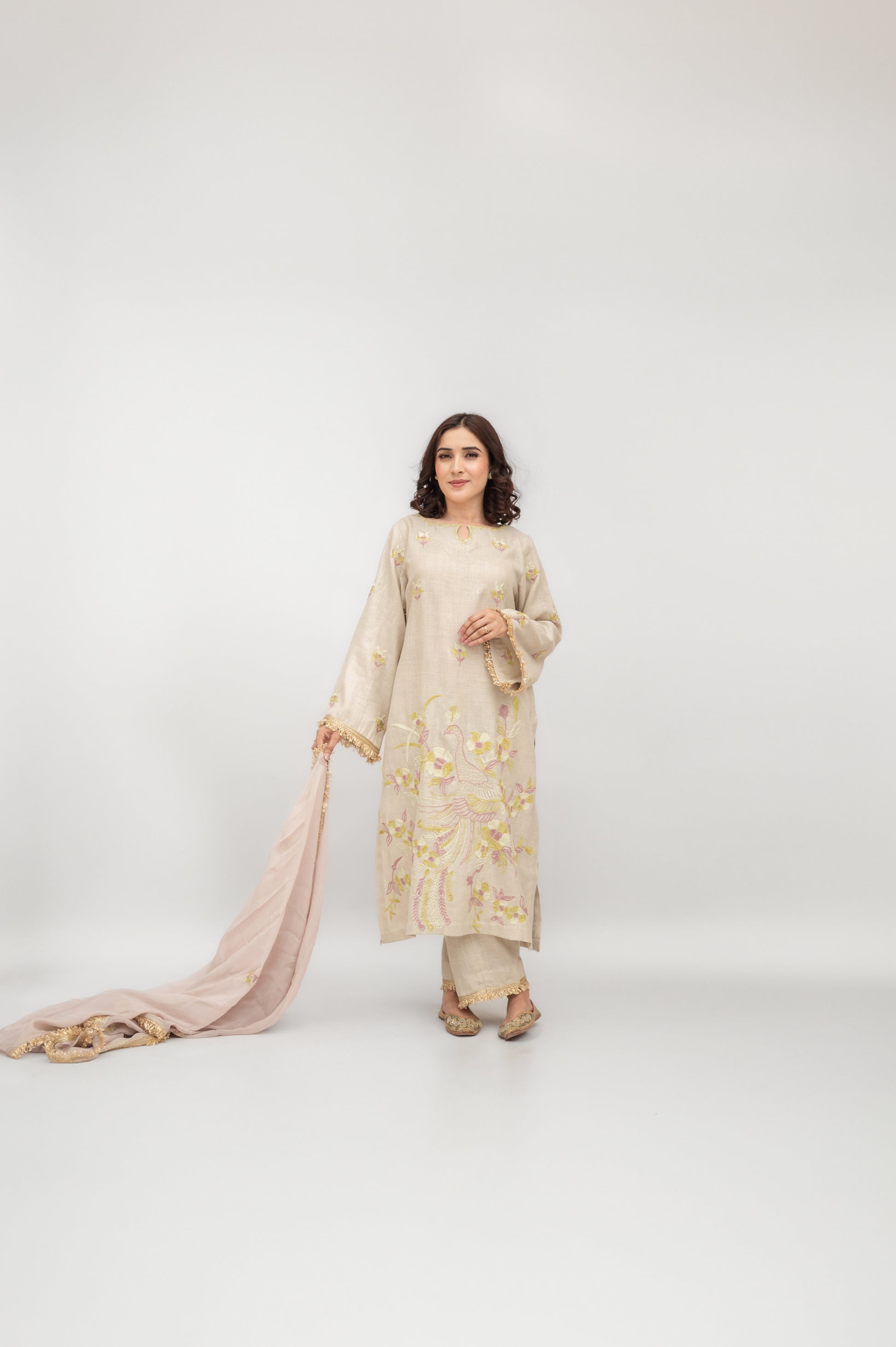 Beige Linen Suit: a fusion of comfort and sophistication, crafted in premium linen and adorned with intricate Kashmiri Aari & Tilla Embroidery.