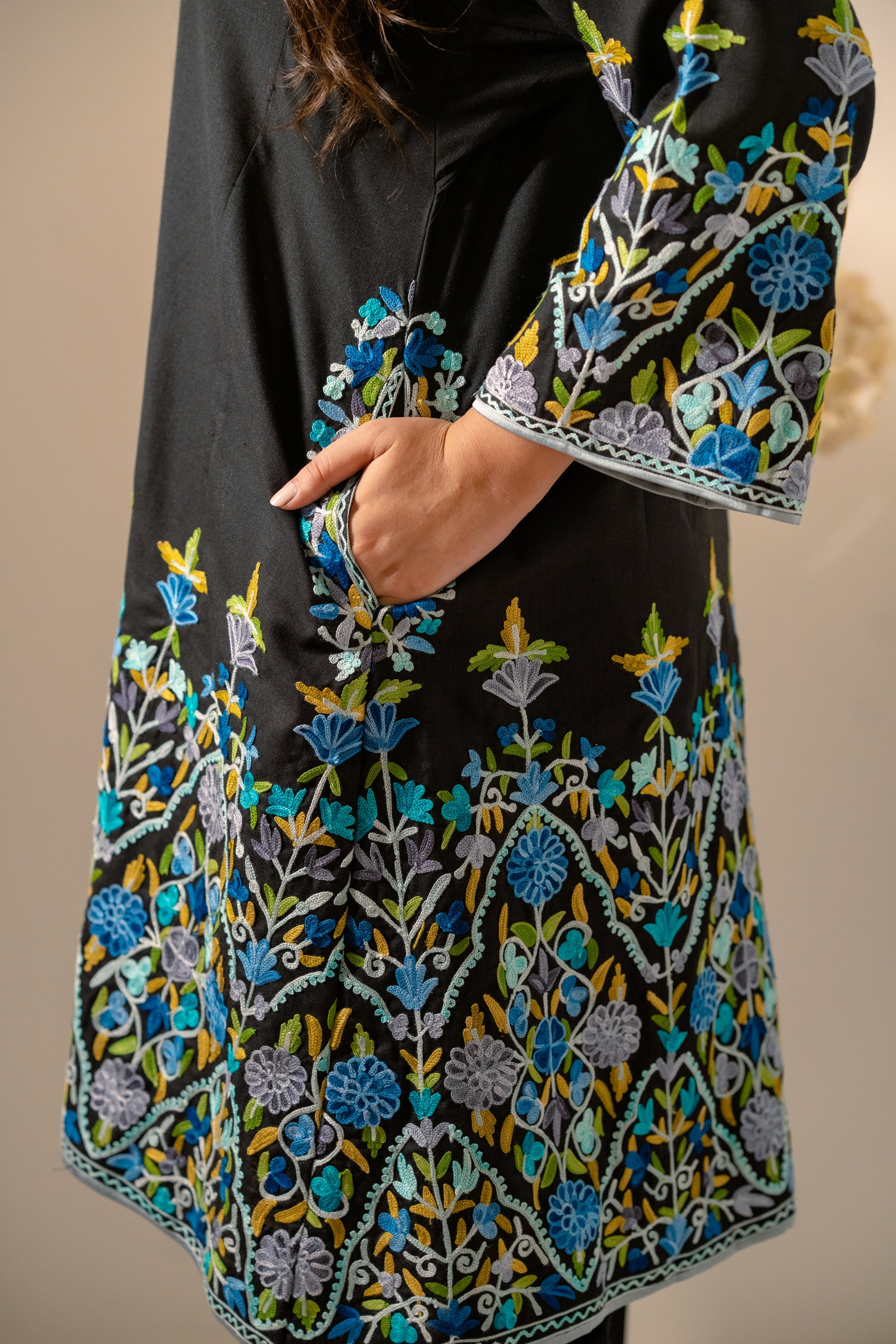 Black cotton phiran with pants embellished with kashmiri tilla embroidery.