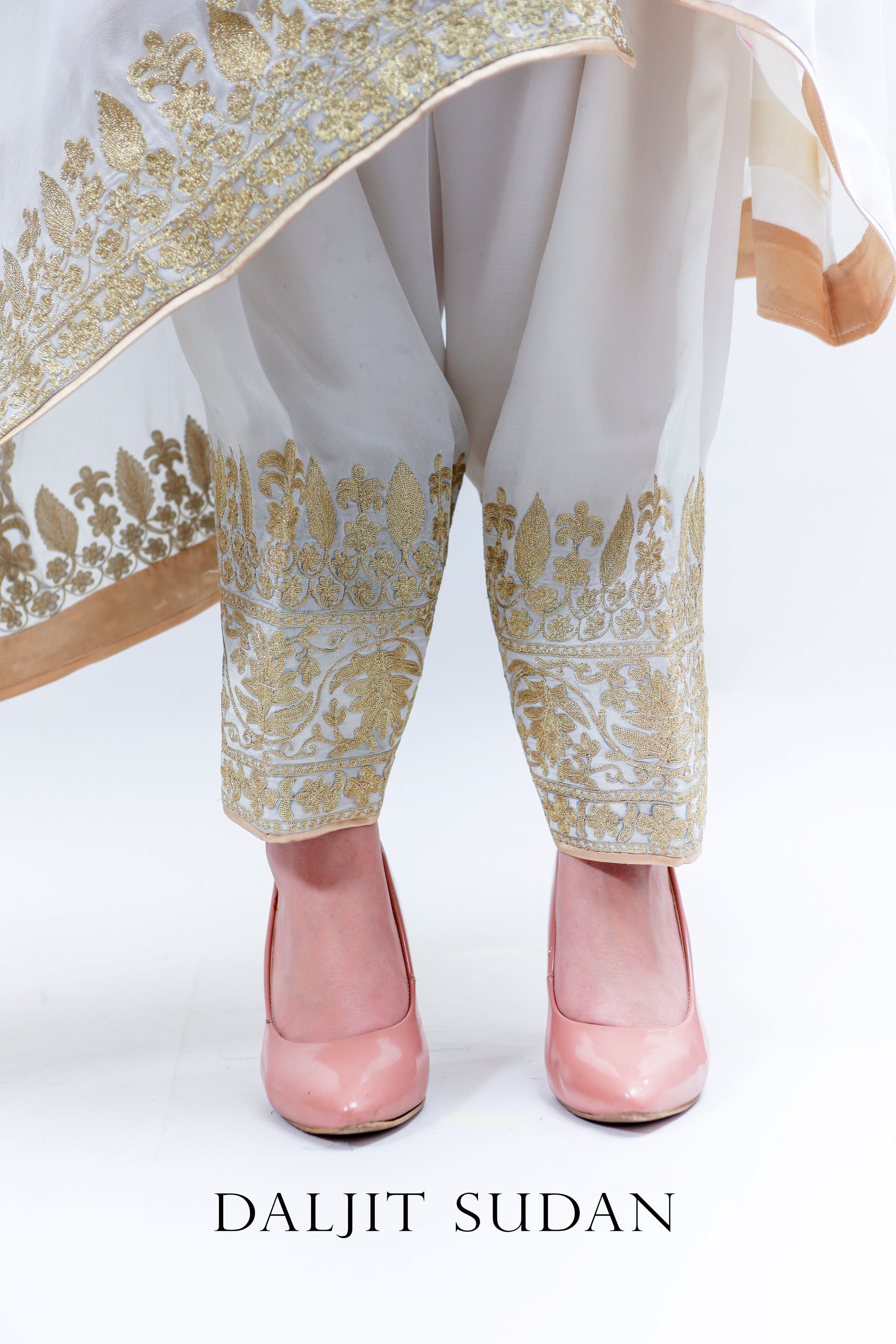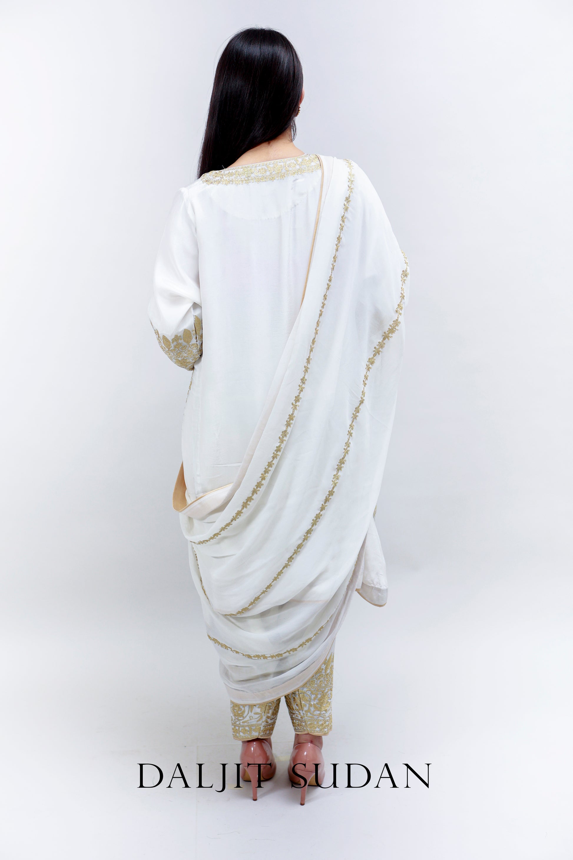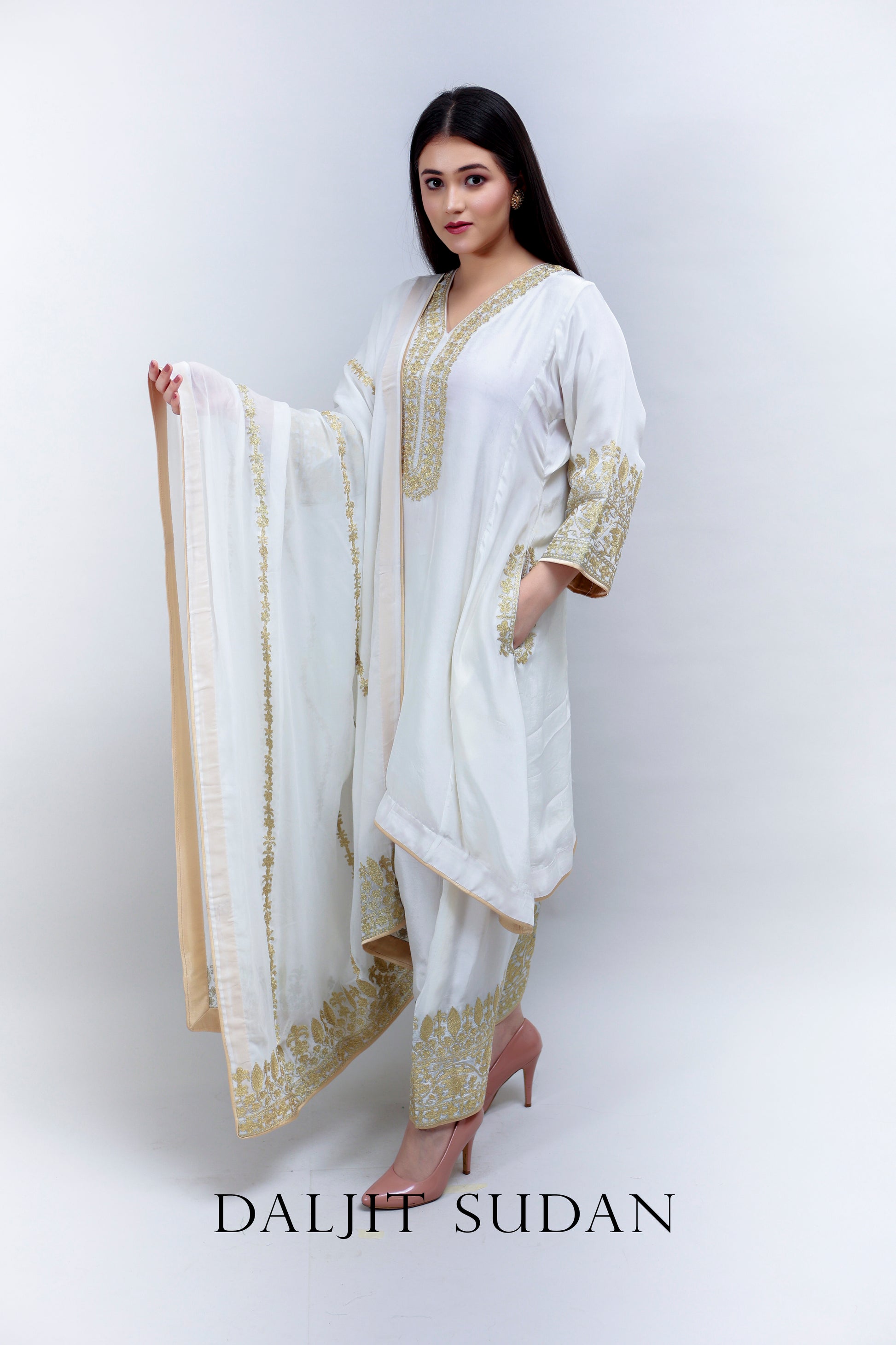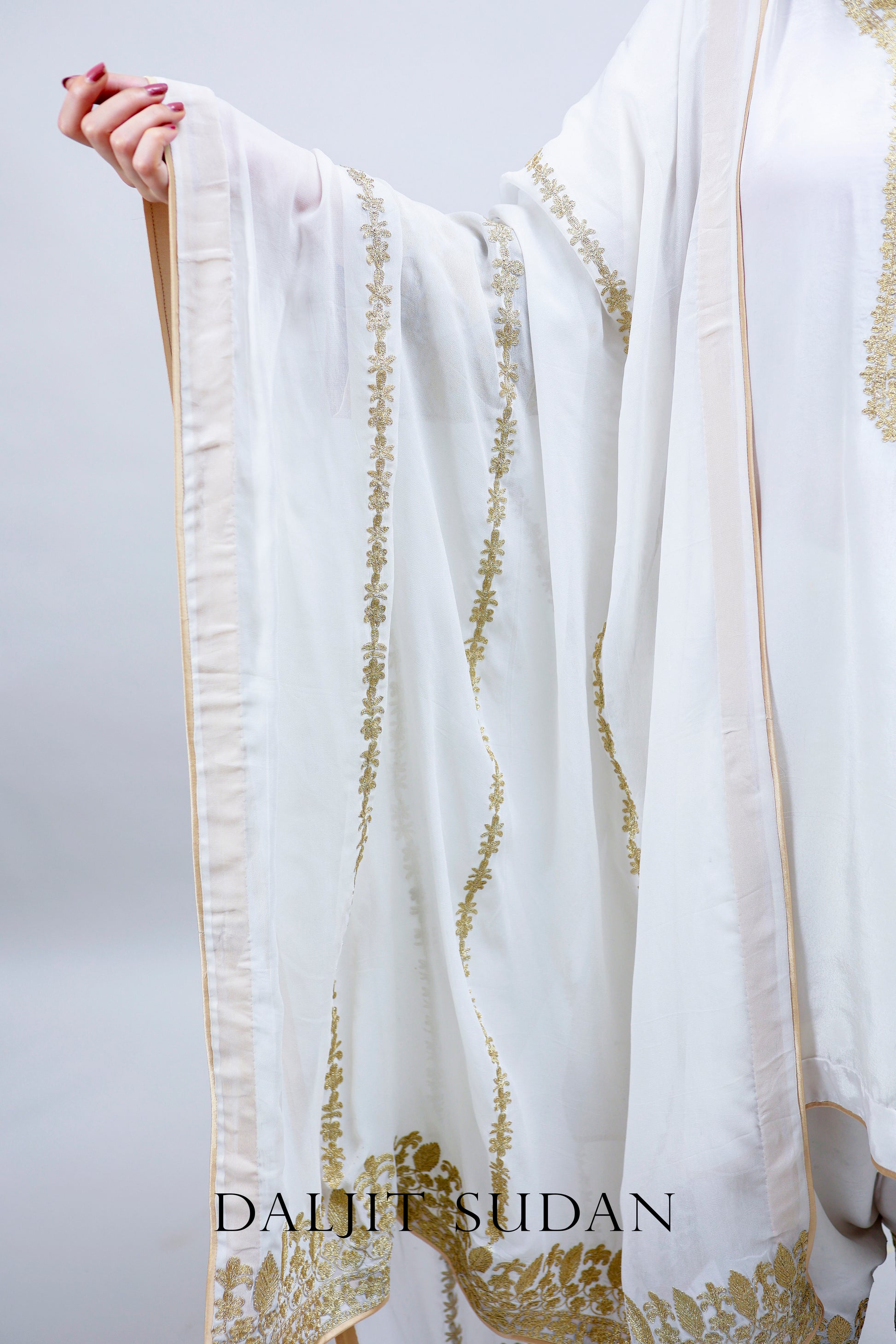 White Crepe Phiran Suit with Tilla Aari machine embroidery.