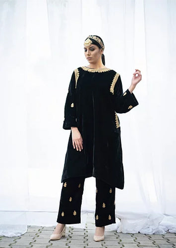 Black Velvet Phiran Set with Tilla Embroidery.