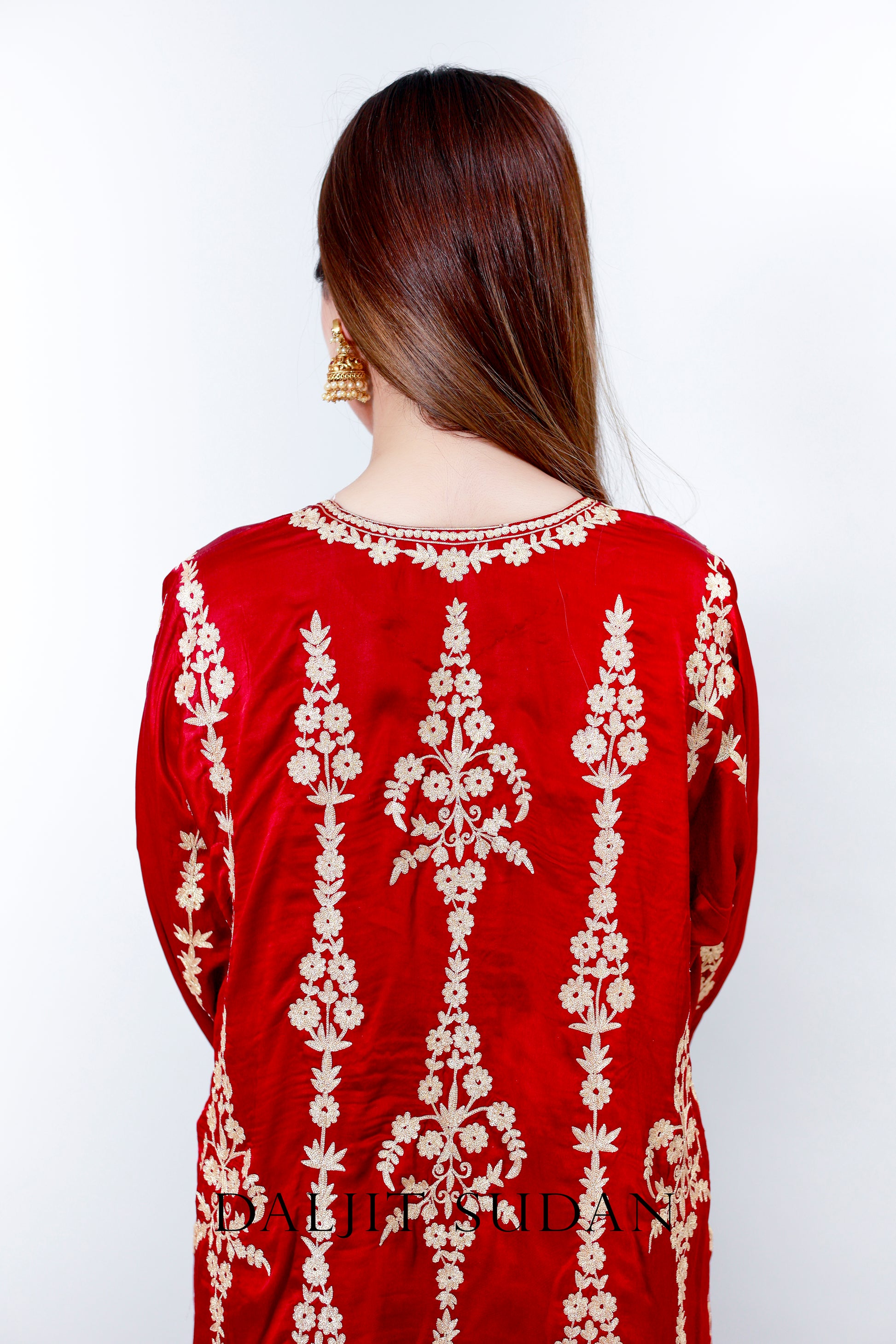 Deep Red German Satin Suit with Tilla Aari machine embroidery.