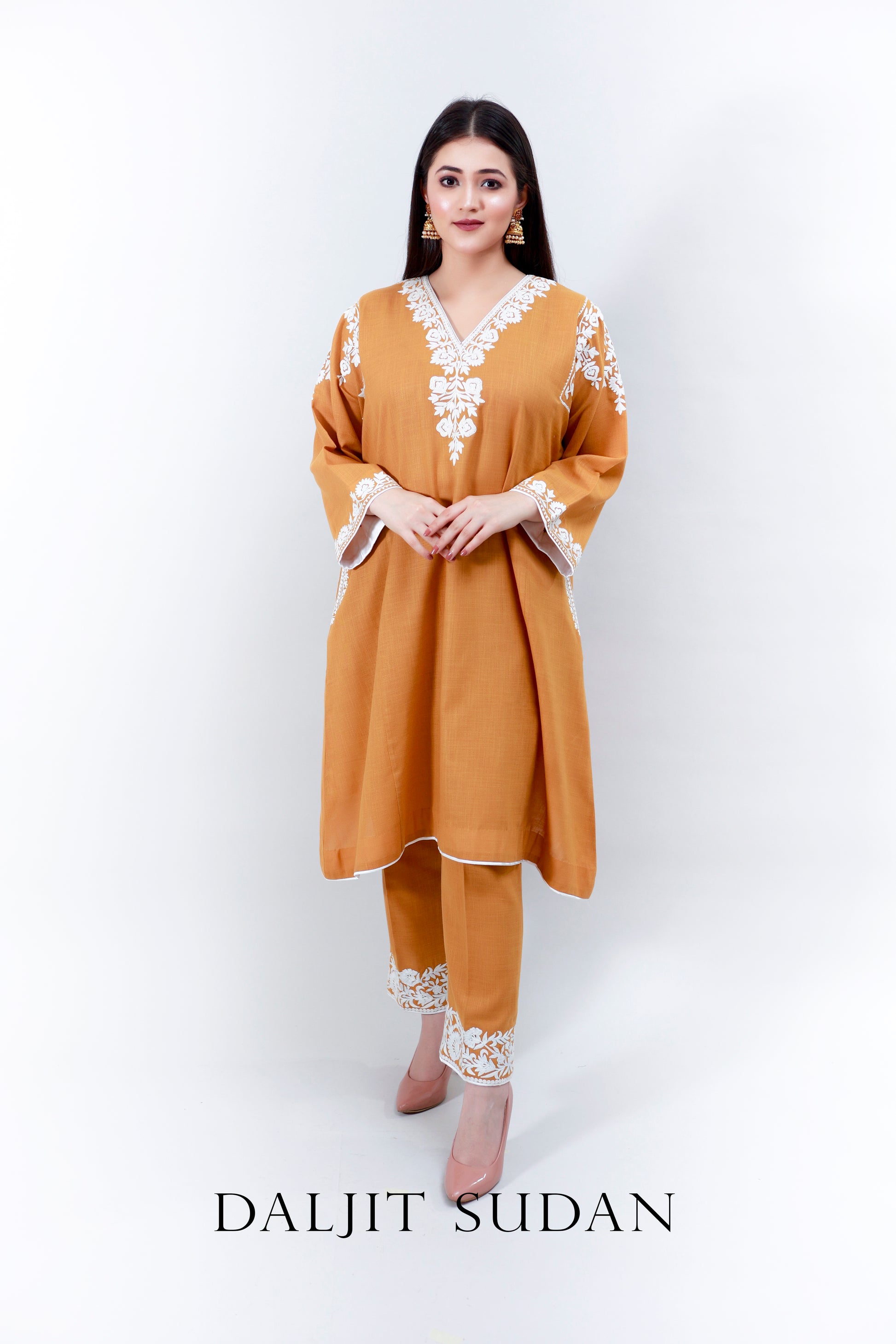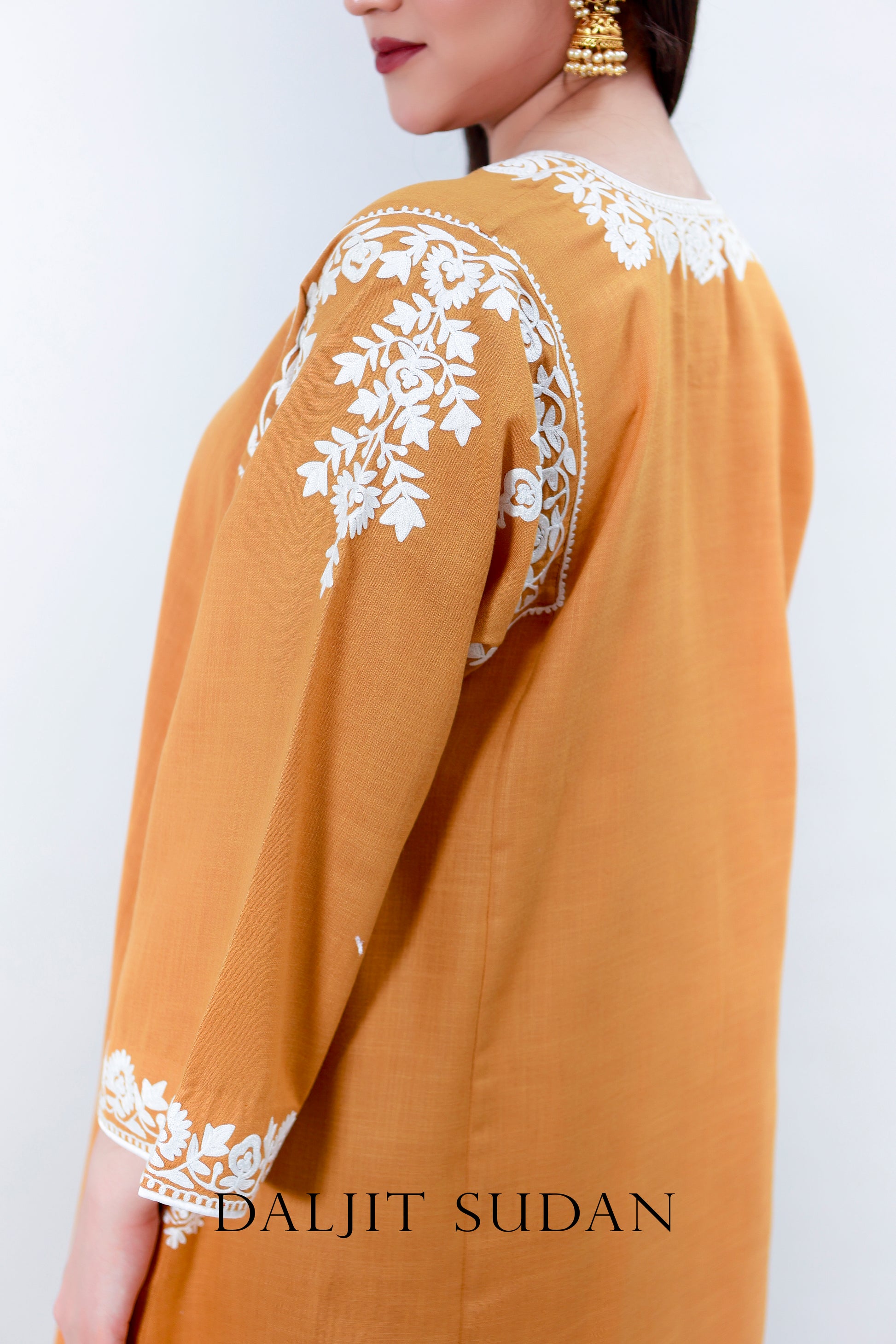Mustard Cotton Phiran and Pant and Pant with thread Aari machine embroidery.