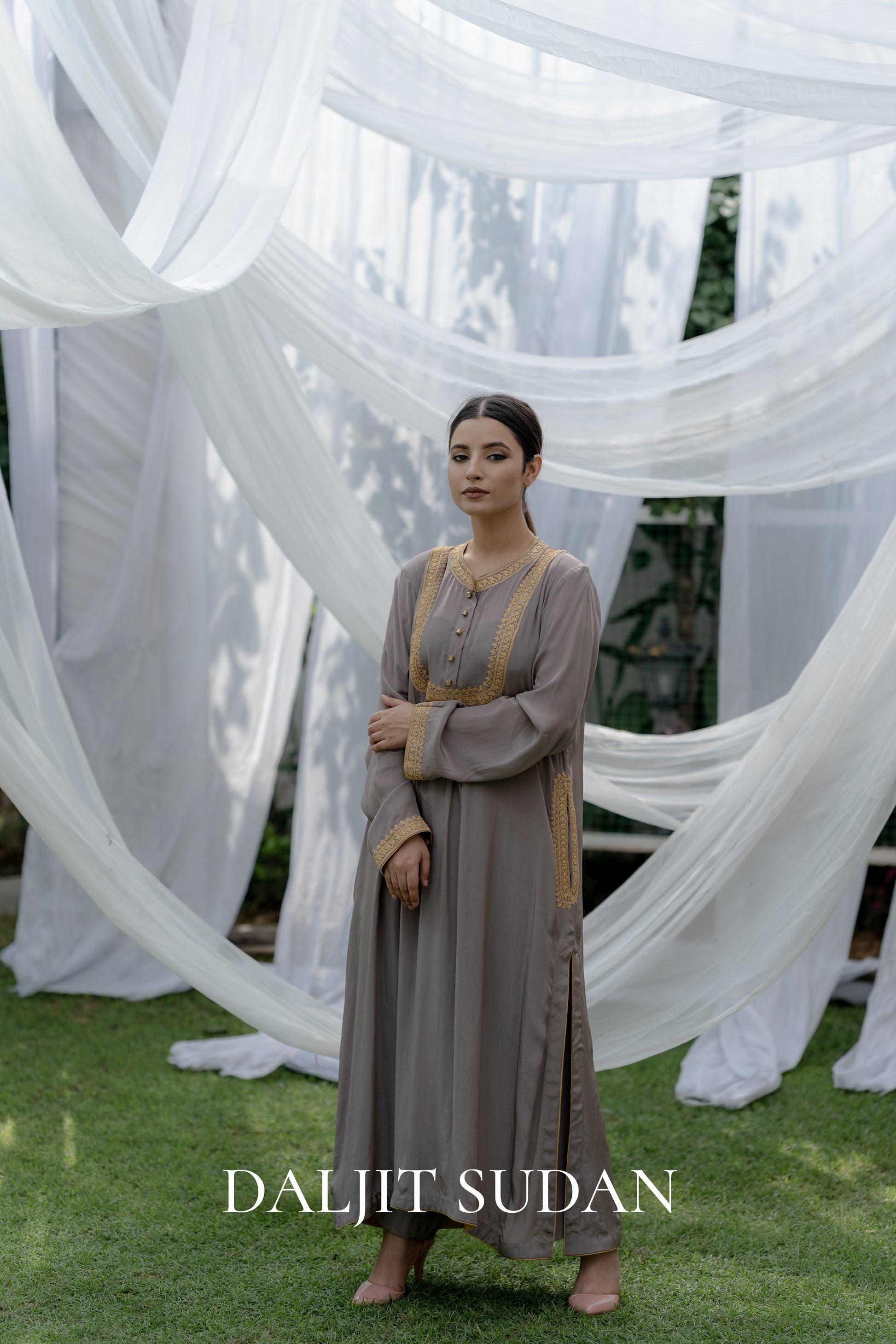 Grey yolk phiran set with Kashmiri tilla embroidery.
