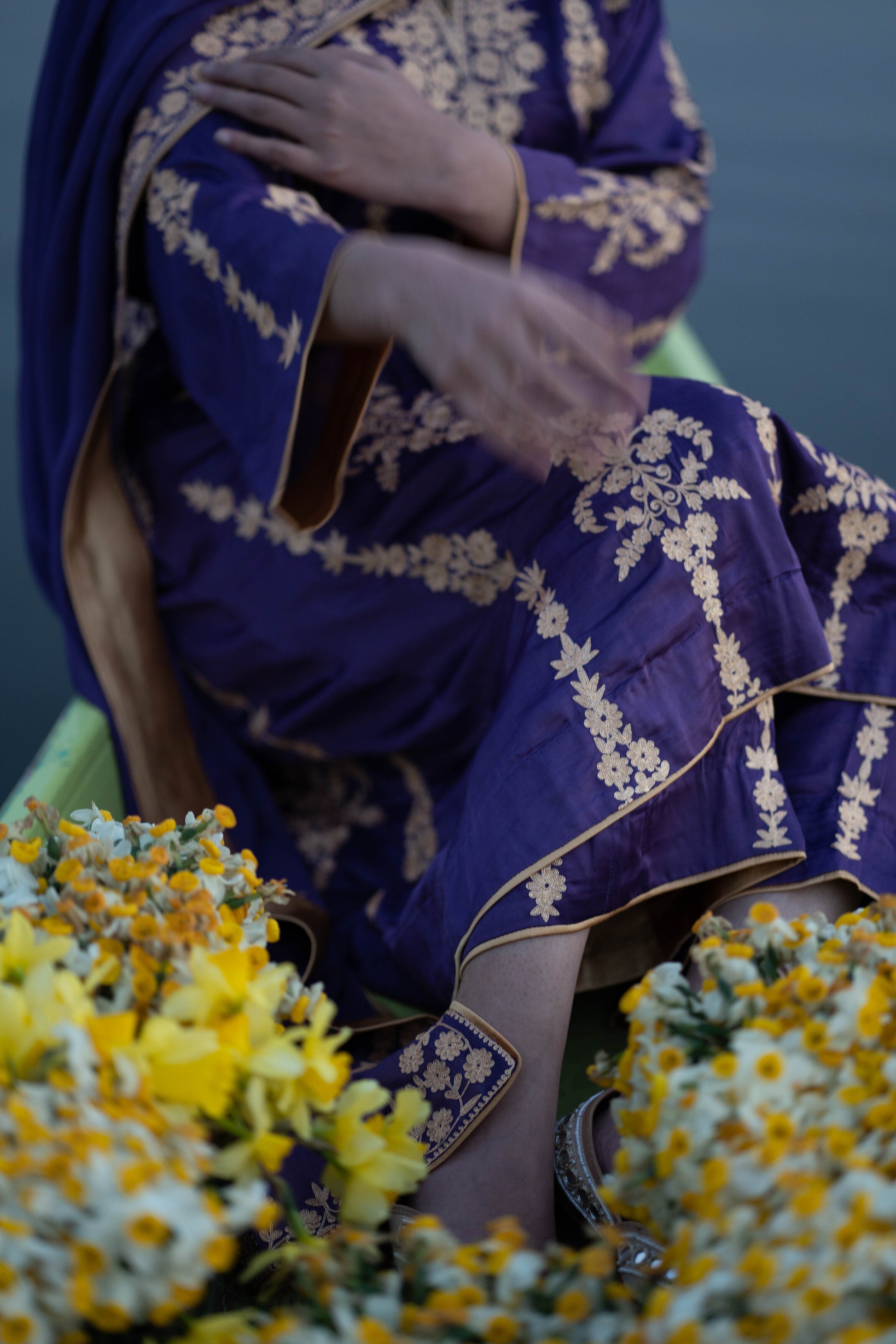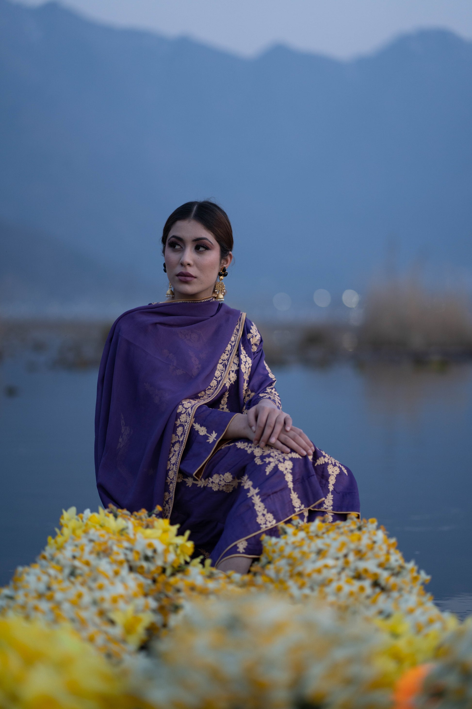 Violet German Satin Suit with Tilla Aari machine embroidery.