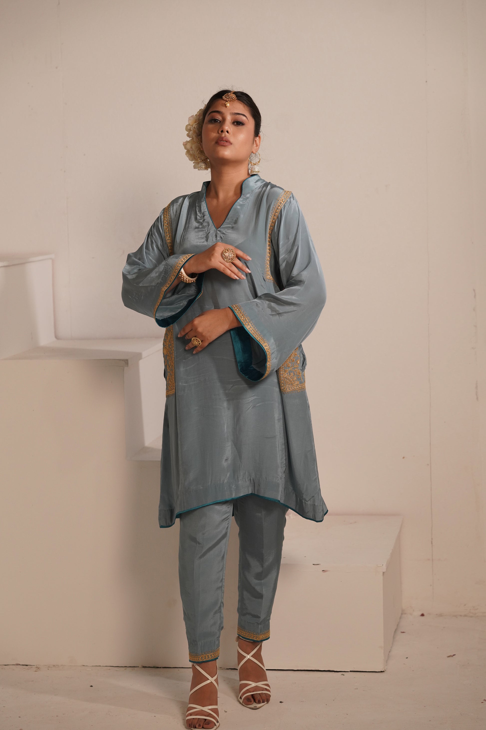 Blue grey crepe phiran with pants embellished with kashmiri tilla embroidery.