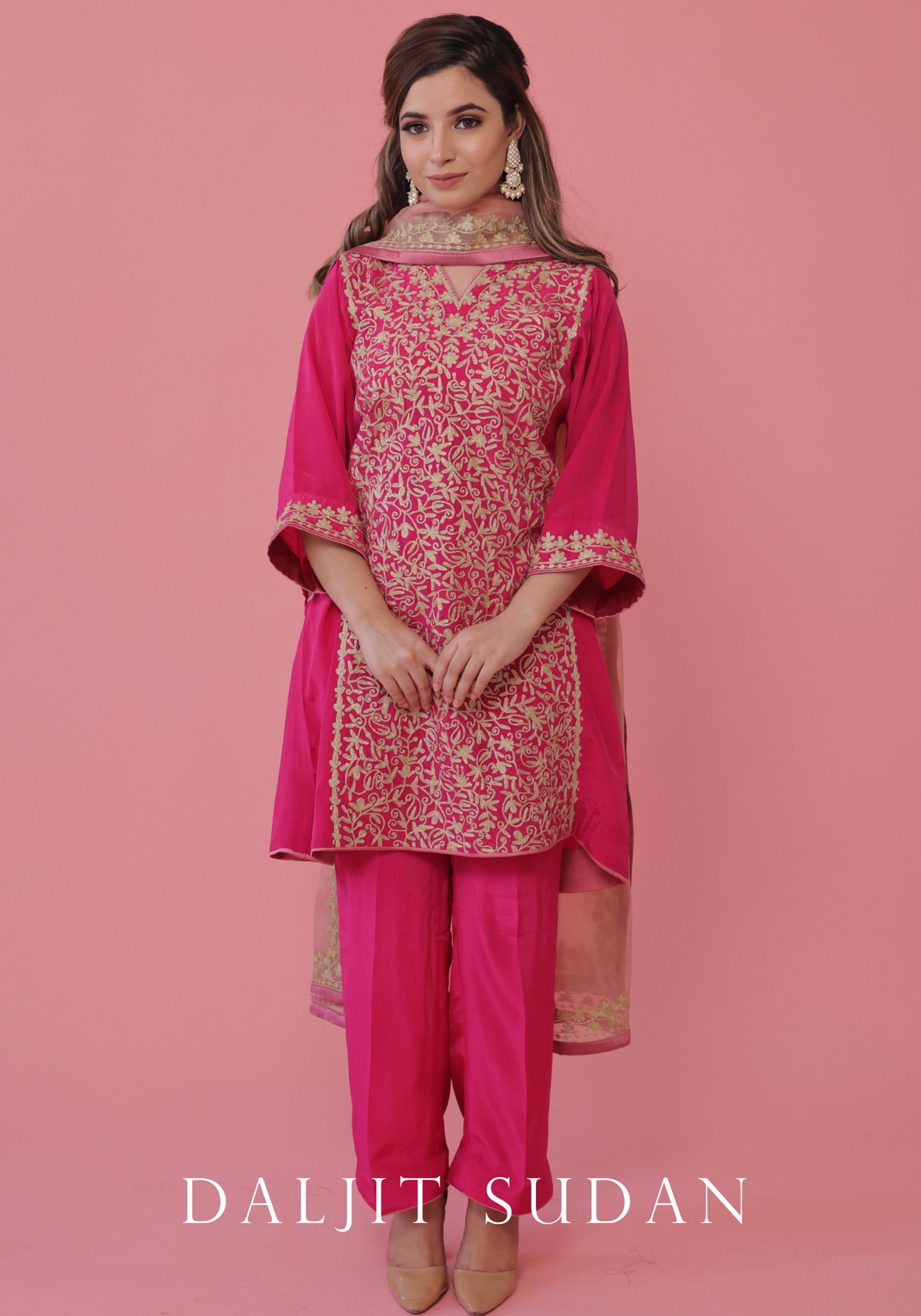 Magenta Pink crepe phiran suit with tilla aari embroidery