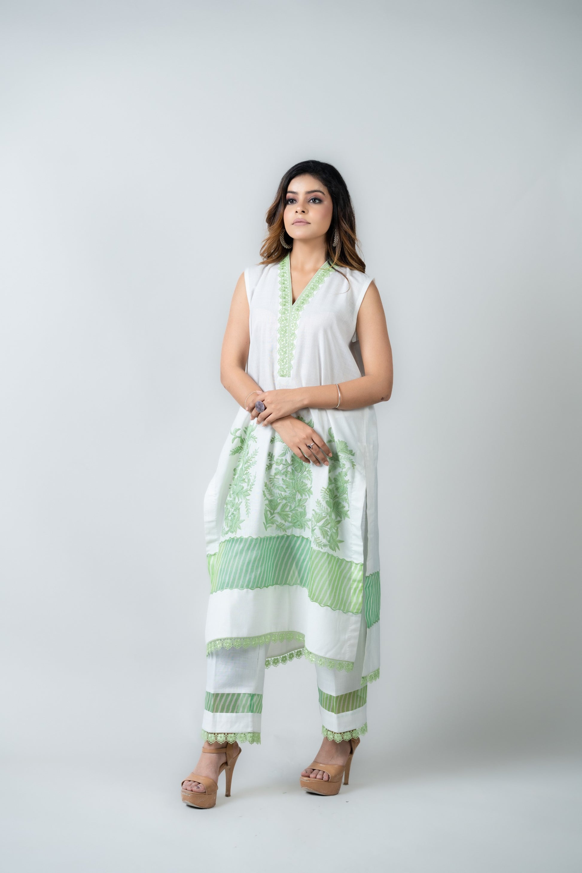 White Cotton Sleeveless Suit with Green Stripe Dupatta