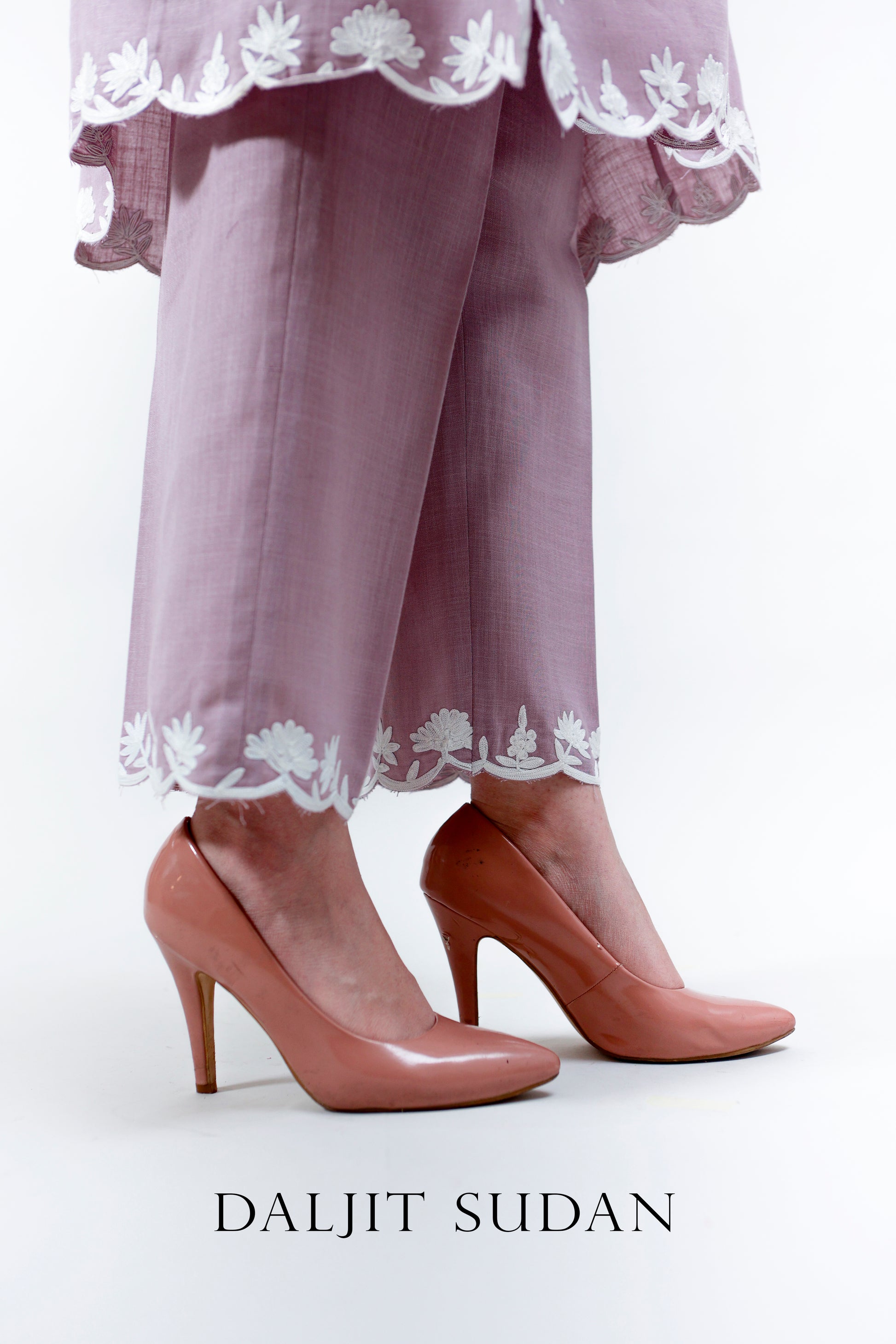 Lilac Cotton Phiran Suit with thread Aari machine embroidery.