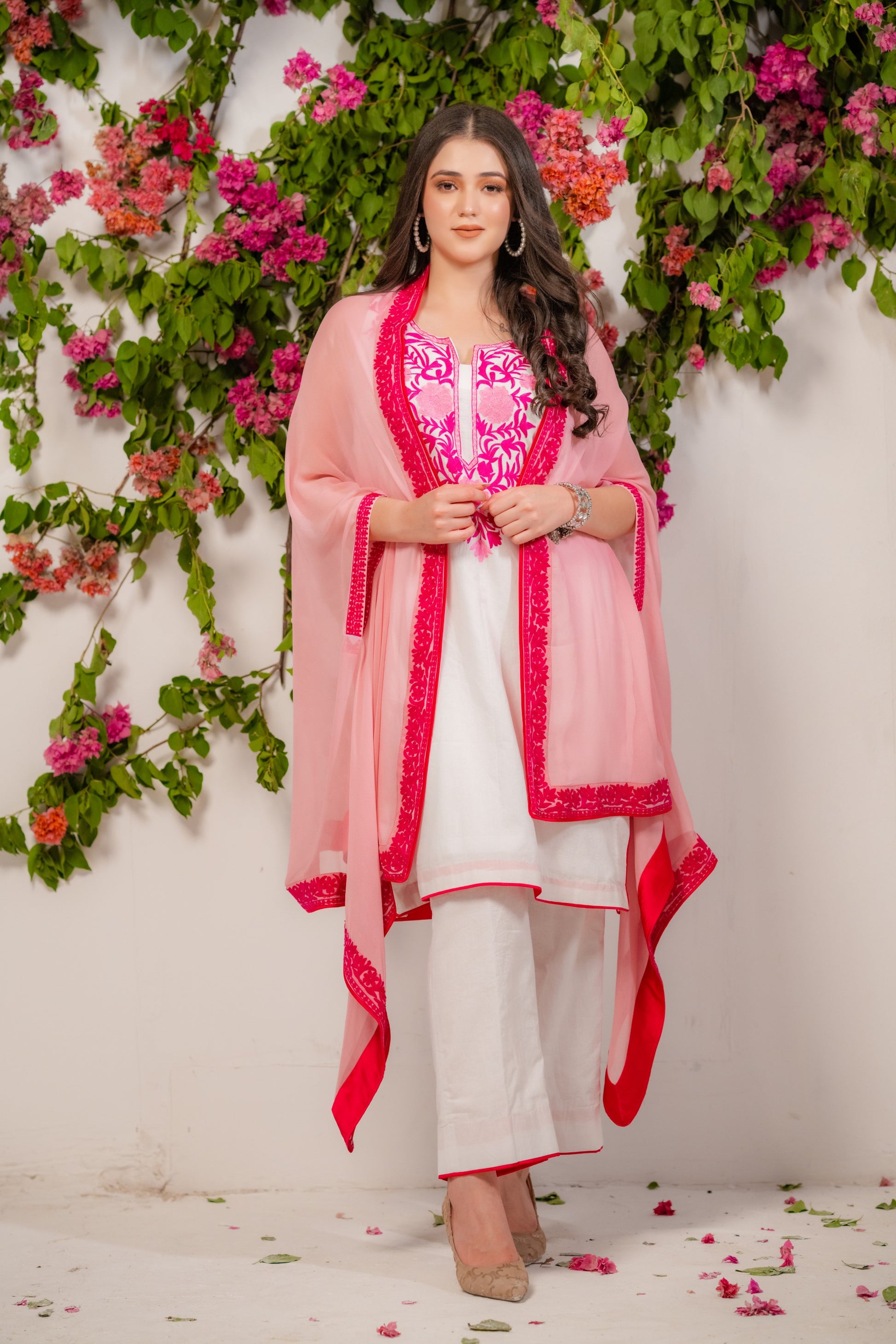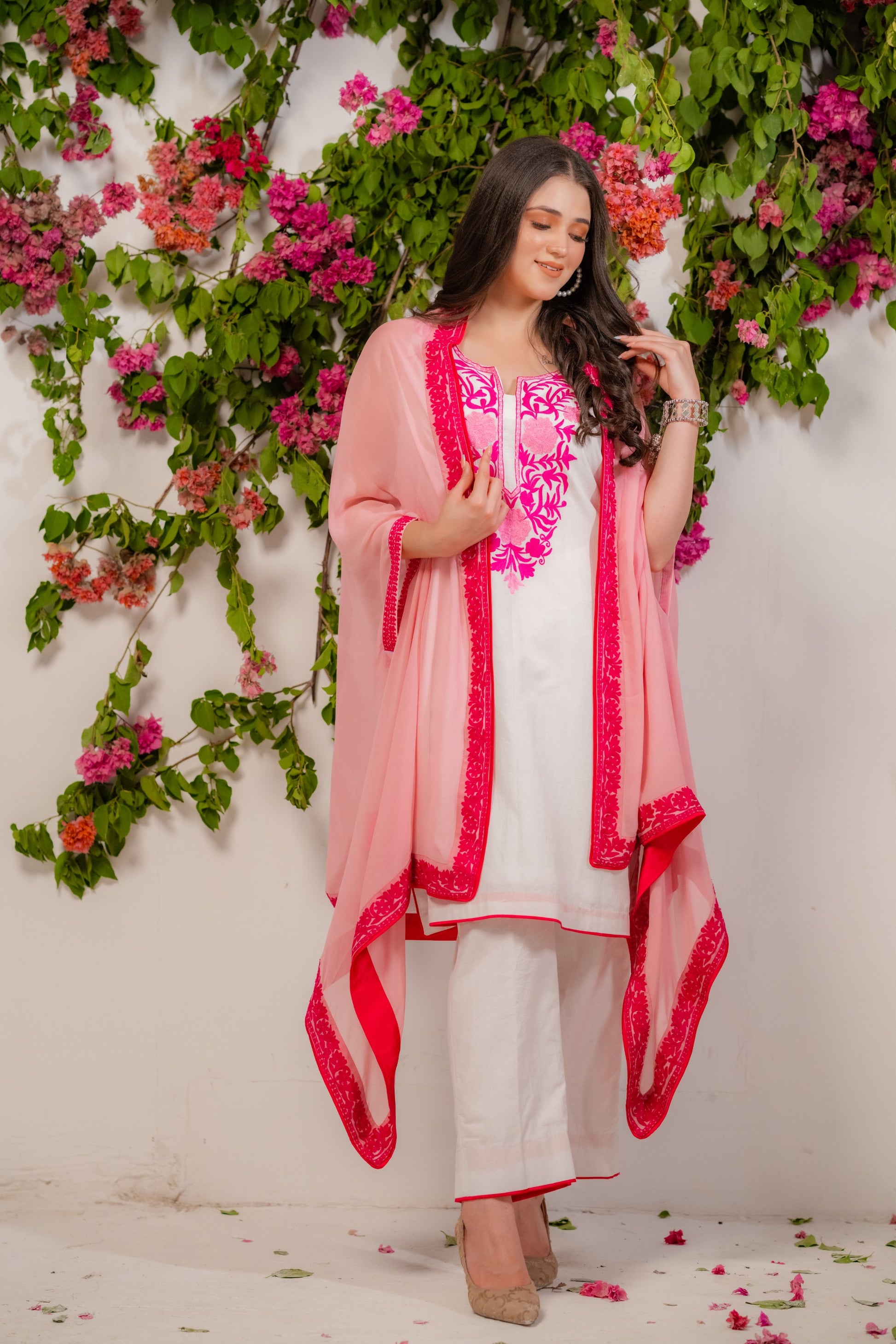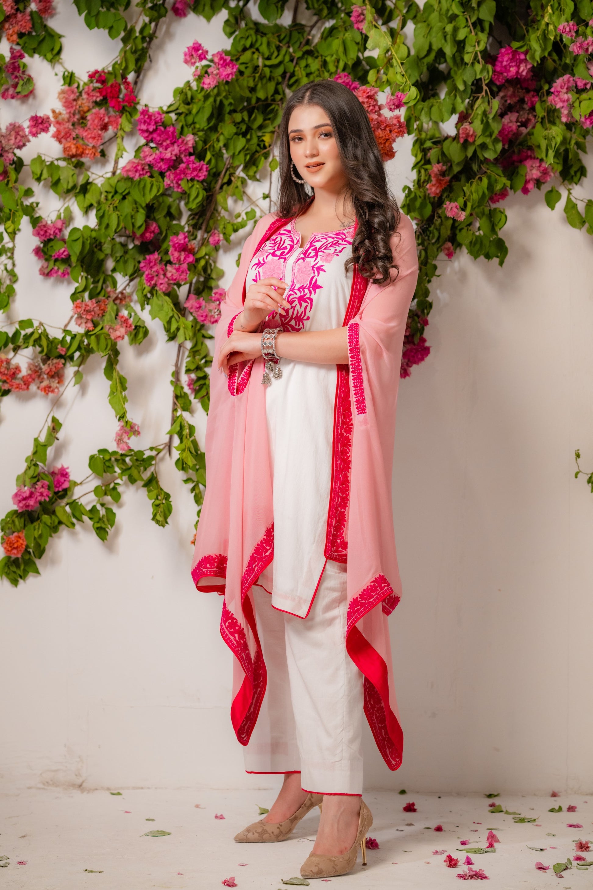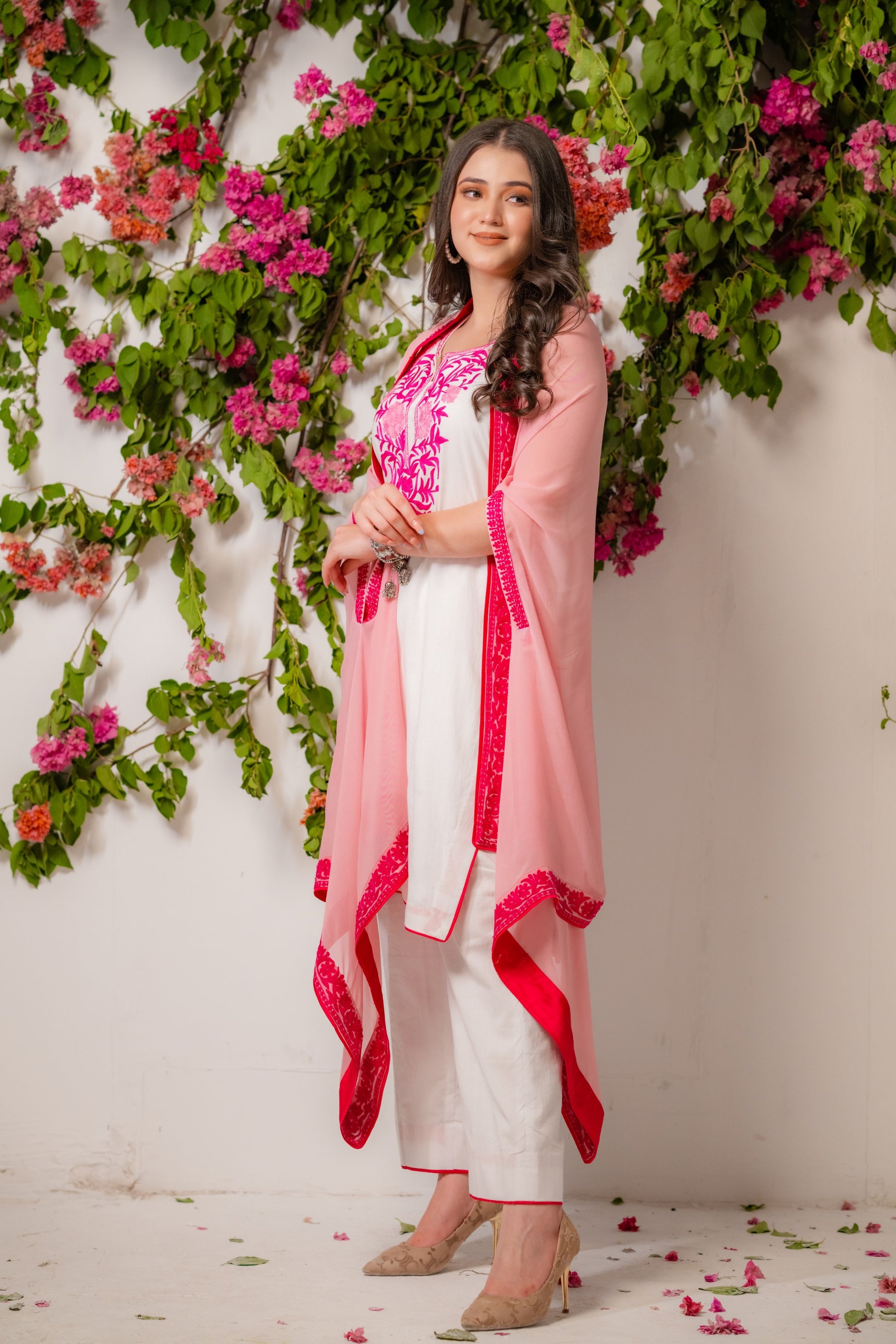 White mulmul kurta set with light pink cape embellished with embroidery.