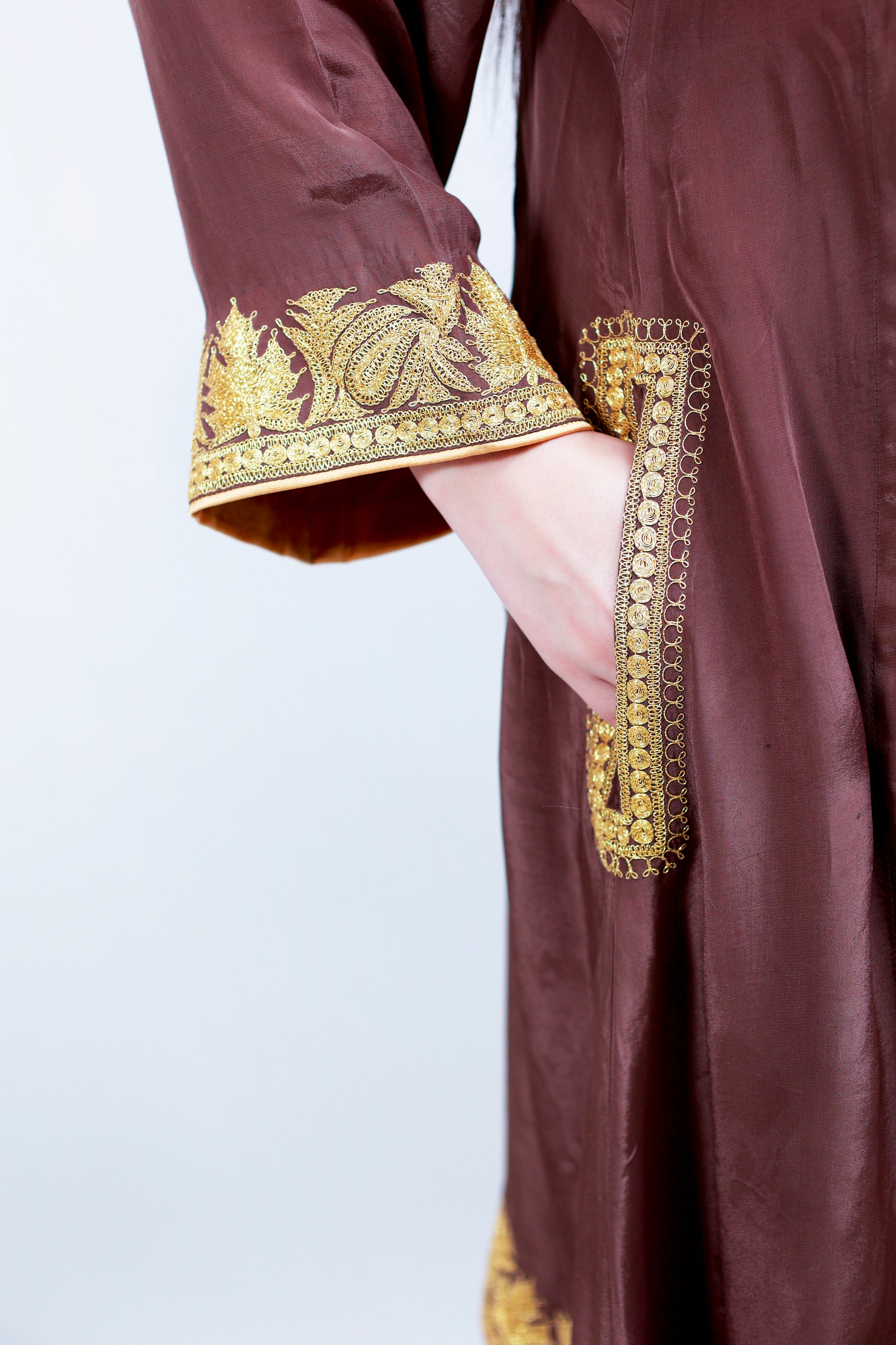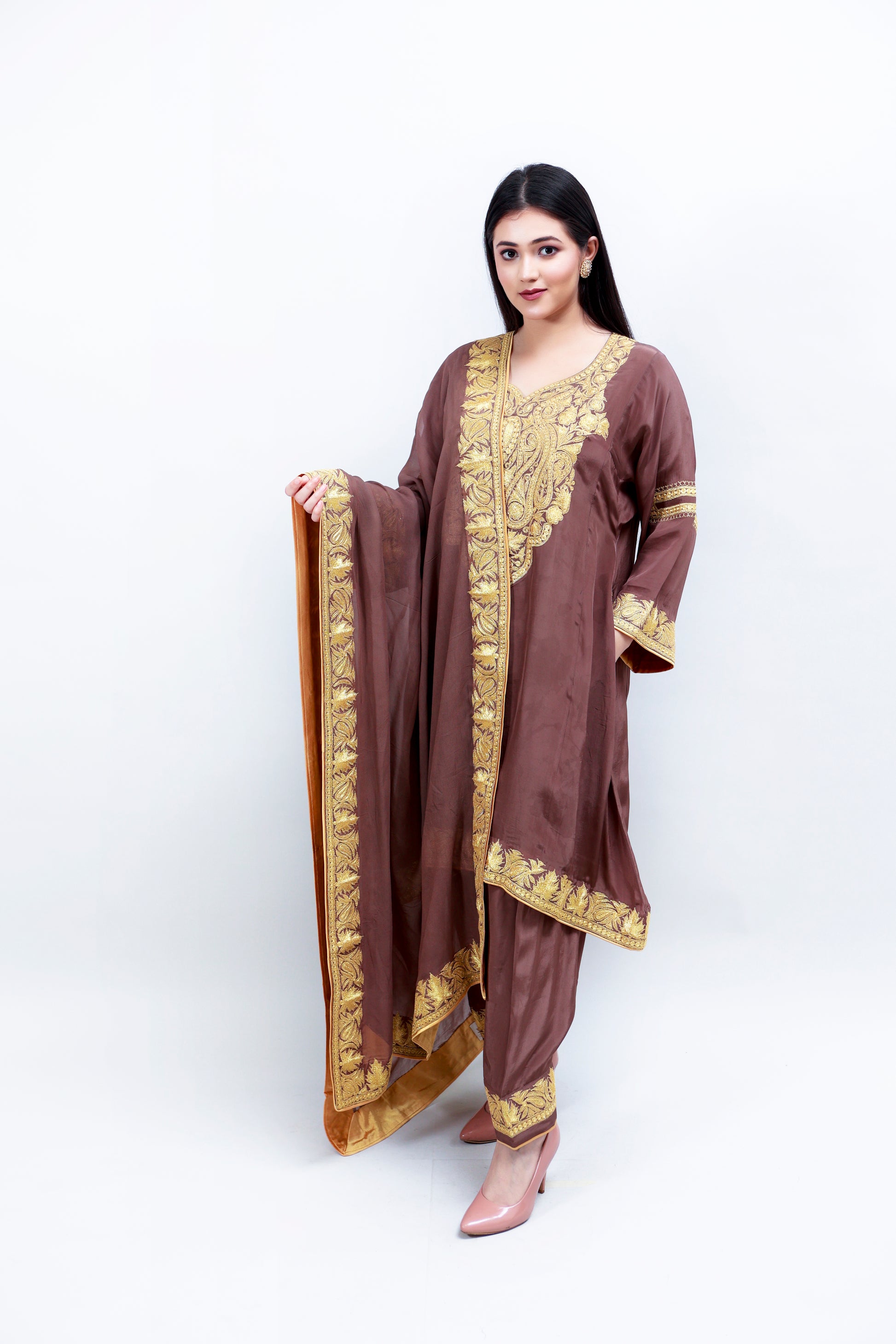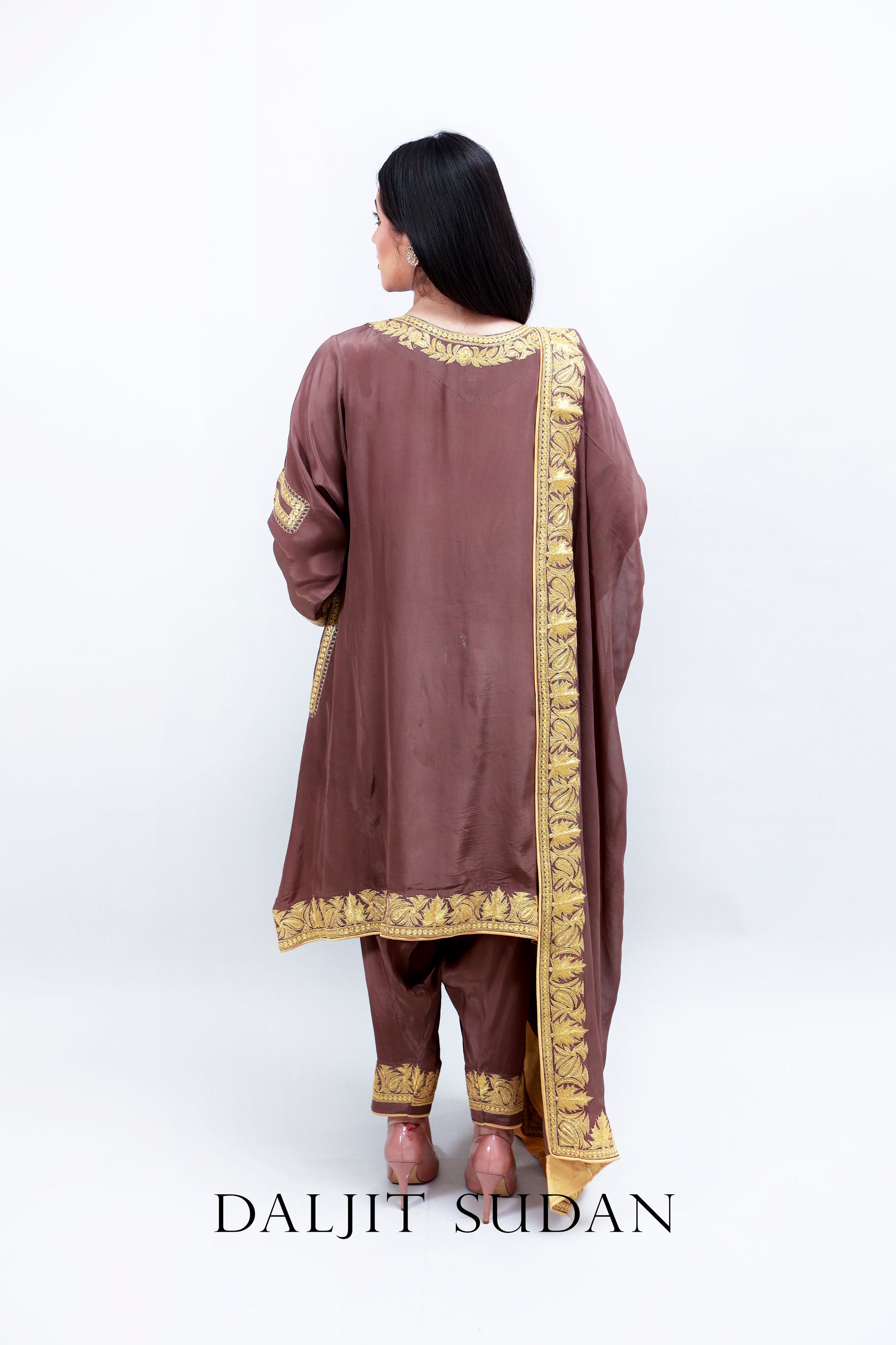 Werge Brown Crepe Suit with Tilla machine embroidery.