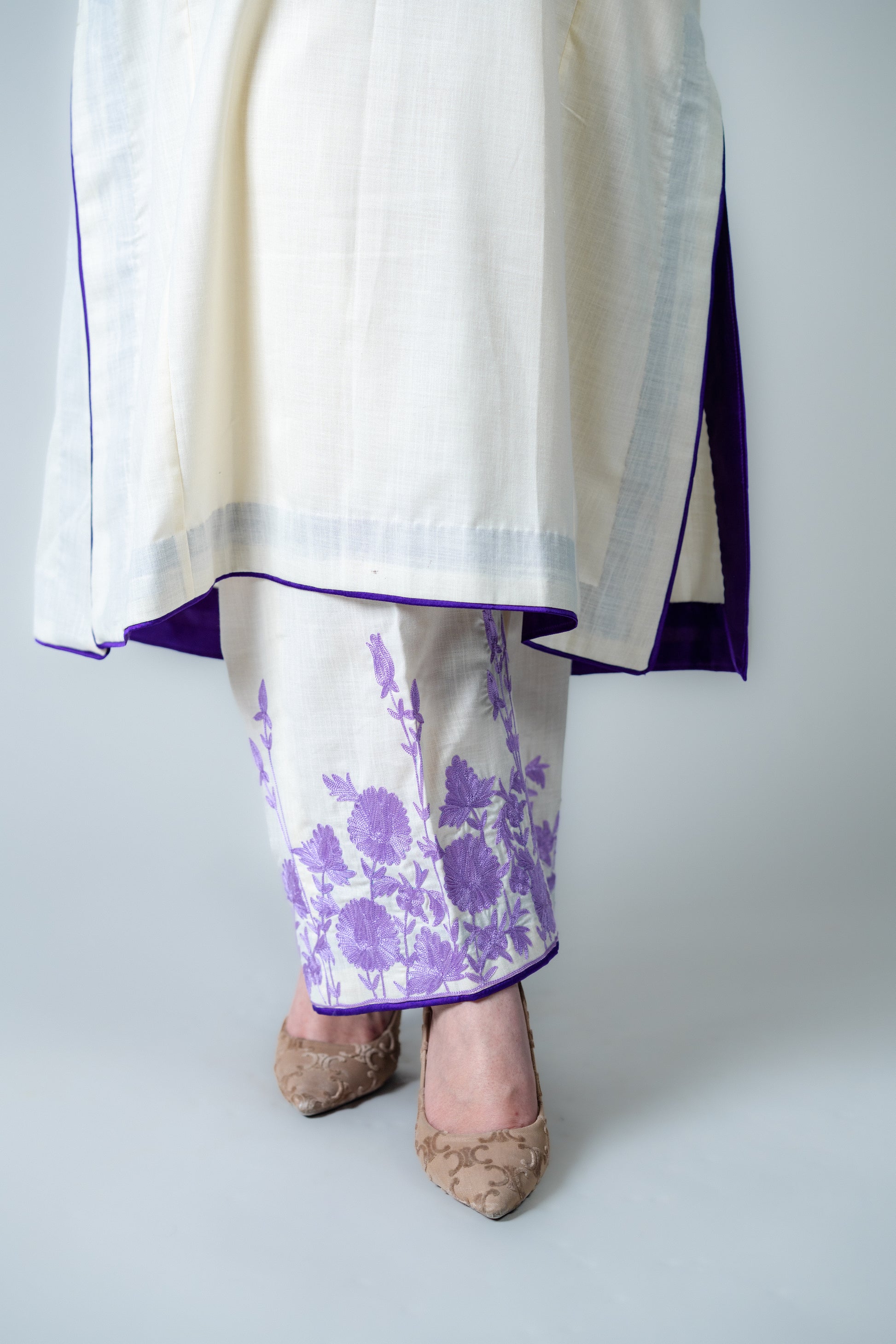 Off White Cotton Phiran Set With Purple Aari Embroidery