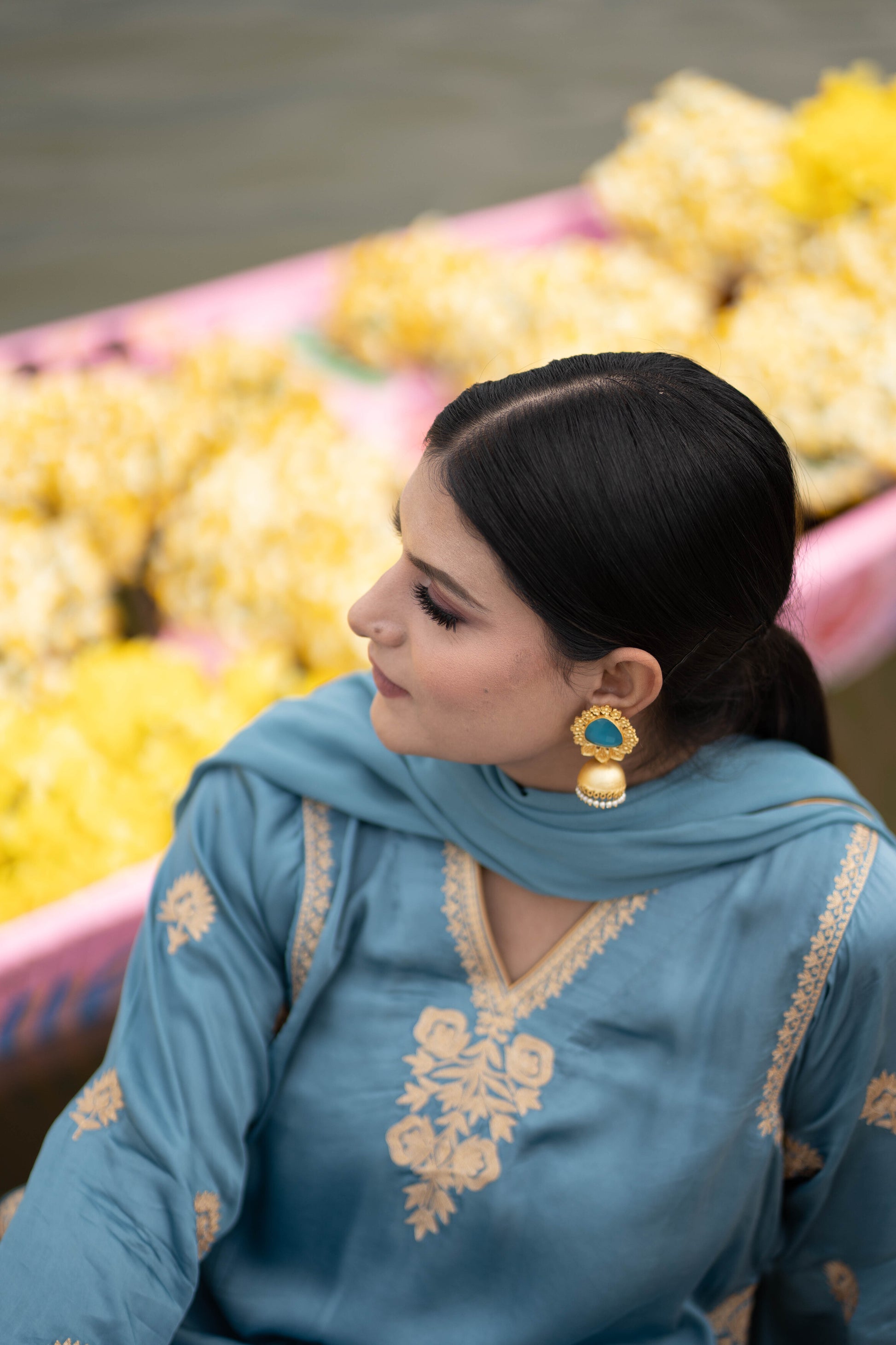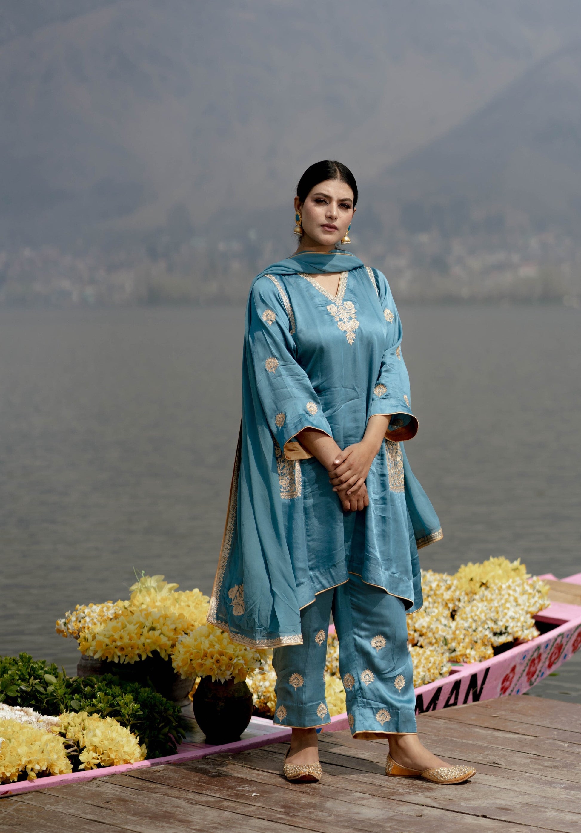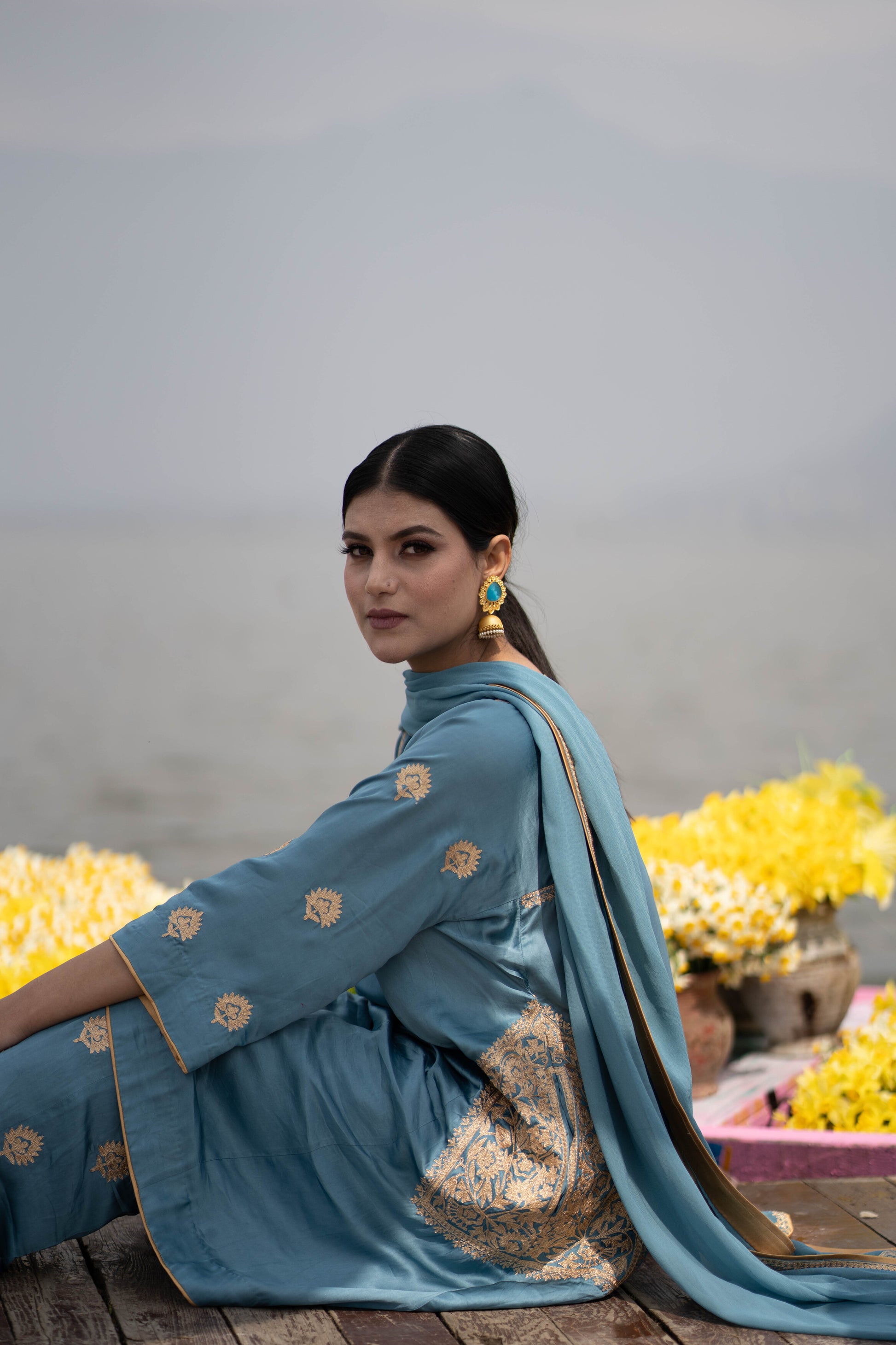 Blue Grotto German Satin Phiran Suit with Tilla Aari machine embroidery.