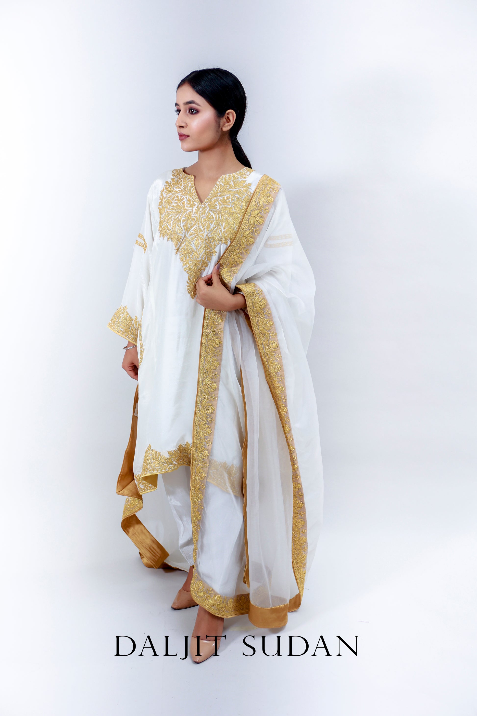 White Tilla Crepe Suit with Tilla machine embroidery.