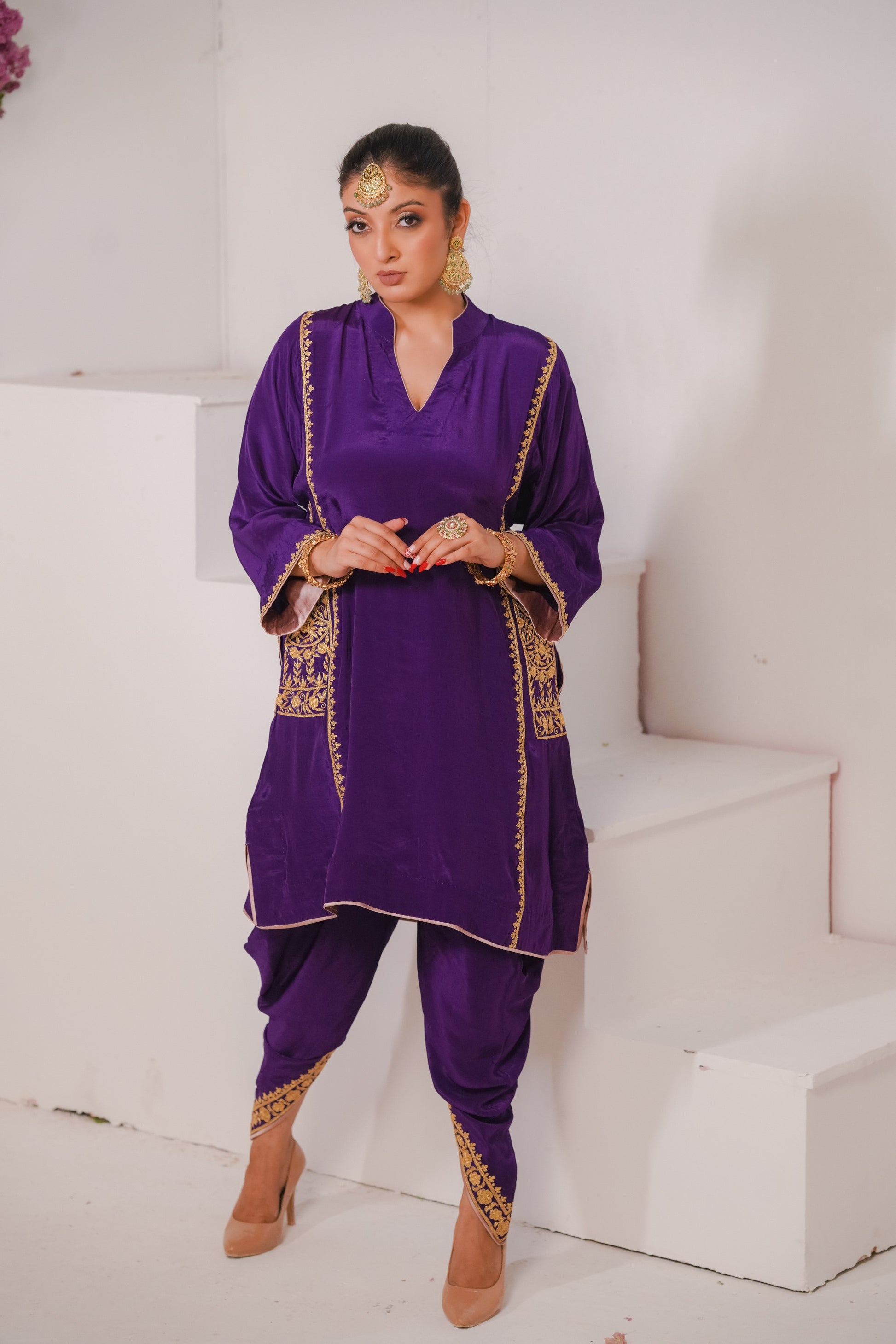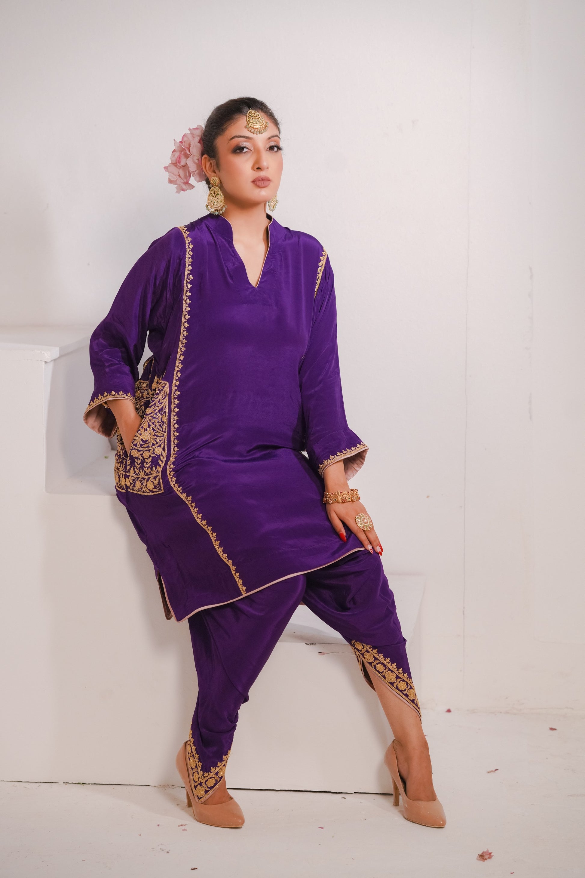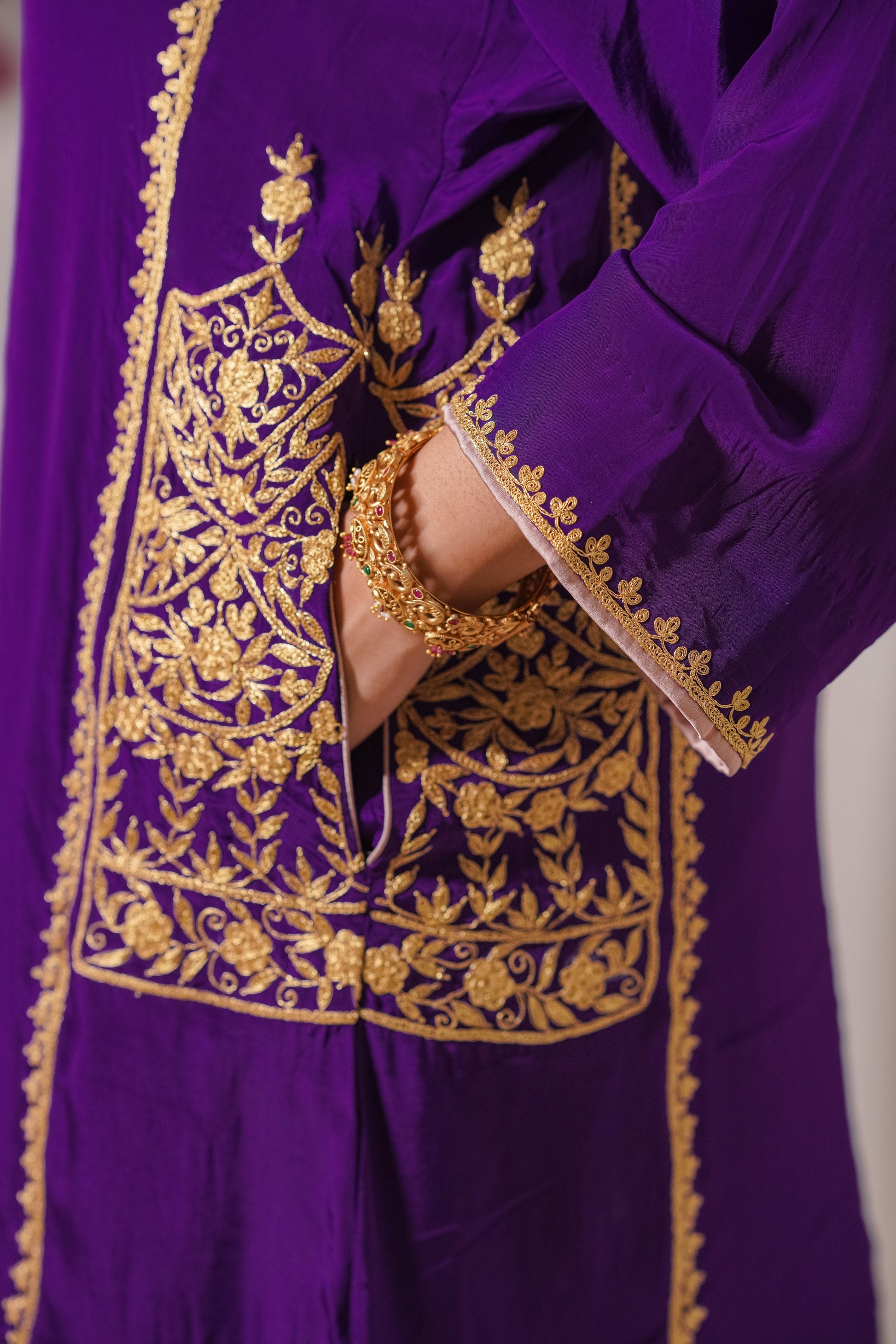 Purple Crepe phiran with pants embellished with kashmiri tilla embroidery.