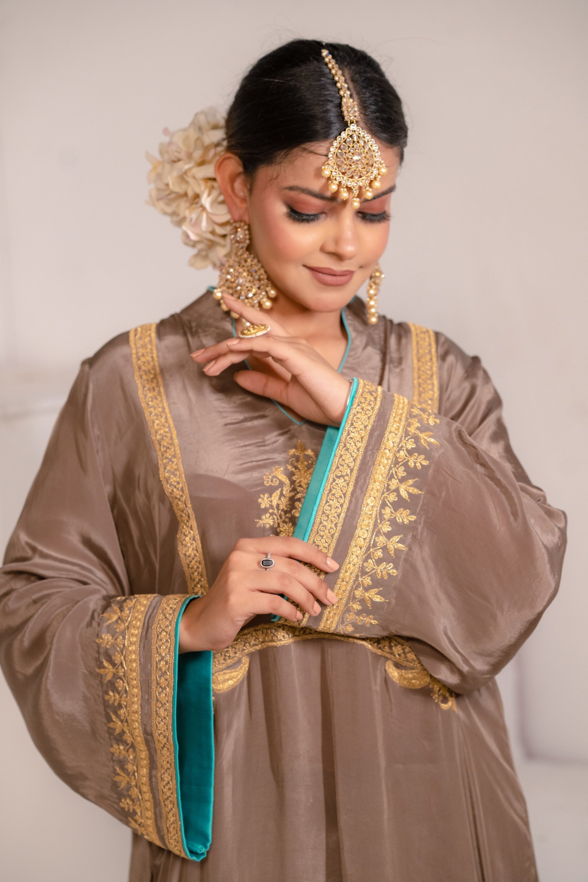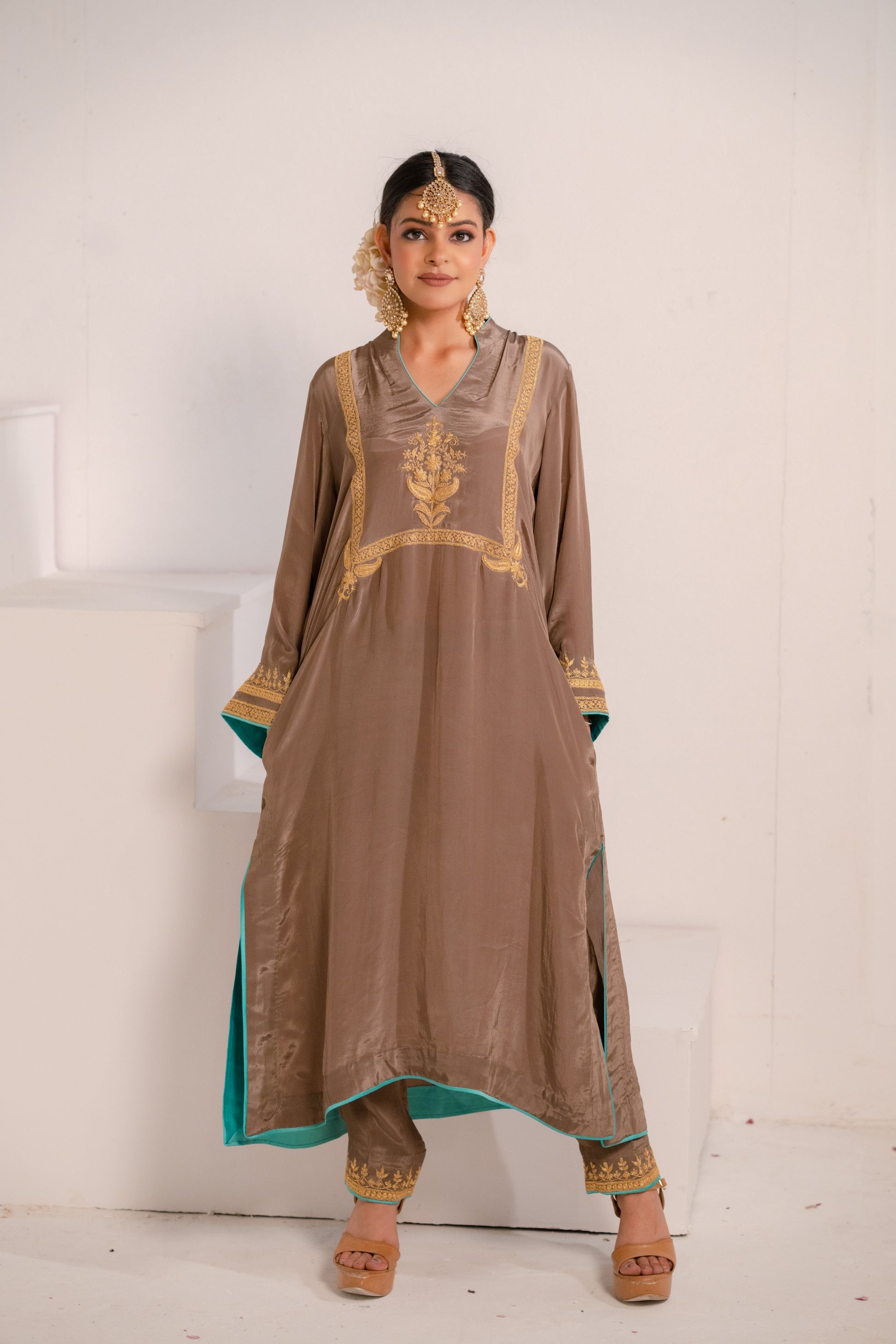 Grey crepe phiran with pants embellished with kashmiri tilla embroidery.