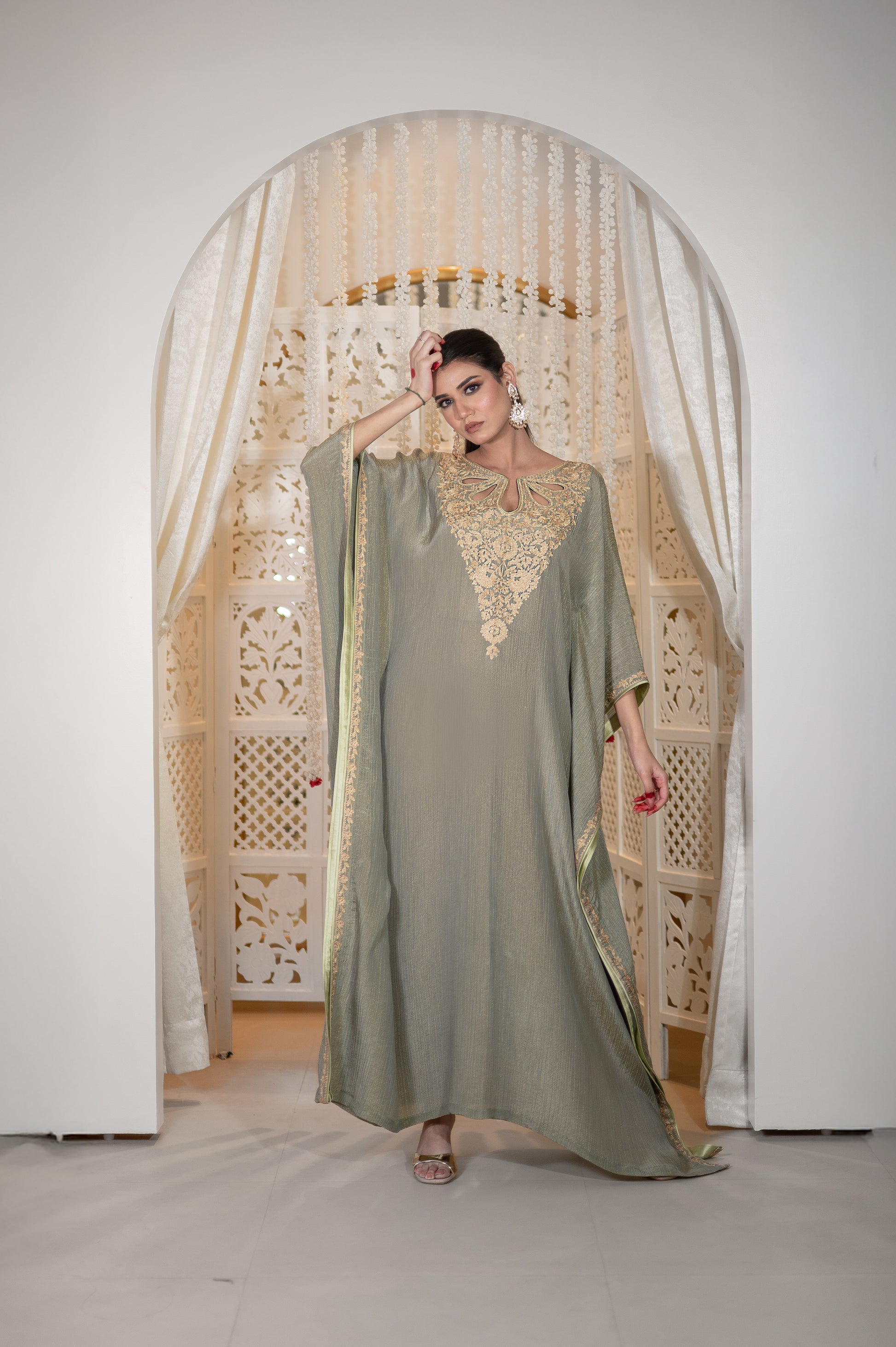 Grey crushed tissue kaftan comes with a Cotton slip.