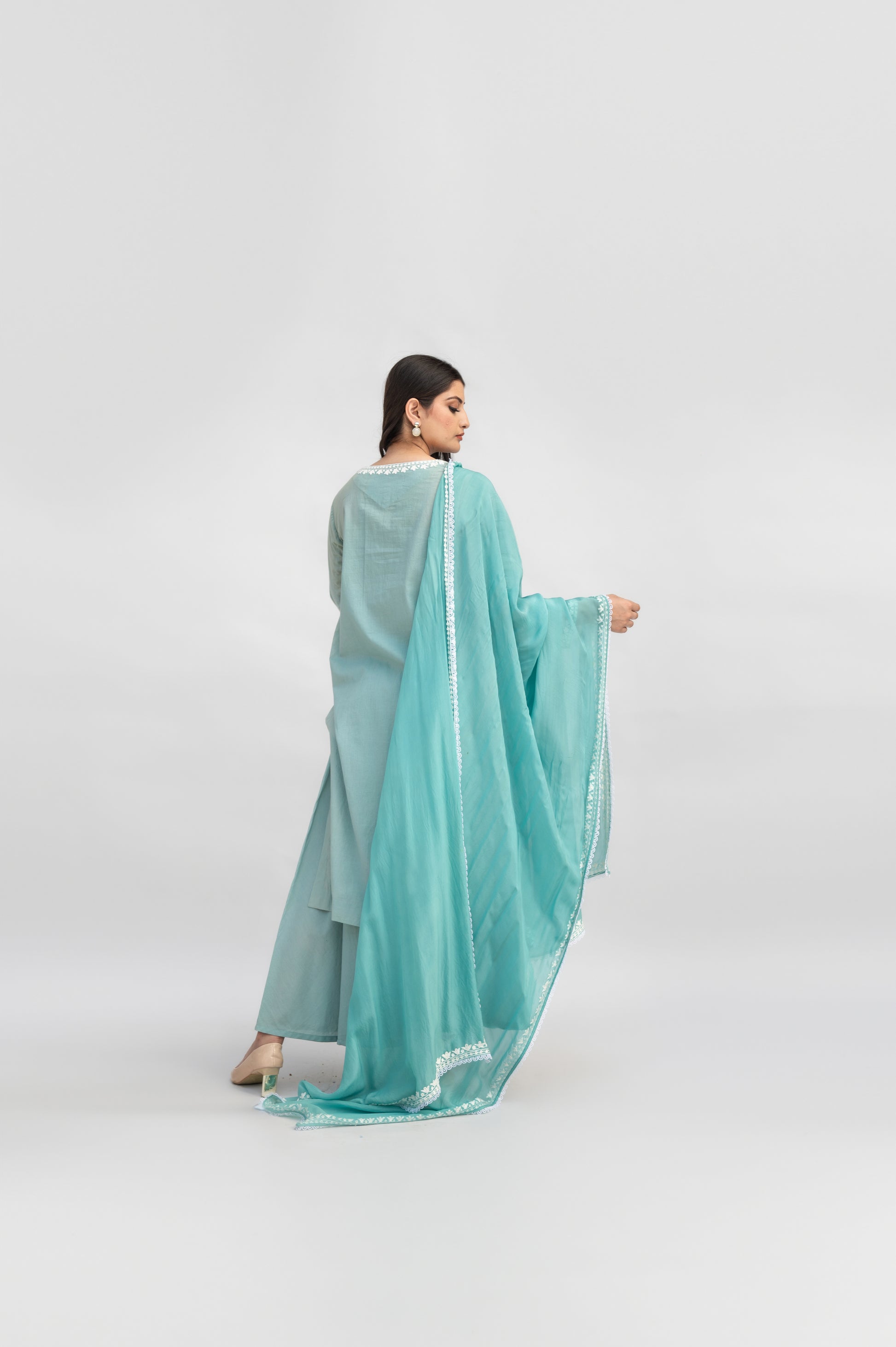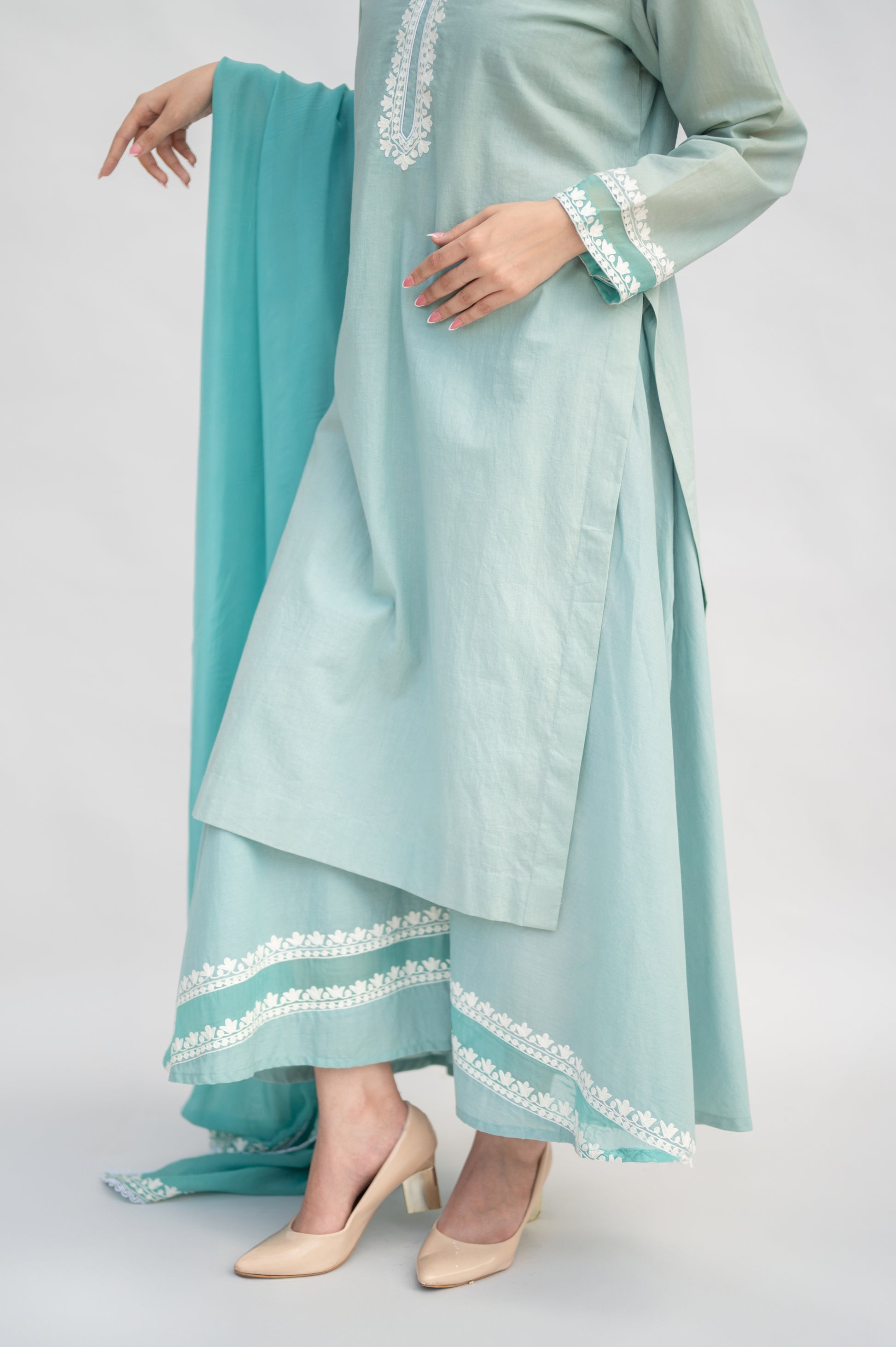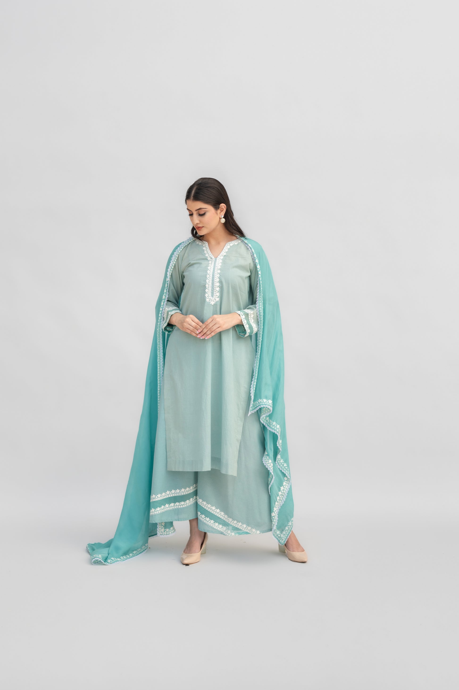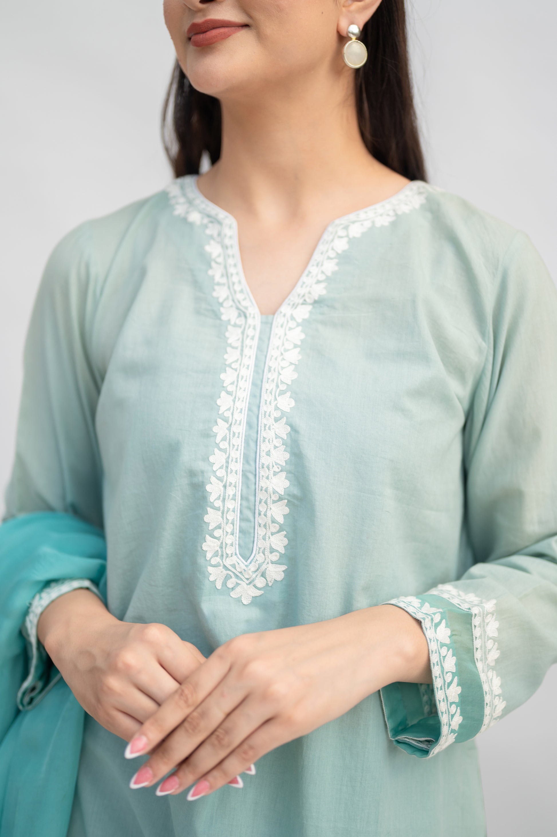 Light Teal Mulmul Suit: a fusion of comfort and sophistication, crafted in premium mulmul and adorned with intricate Kashmiri Aari Embroidery.