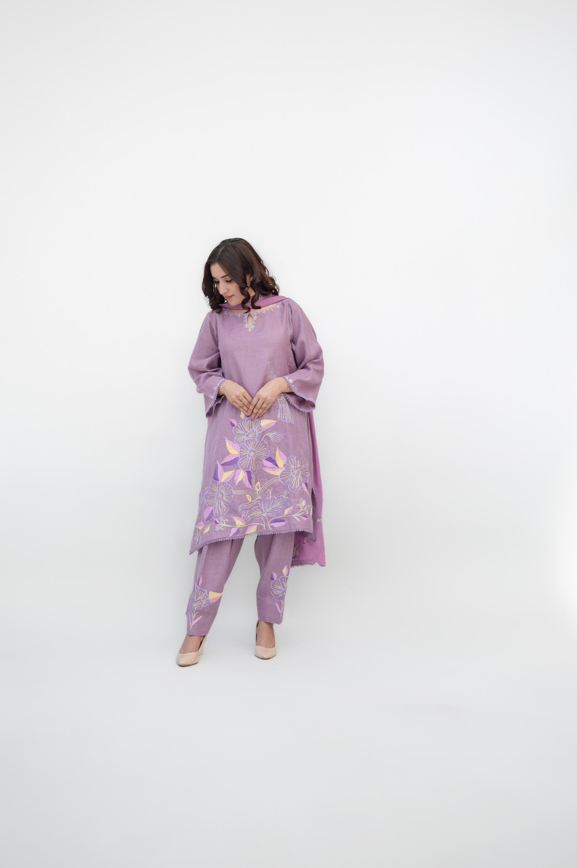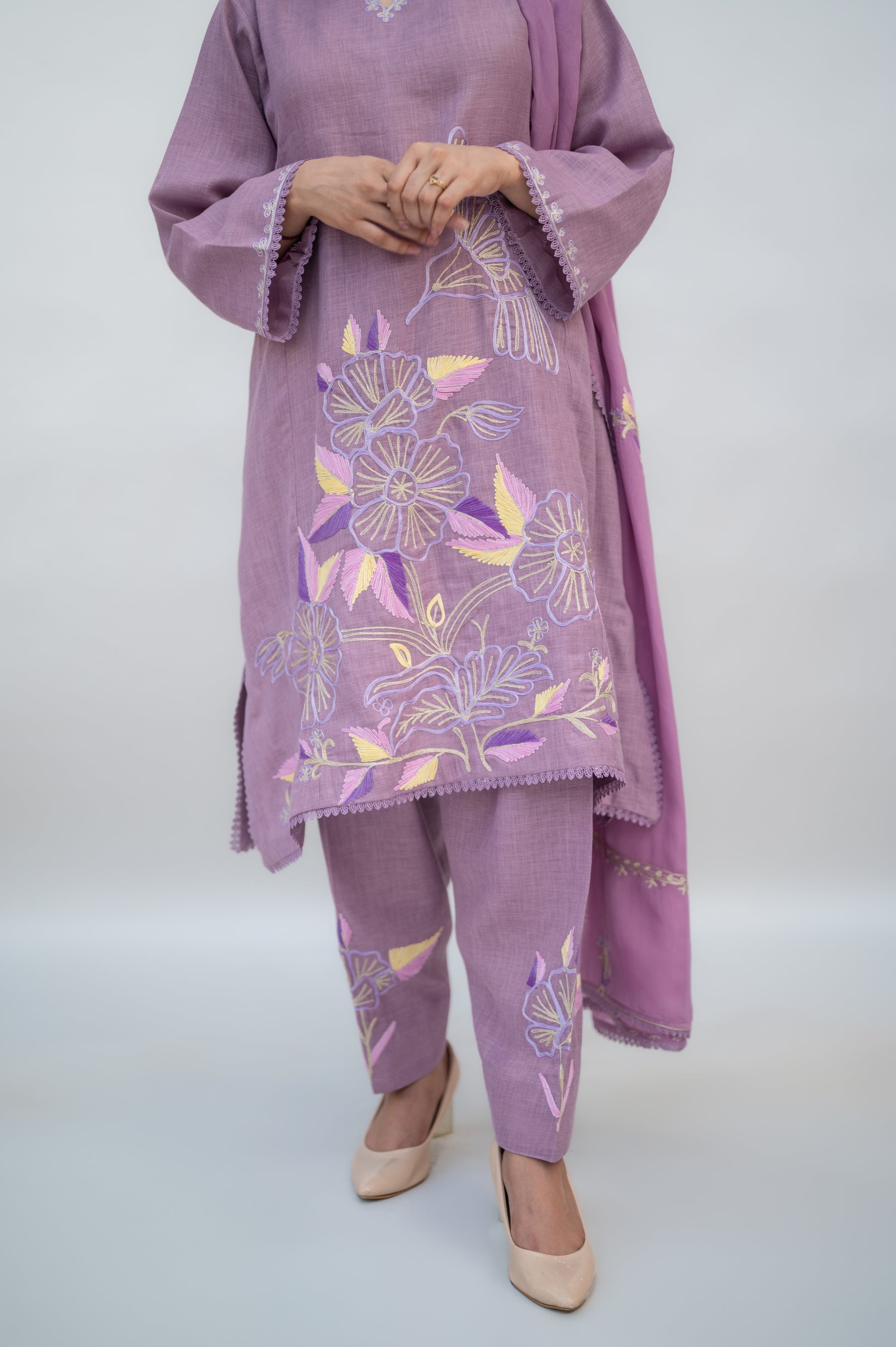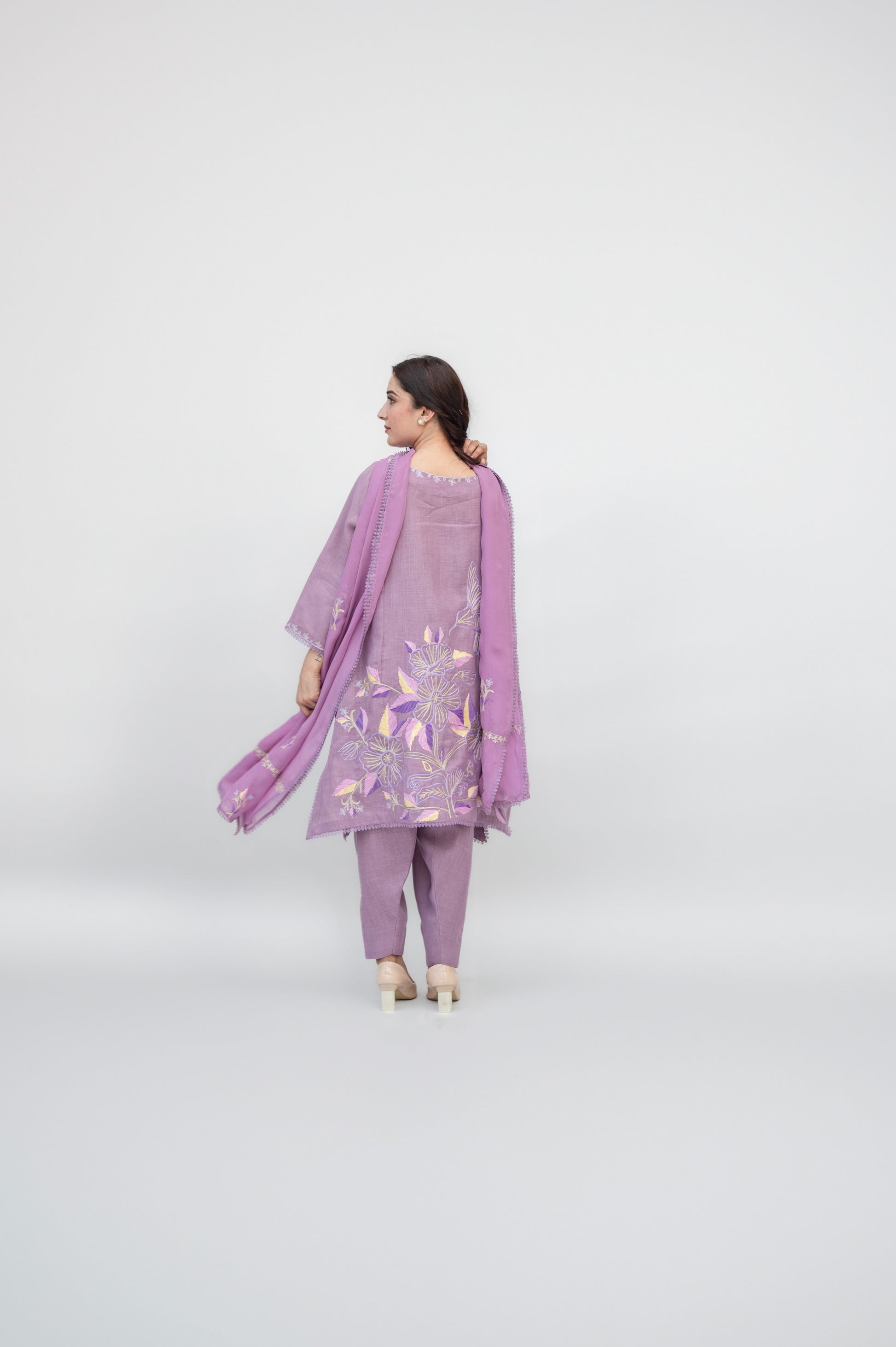 Lilac Linen Suit: a fusion of comfort and sophistication, crafted in premium linen and adorned with intricate Kashmiri Aari & Tilla Embroidery.