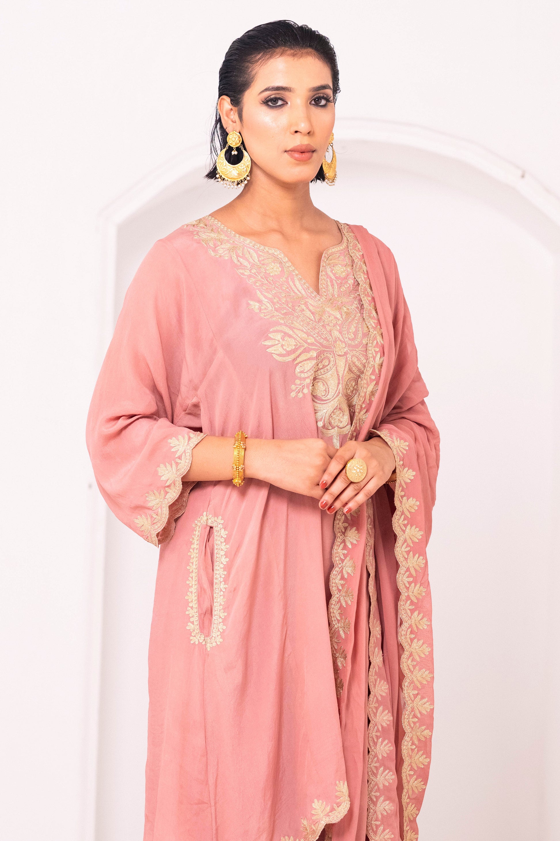 Pink crepe phiran suit with Kashmiri sari embroidery.
