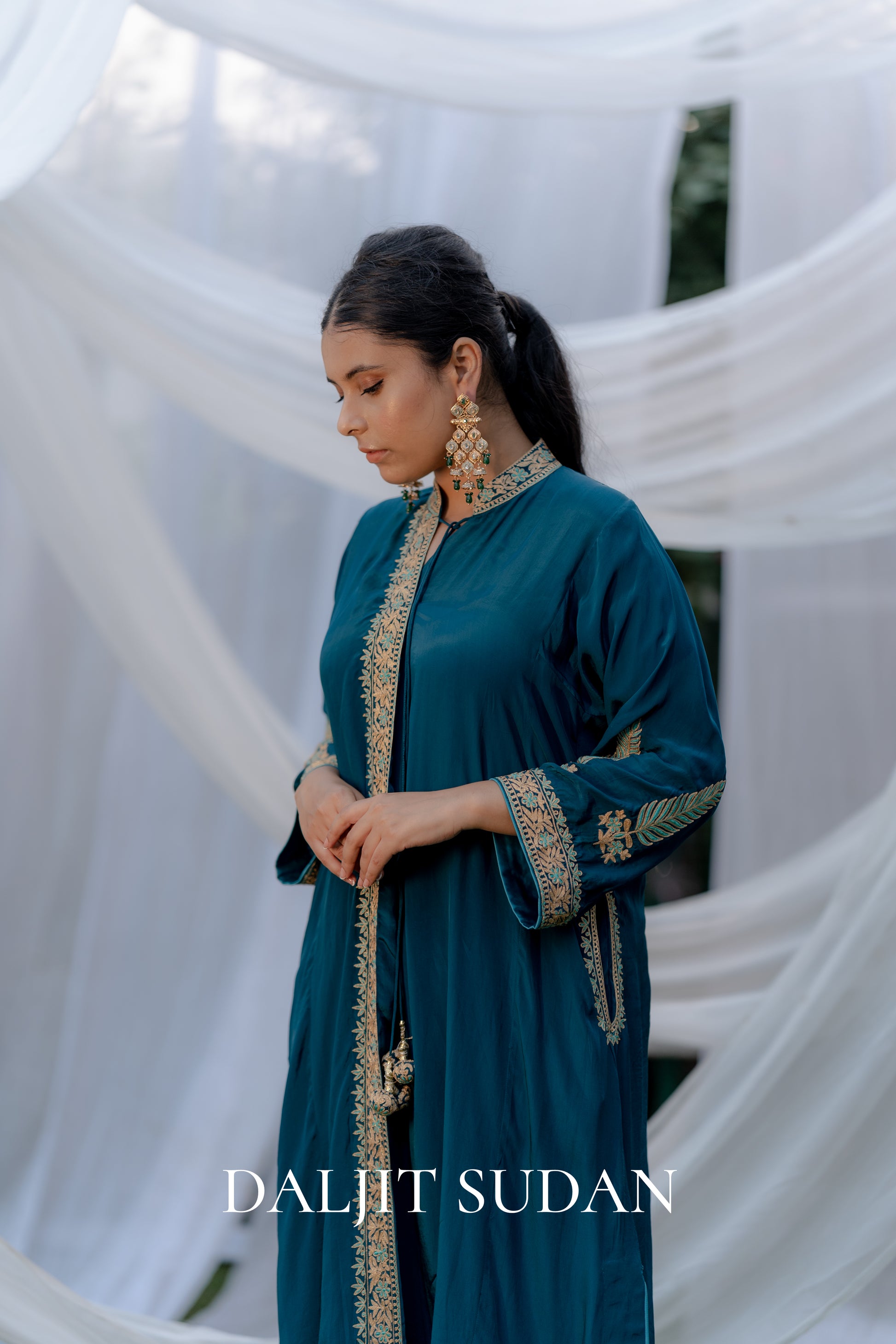 Peacock blue set with Kashmiri aari thread embroidery.