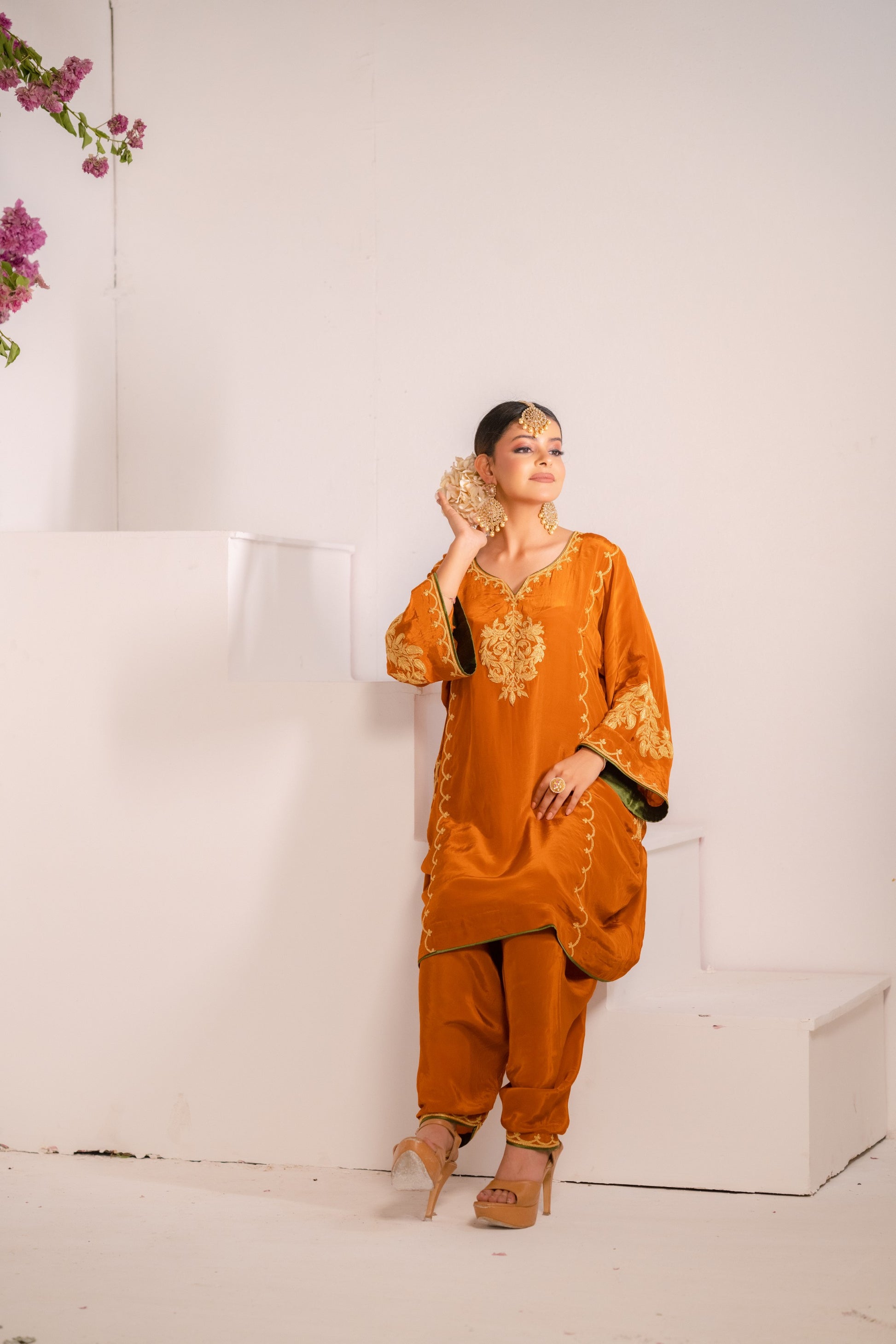 Rust Orange Crepe phiran with pants embellished with kashmiri tilla embroidery.