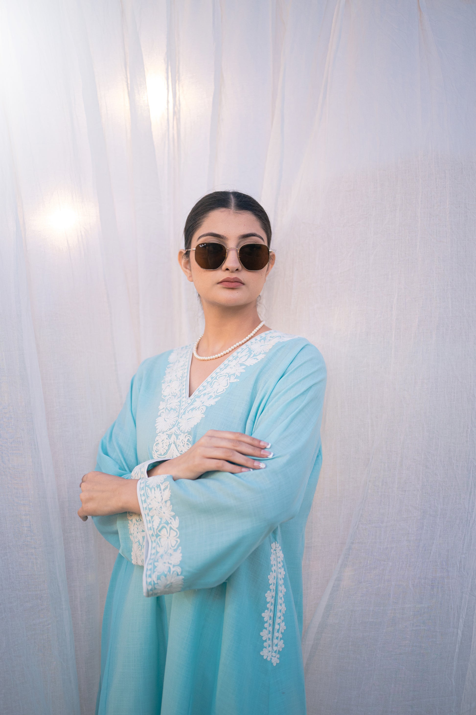 A soft and airy sky-blue matka cotton phiran, adorned with intricate Aari embroidery for an elegant appeal.