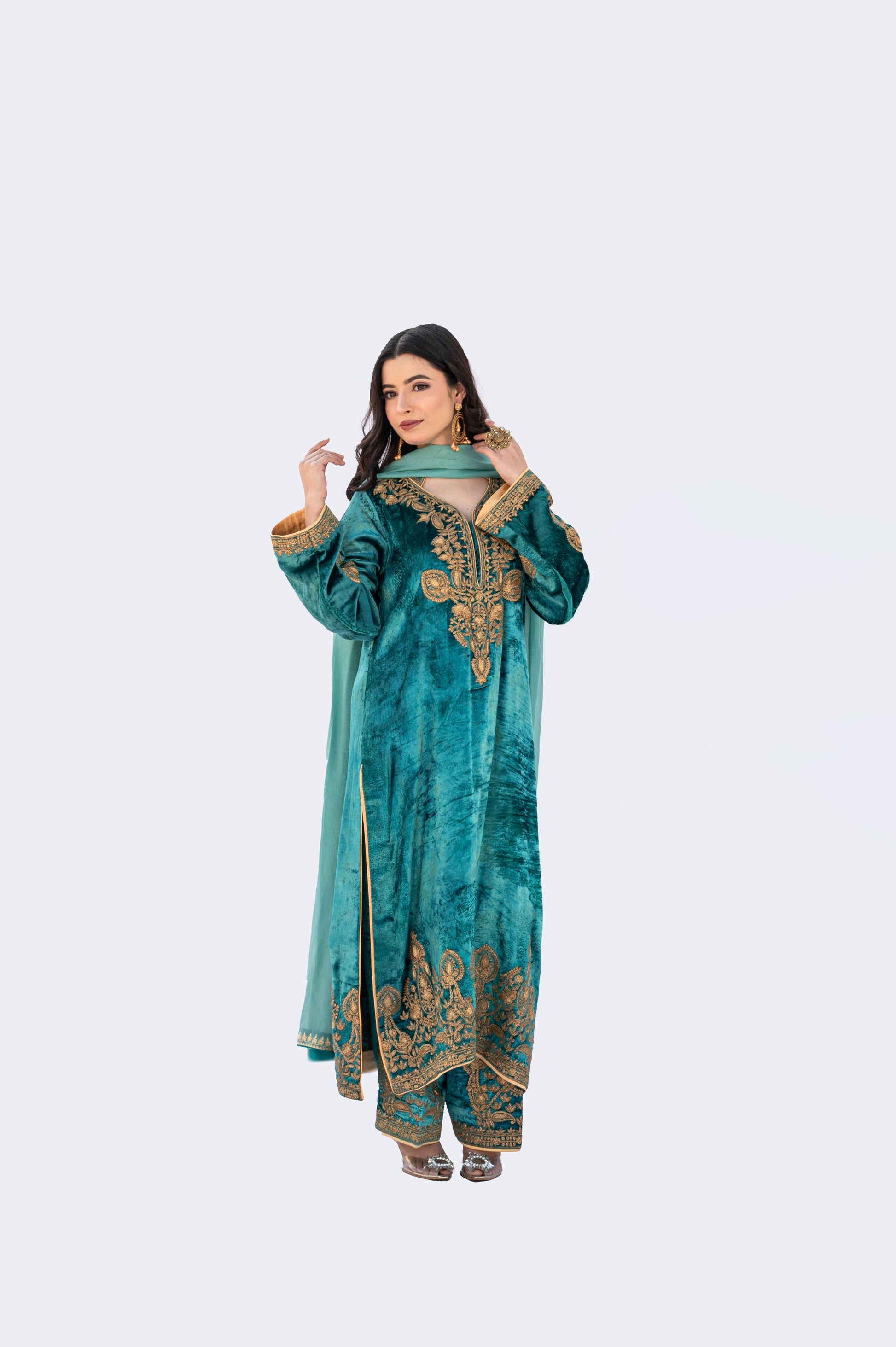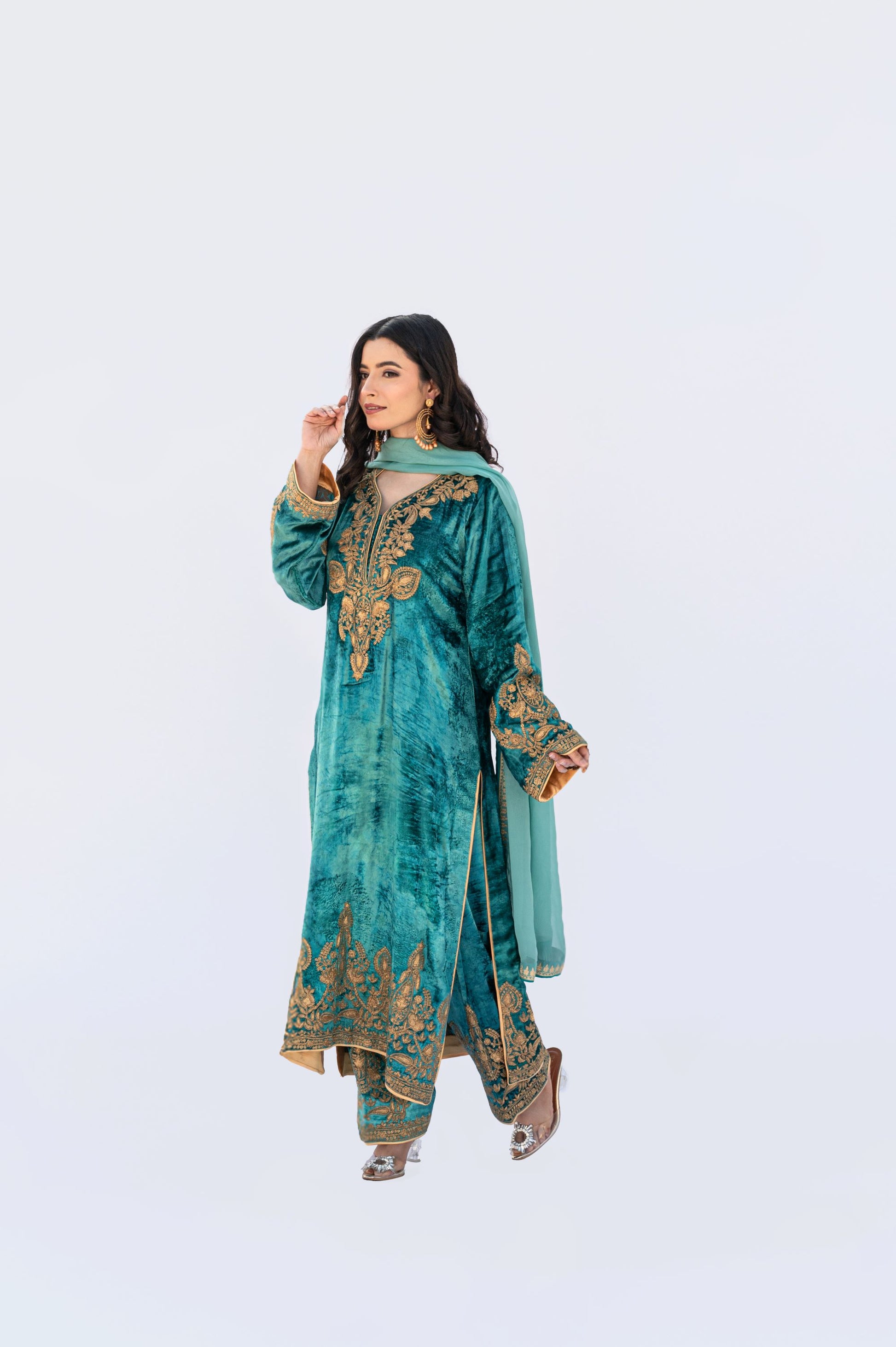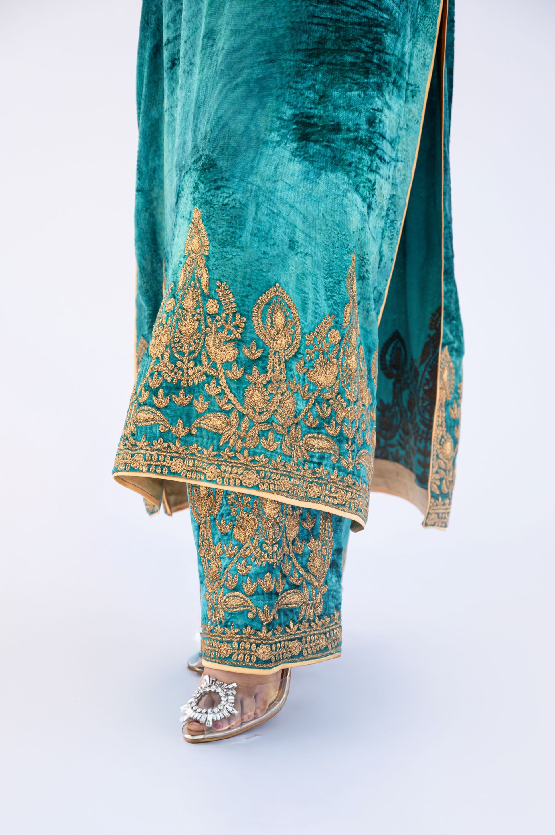 Add elegance and tradition to your wardrobe with this teal shaneel velvet suit, perfect for weddings and festive occasions!