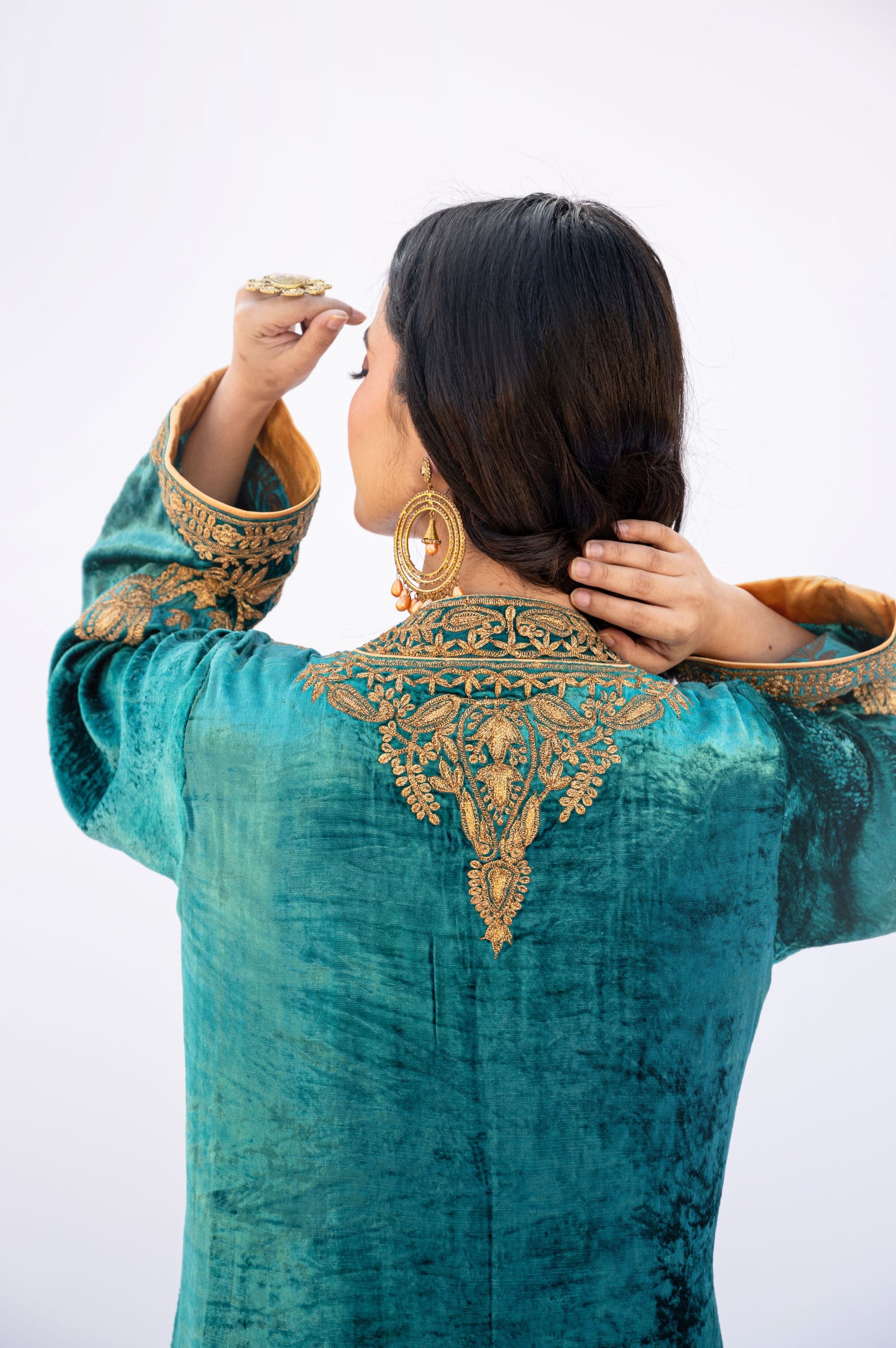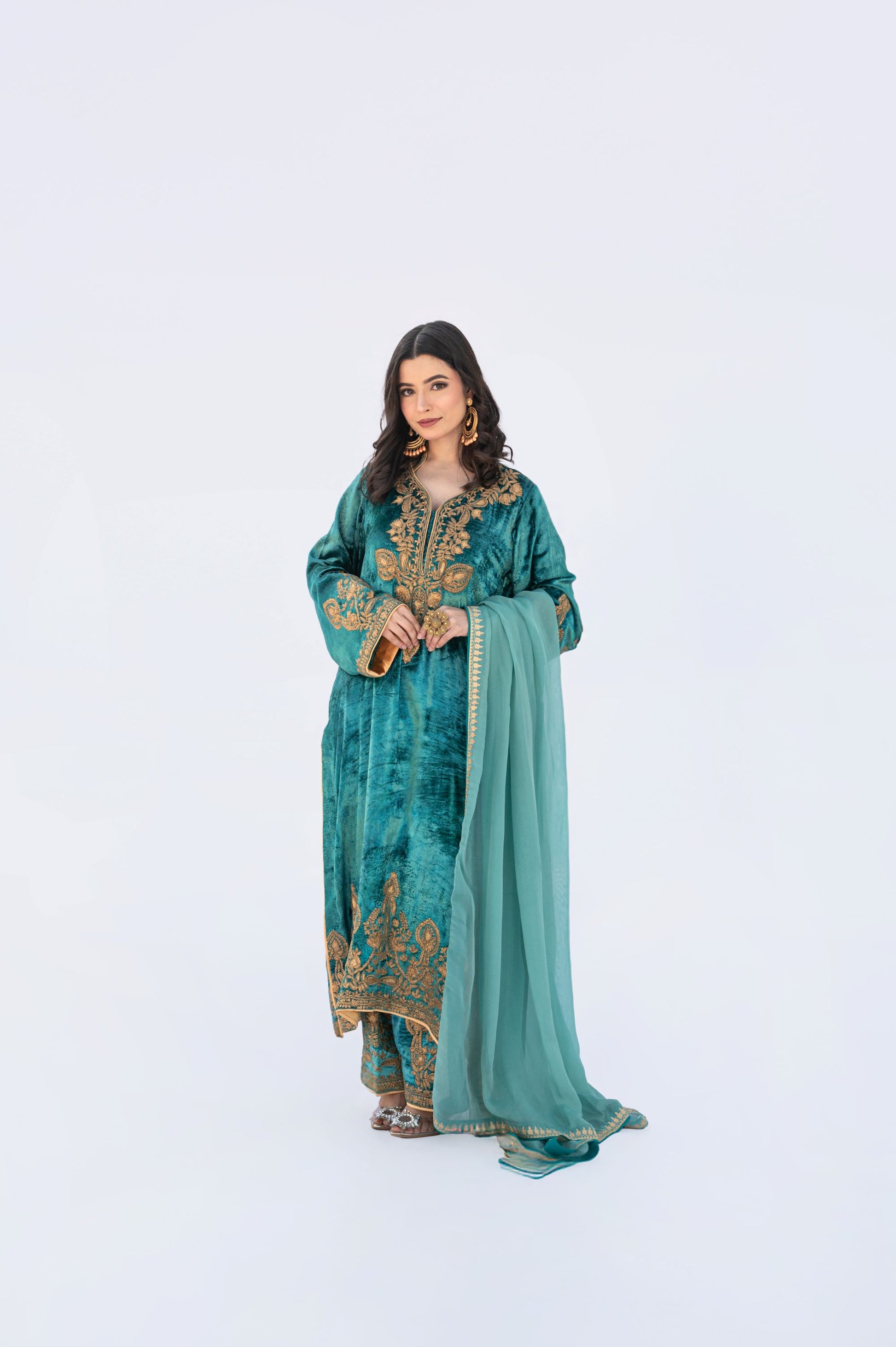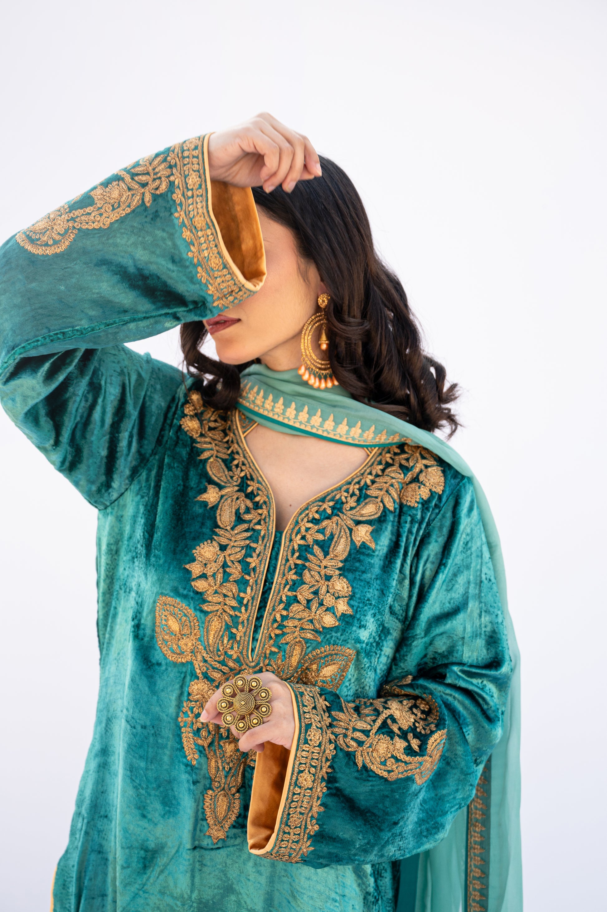 Add elegance and tradition to your wardrobe with this teal shaneel velvet suit, perfect for weddings and festive occasions!