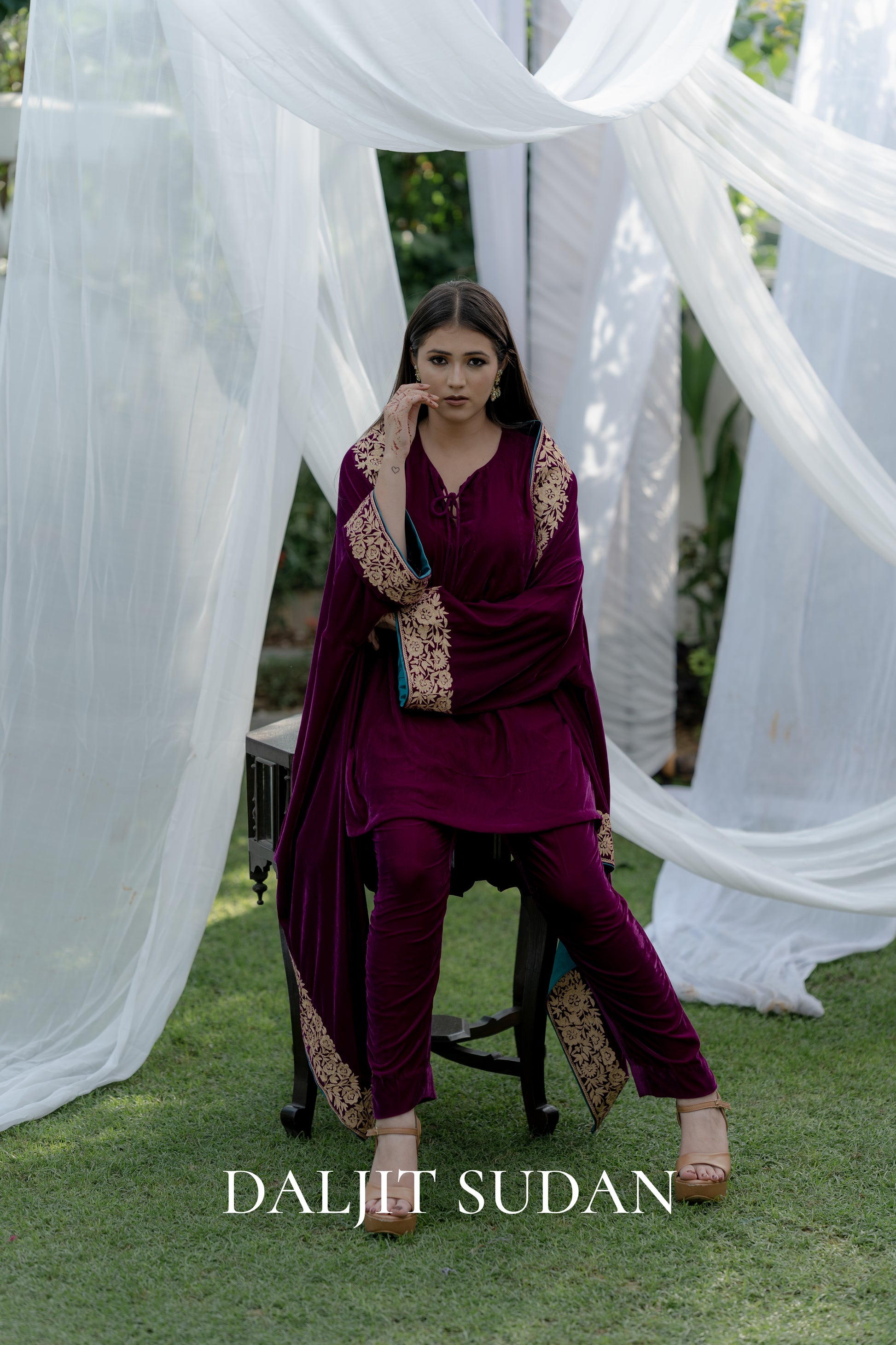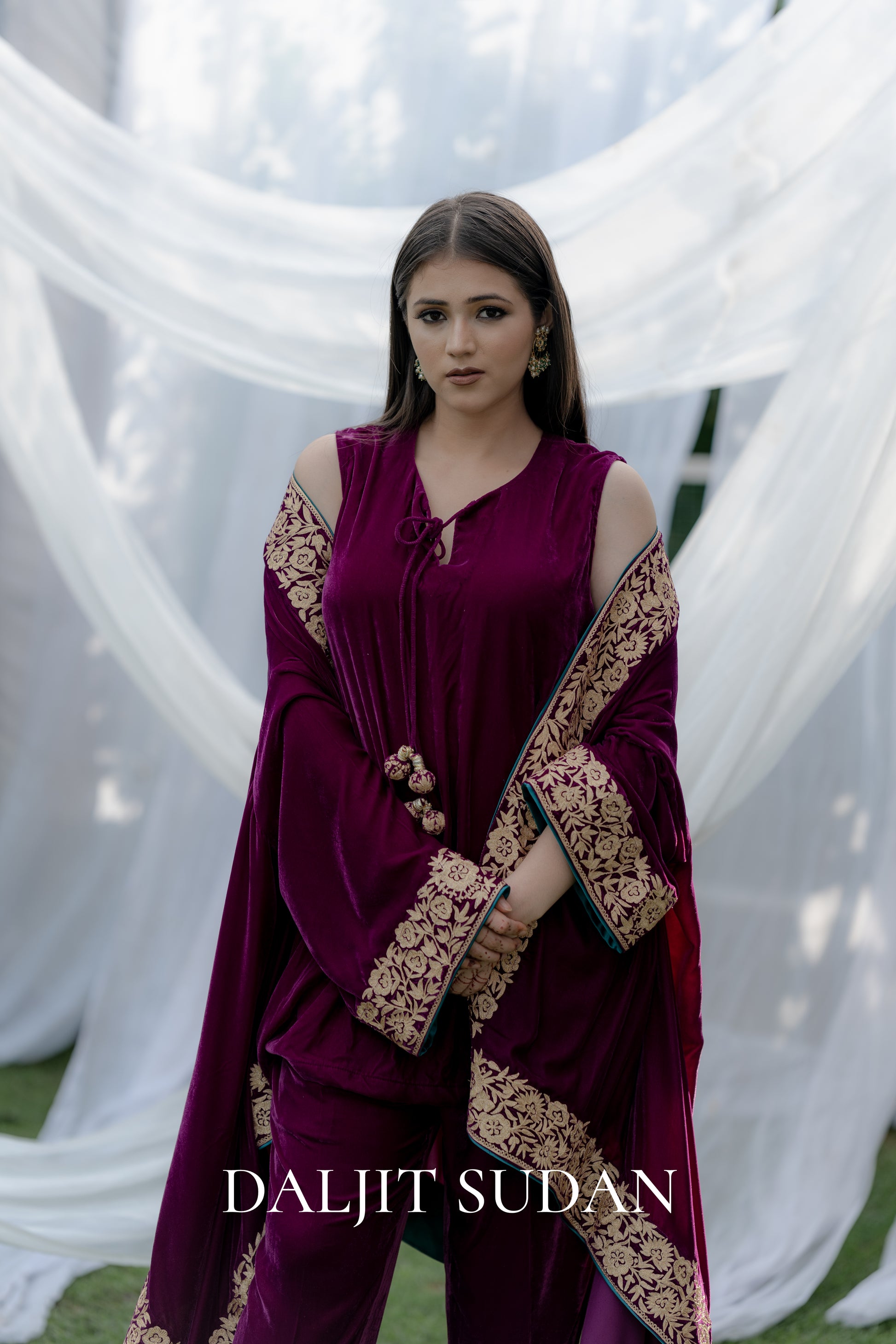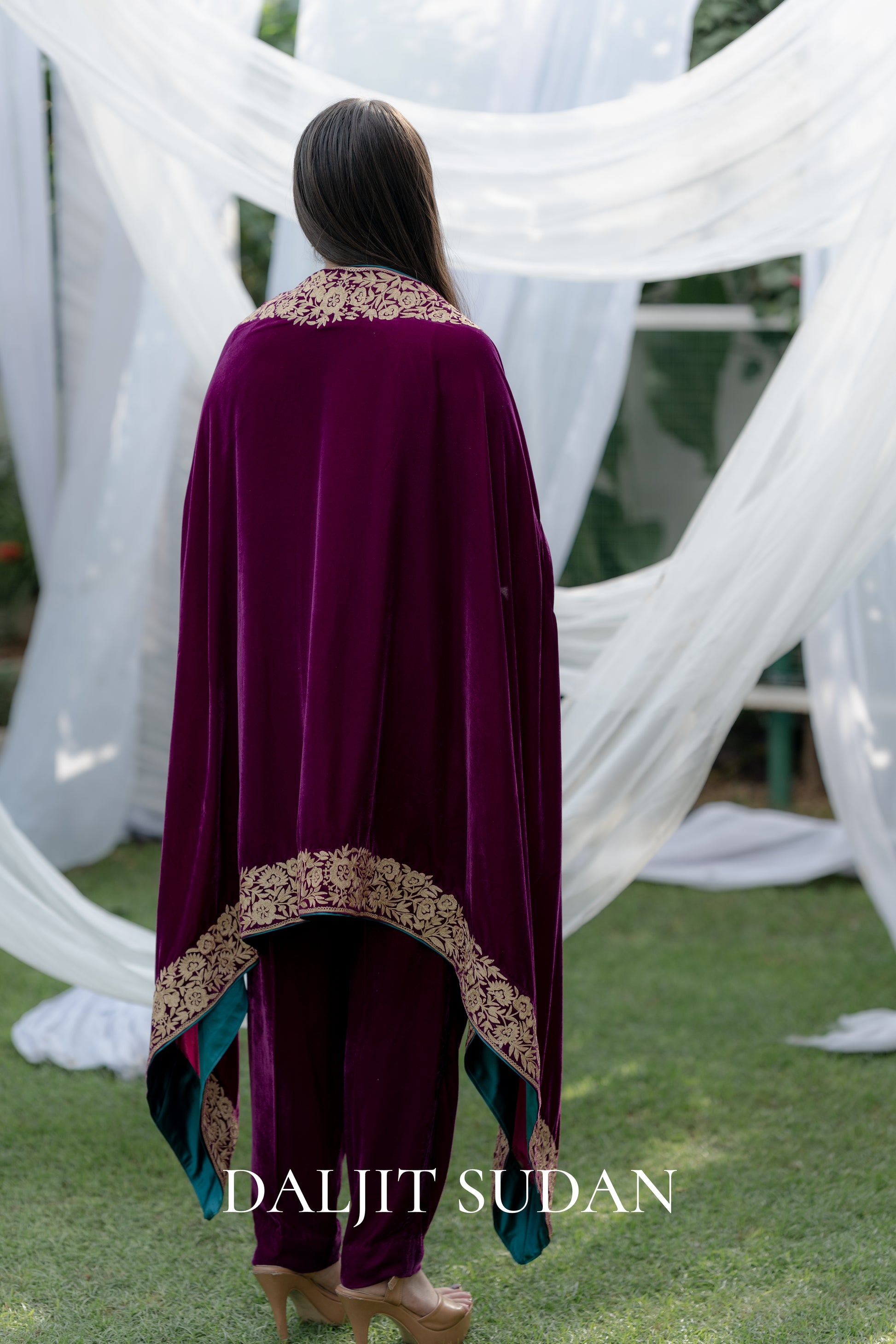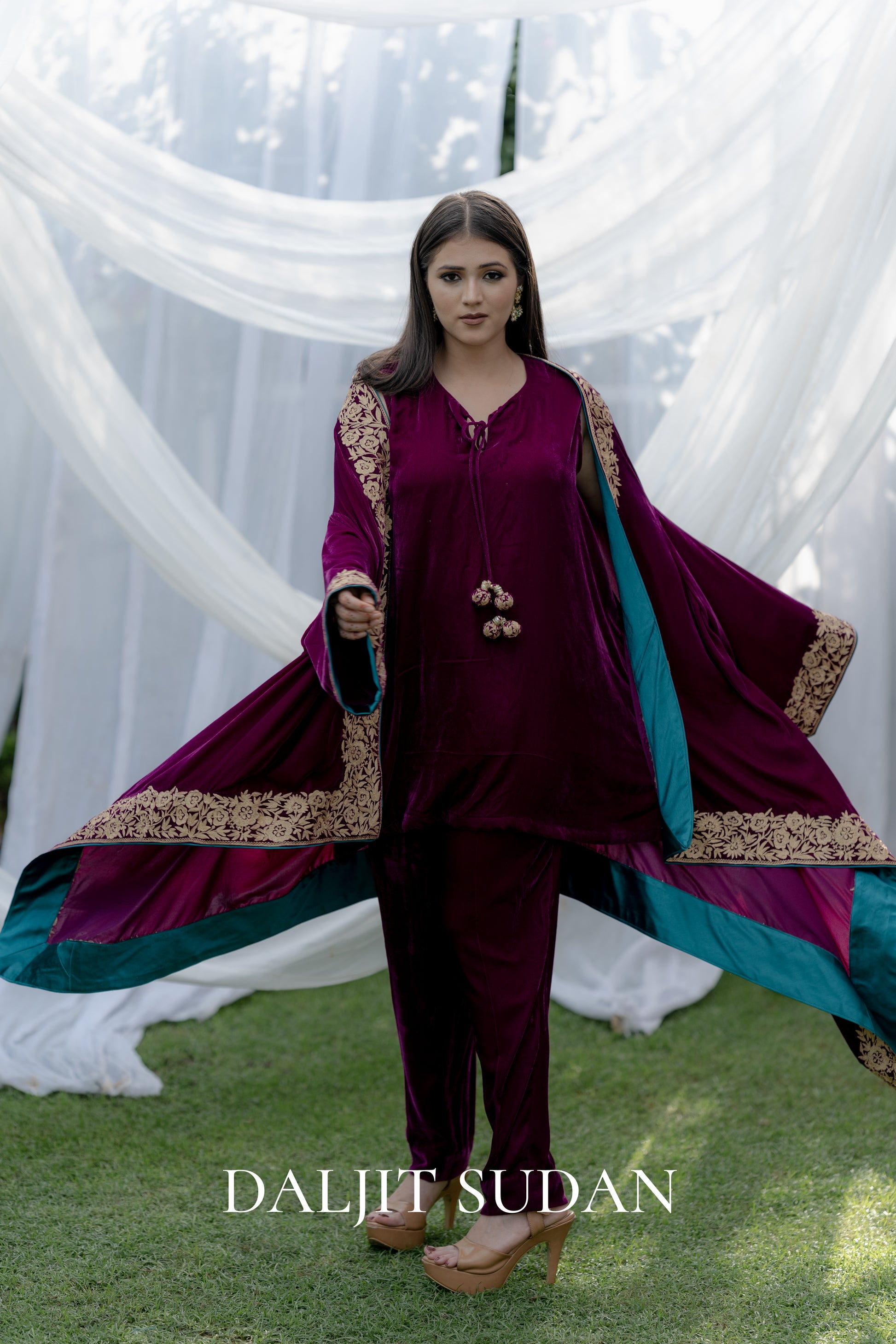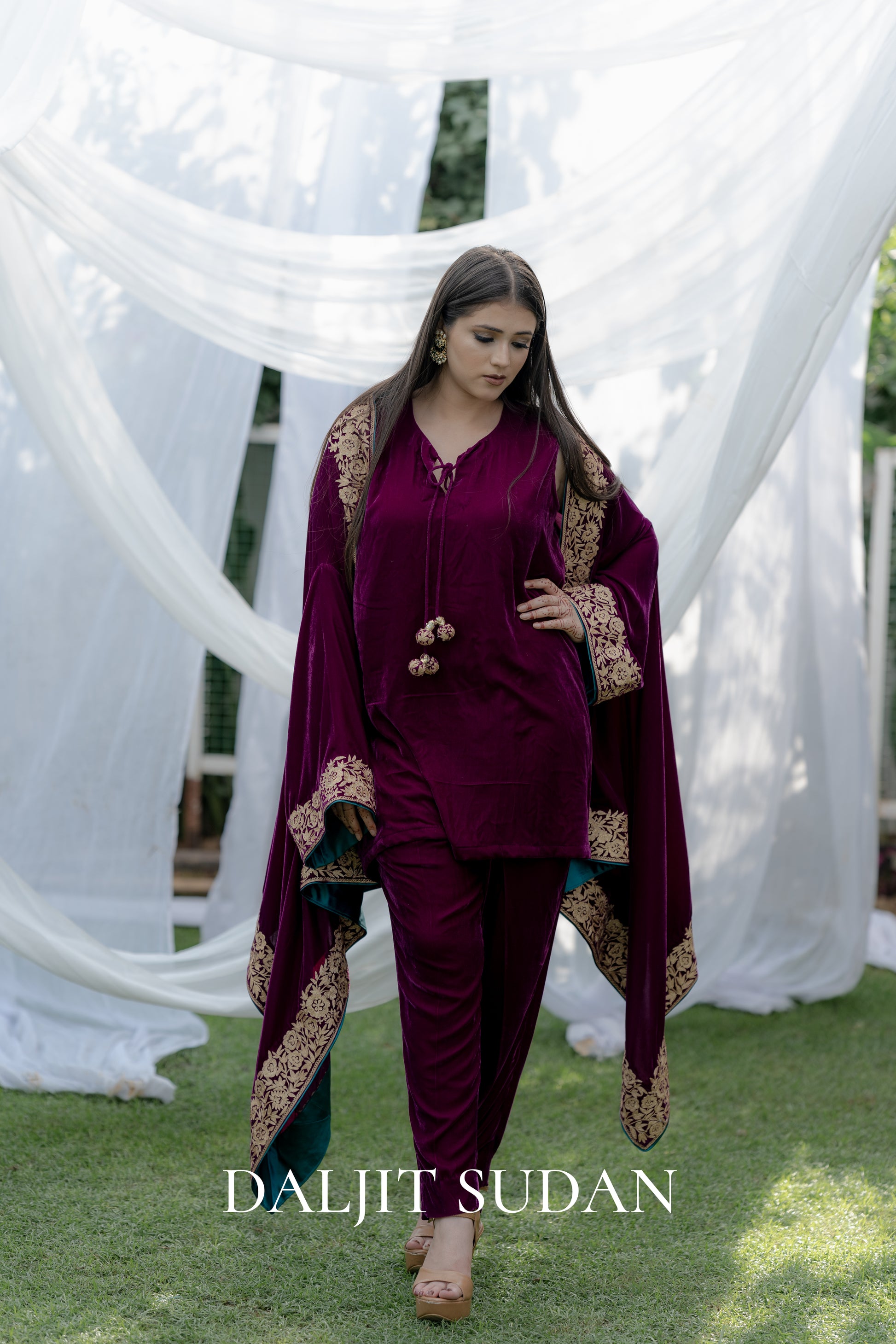 Wine velvet set with kimono cape with Kashmiri tilla embroidery.